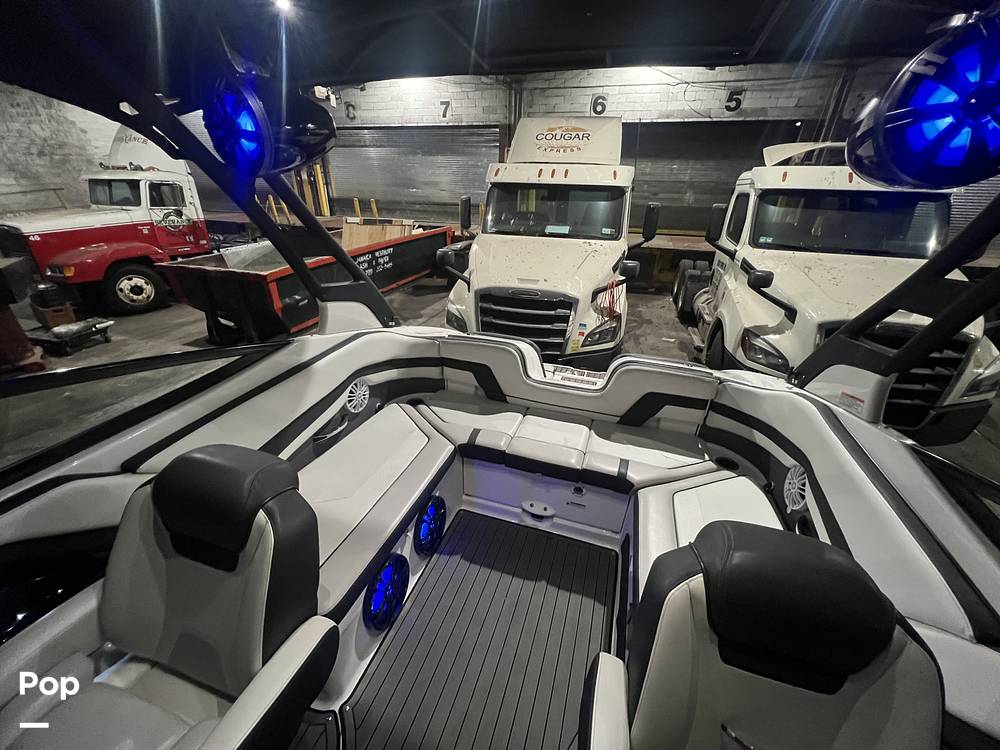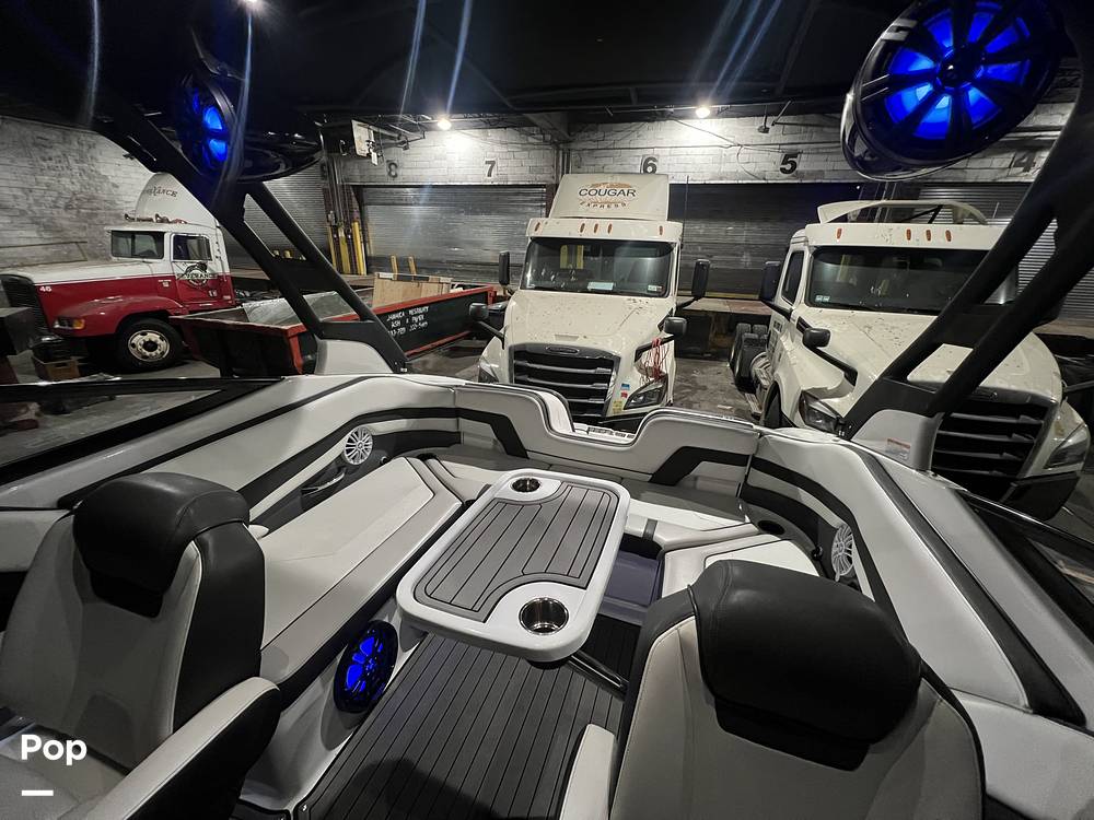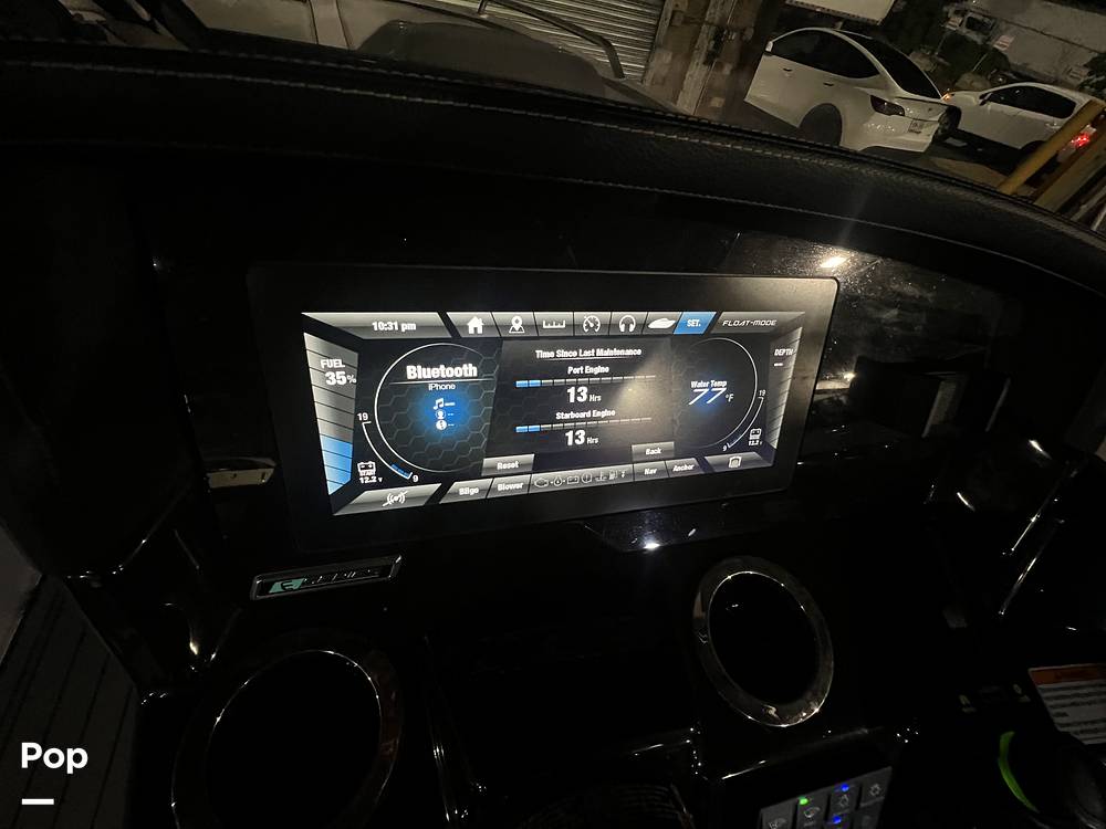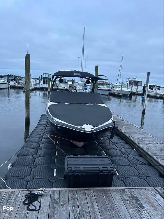 Included in the sale are a dual-axle trailer with brakes, bow and stern covers, anchor, removable table, and filler bow cushions. This boat also features a premium stereo upgrade, including two LED subwoofers, six upgraded speakers, two Kicker LED wakeboard tower speakers, an 8-channel amplifier with a dedicated mono subwoofer amplifier, and Dynamat sound-deadening for clean, vibration-free audio. A third battery and 100% copper 0 AWG wiring with a Wet Sounds distribution block. Bluetooth, USB, and equalizer controls are conveniently located at both the helm and the swim platform for easy access.
