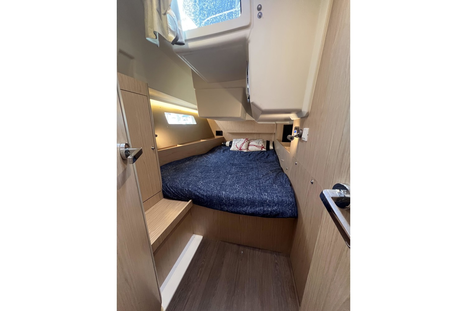 Below deck, you'll find a bright, open interior with generous headroom, finely finished woodwork, and thoughtful layout. The large salon and fully equipped galley are perfect for entertaining, while the private cabins offer the comfort of home. Large hull windows flood the interior with natural light and provide beautiful views of your surroundings.