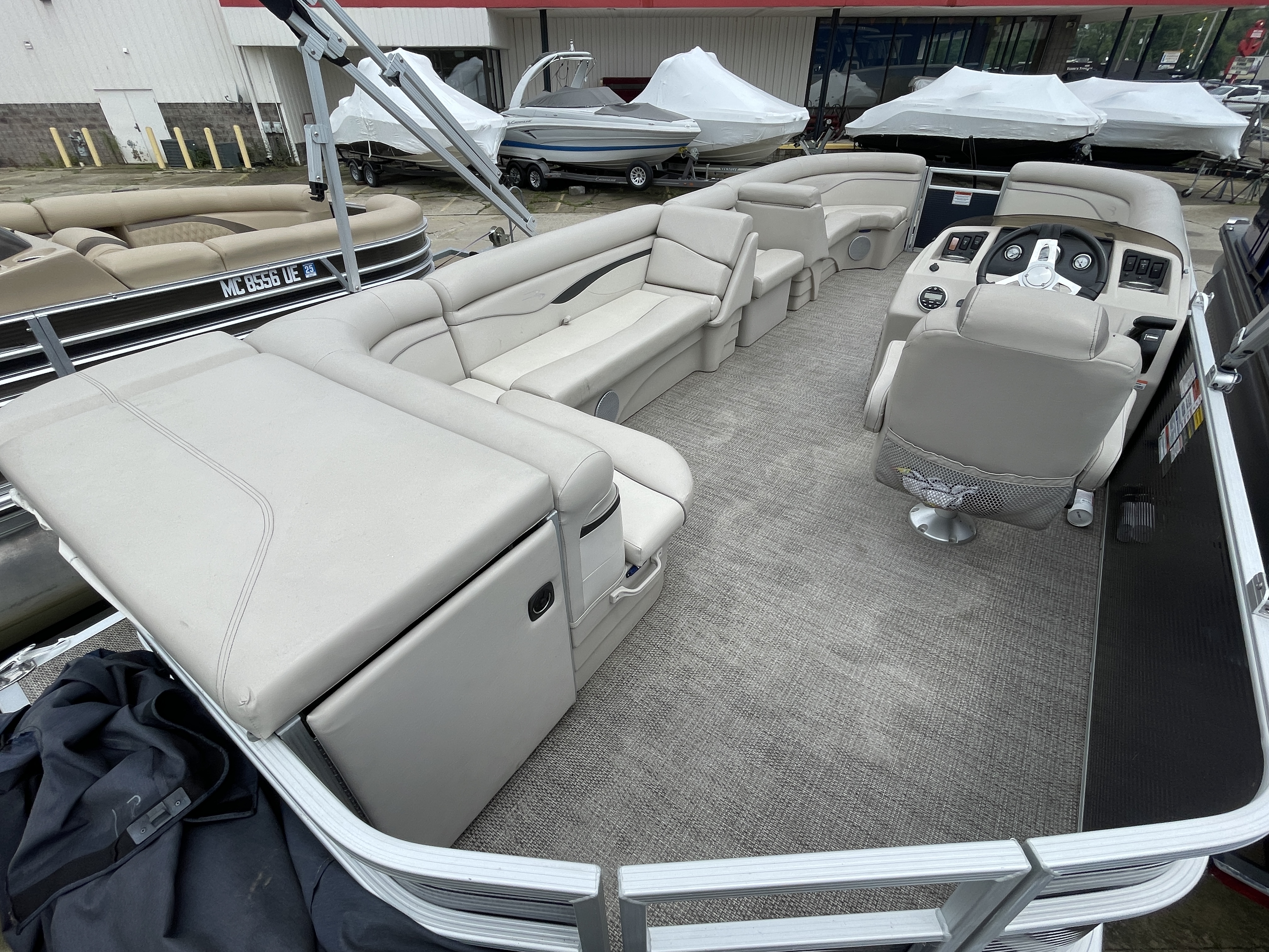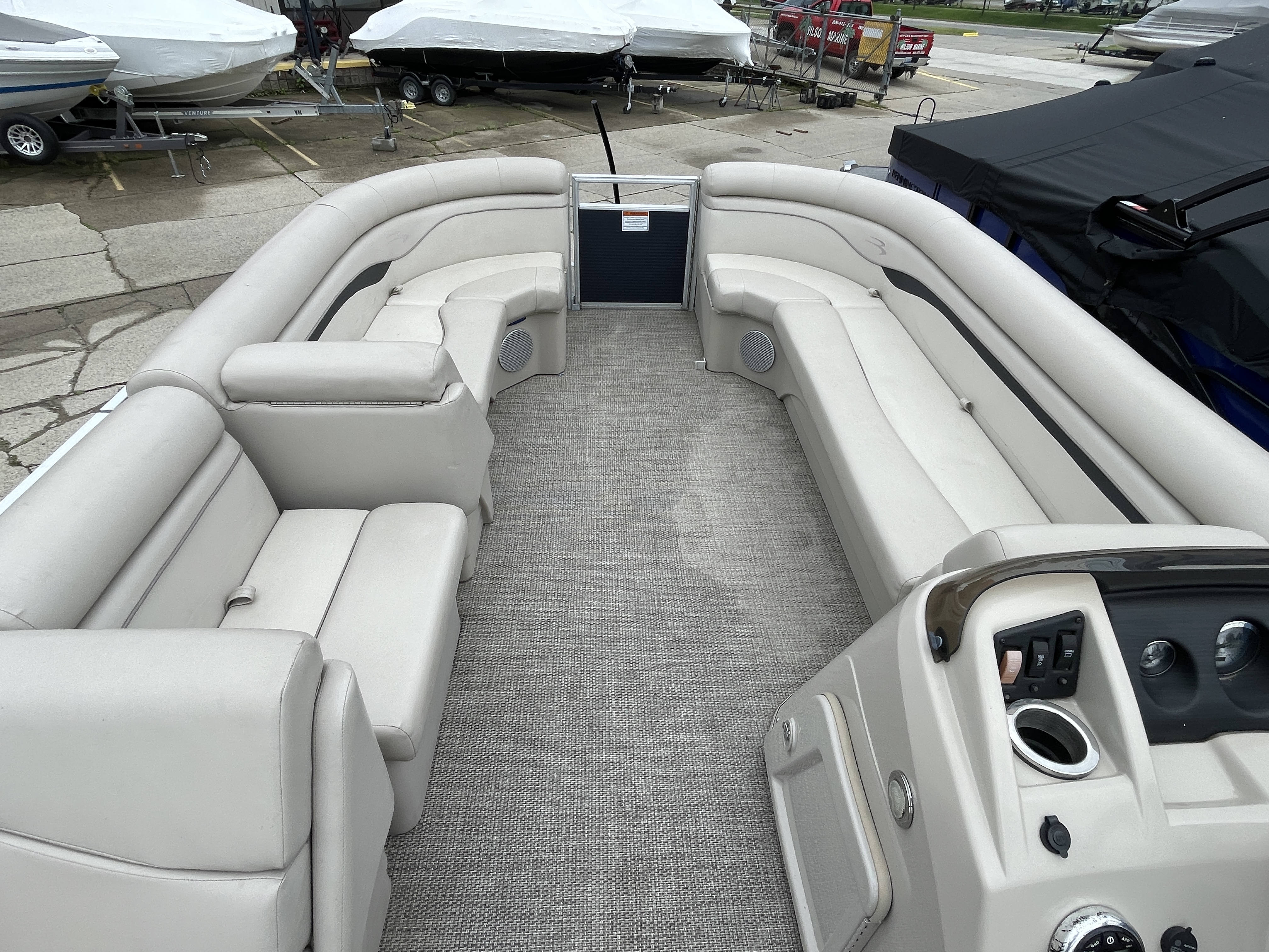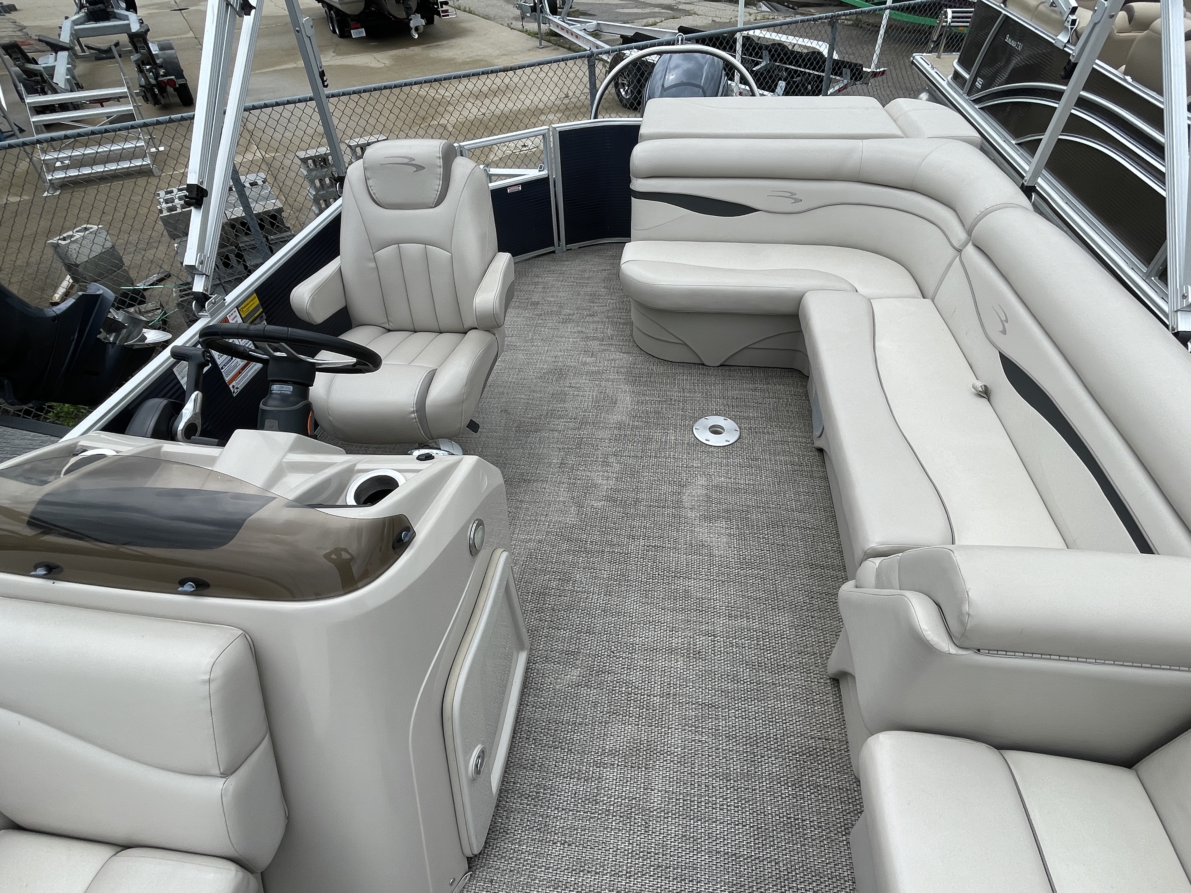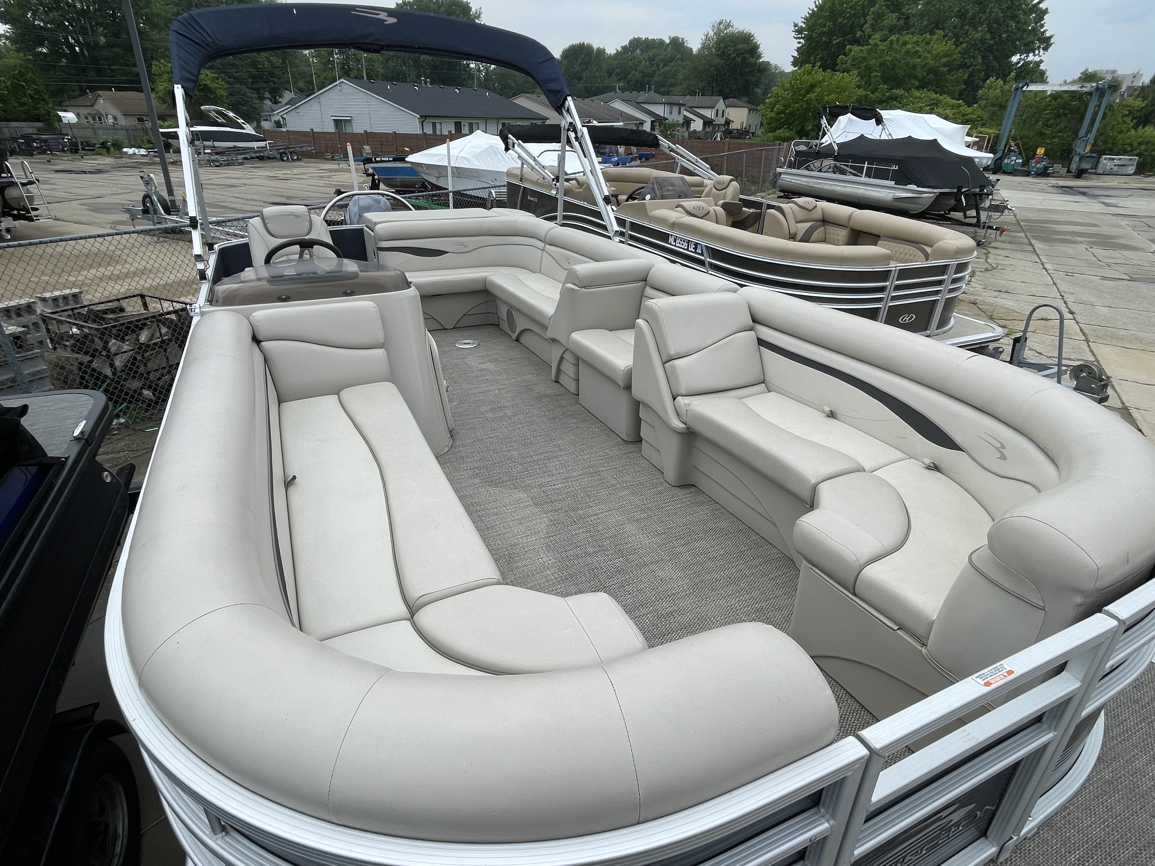 Boat is a tri-toon! Boat comes with full seagrass vinyl flooring, bow gate seat for extra seating, Garmin Striker 4 fish finder at console, bluetooth stereo with 4 speakers, stainless steel ski tow bar, changing room with privacy curtain, bimini top, full clip-on mooring cover, rear swim ladder and much more!