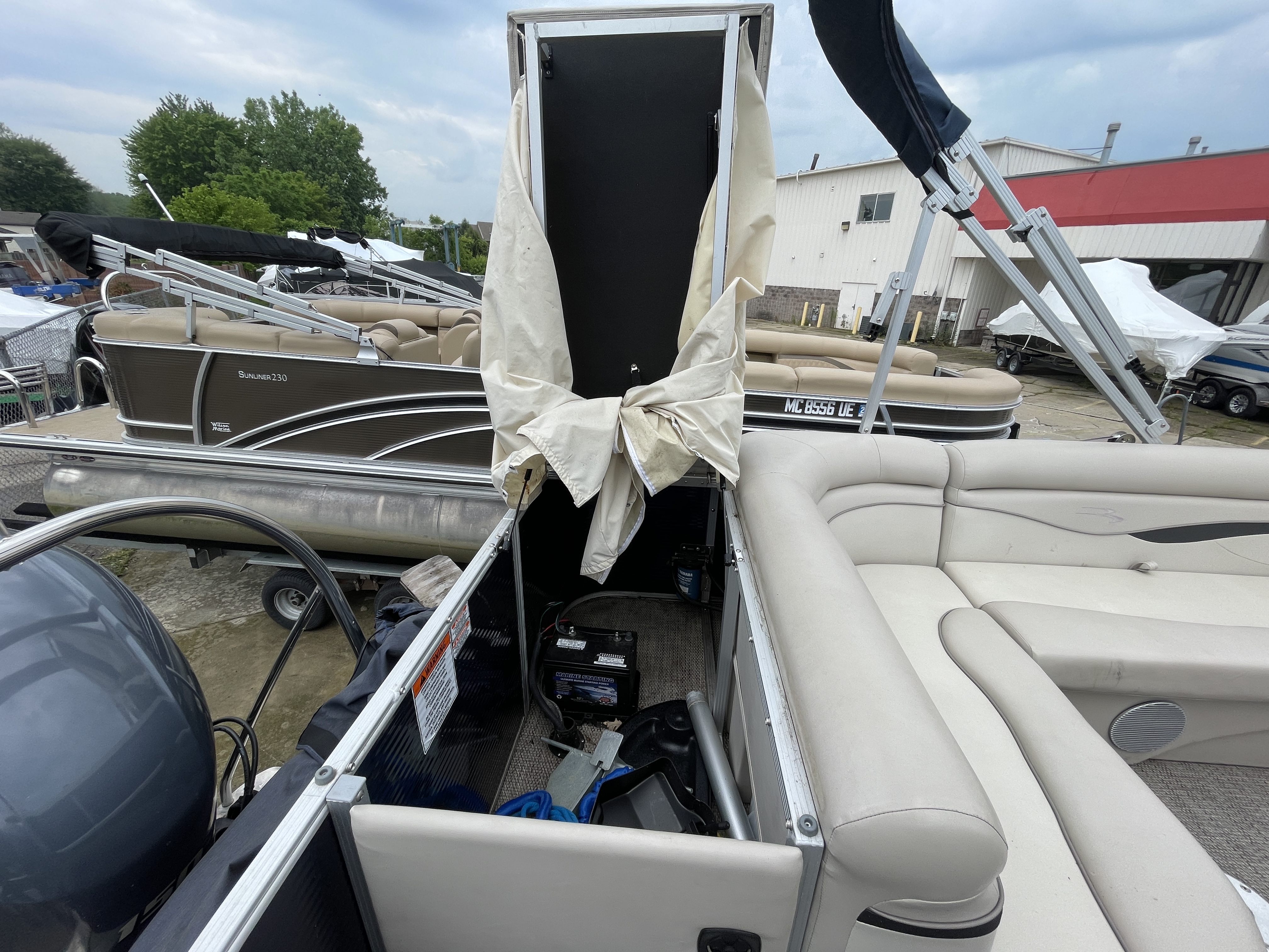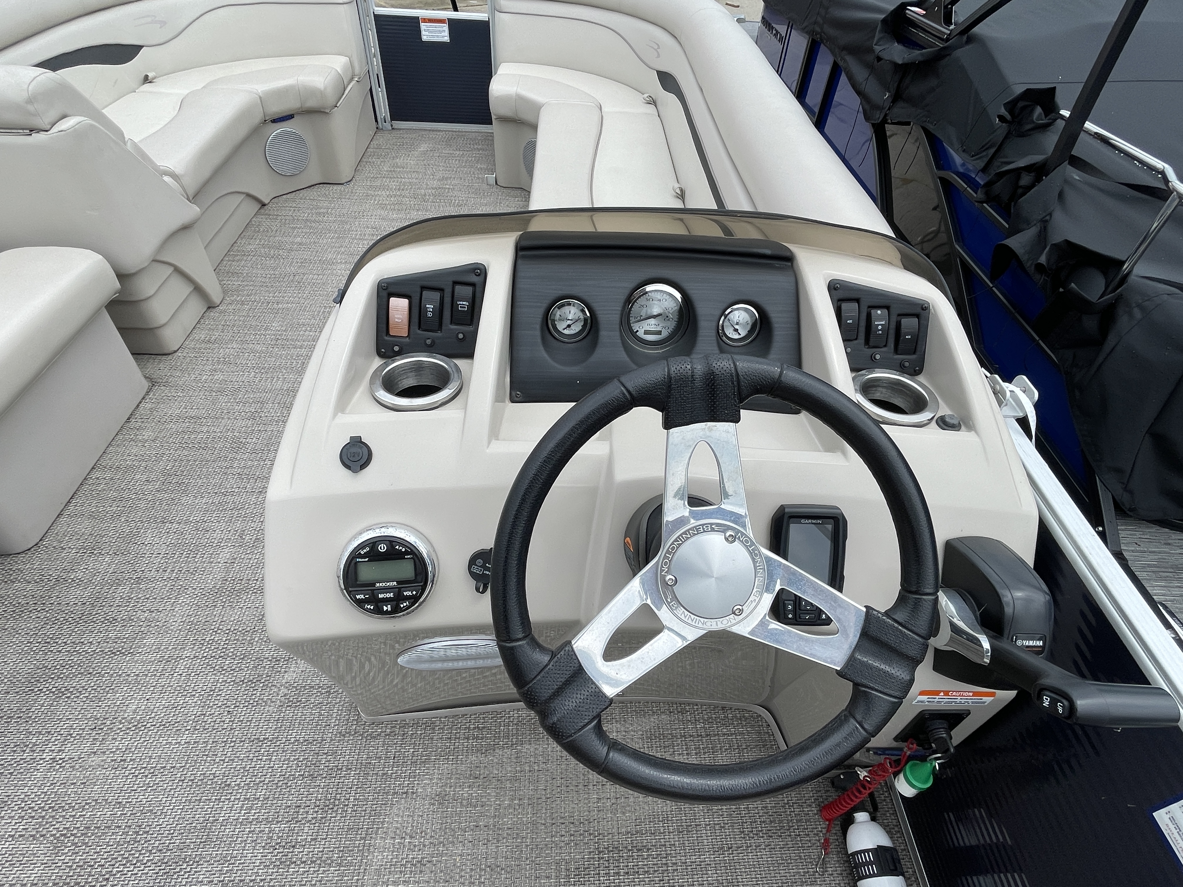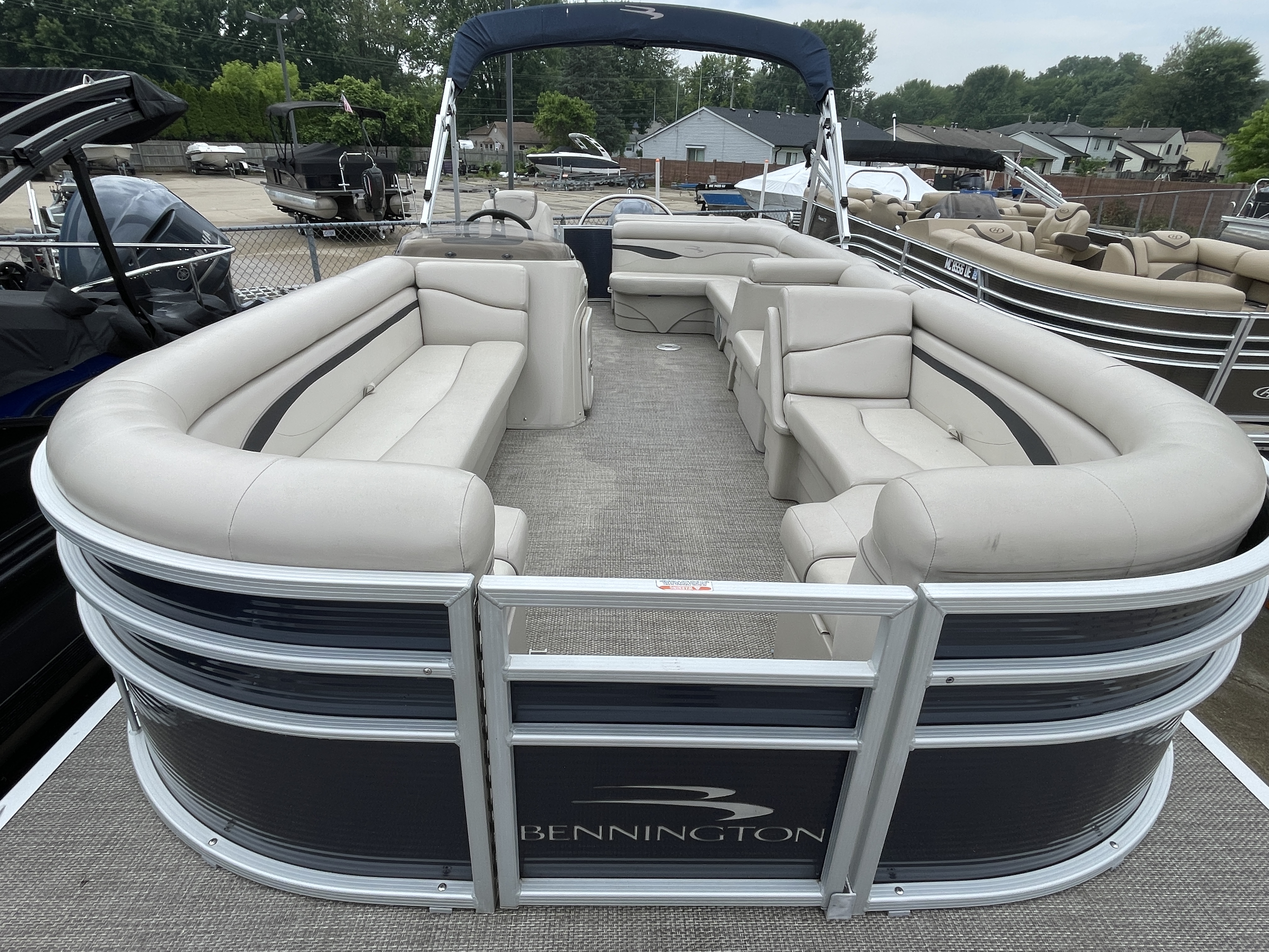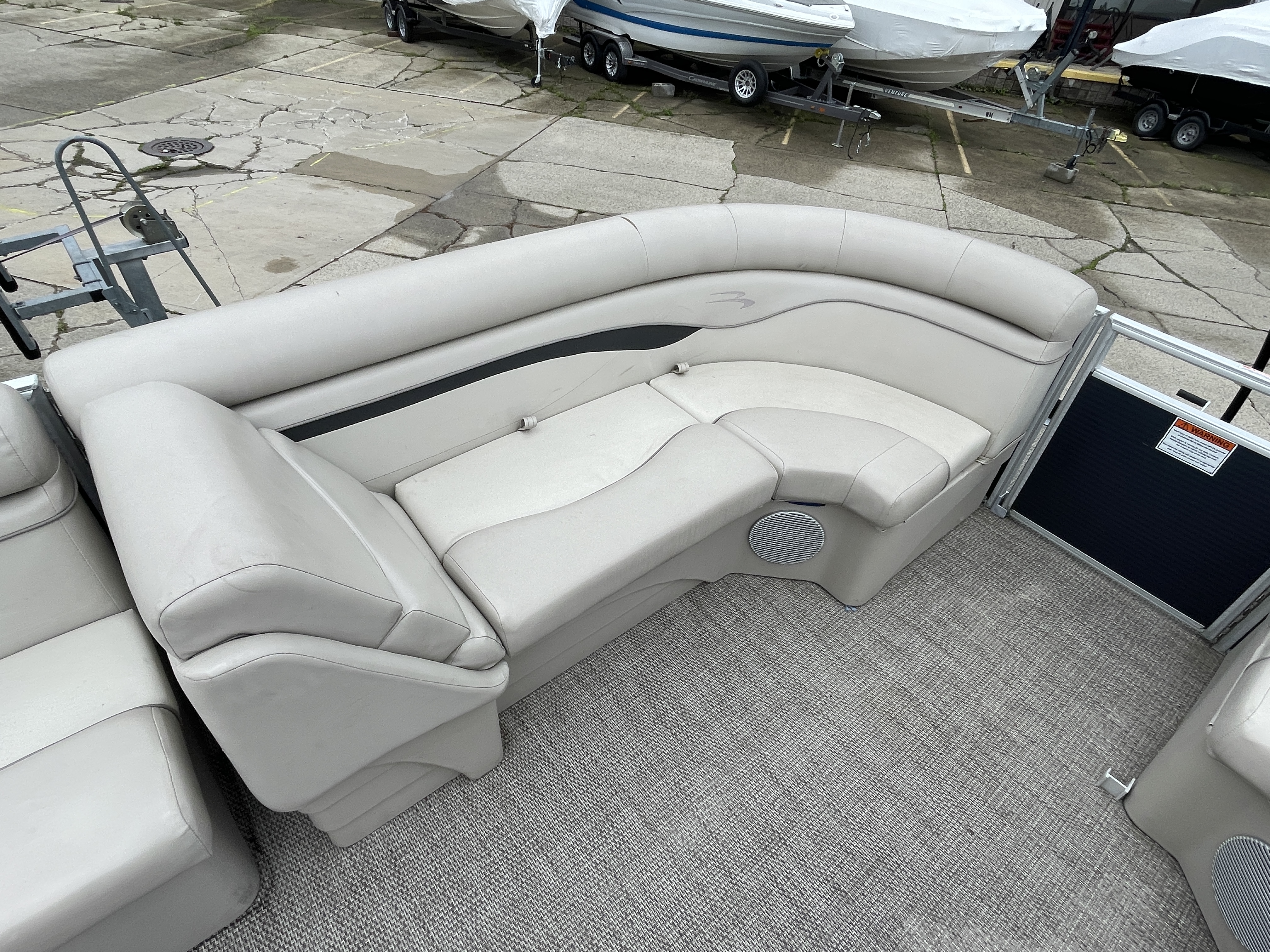 Boat is a tri-toon! Boat comes with full seagrass vinyl flooring, bow gate seat for extra seating, Garmin Striker 4 fish finder at console, bluetooth stereo with 4 speakers, stainless steel ski tow bar, changing room with privacy curtain, bimini top, full clip-on mooring cover, rear swim ladder and much more!