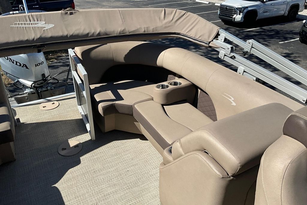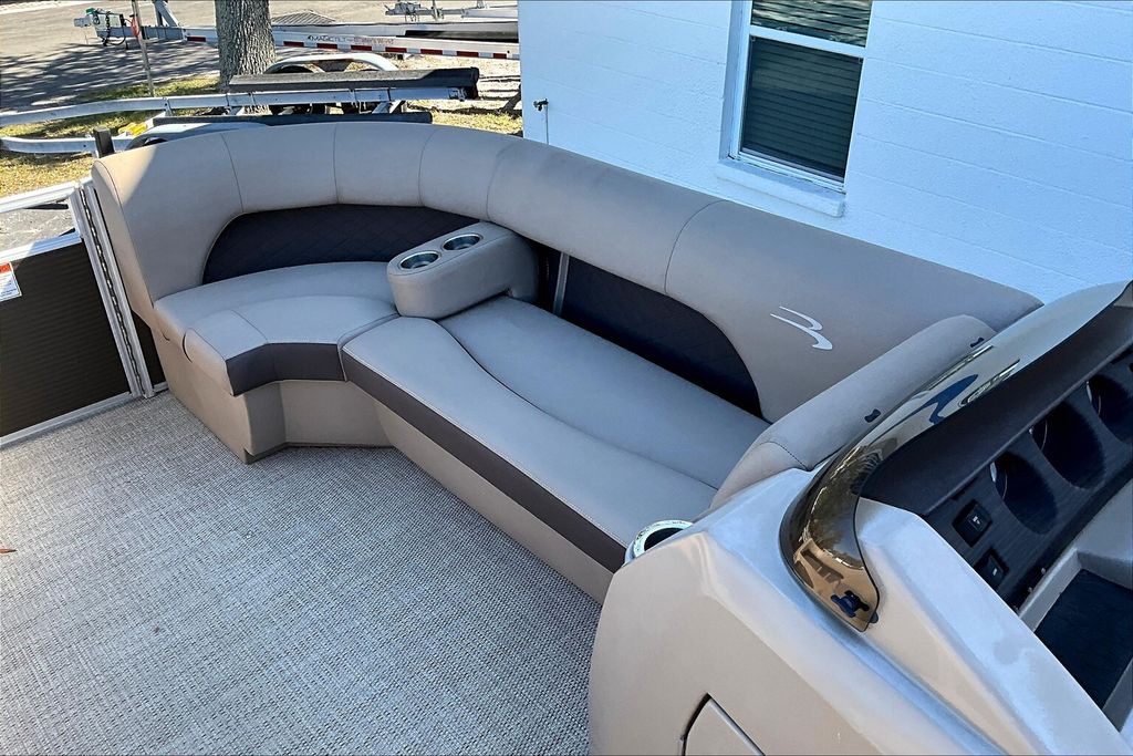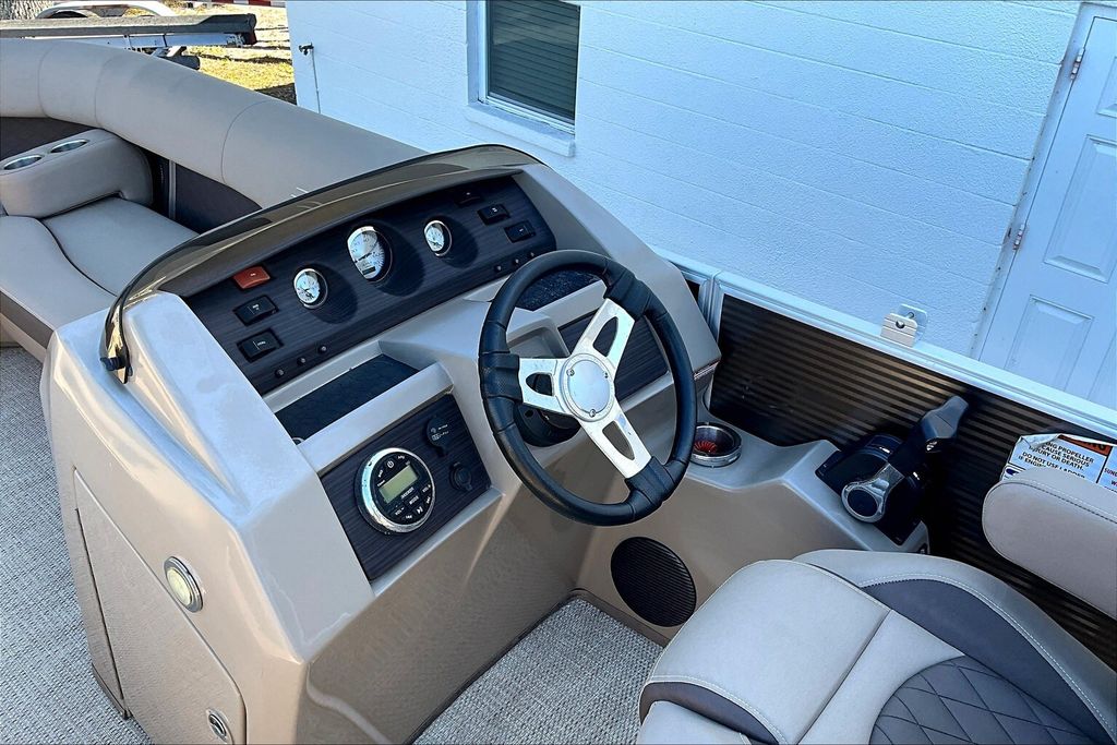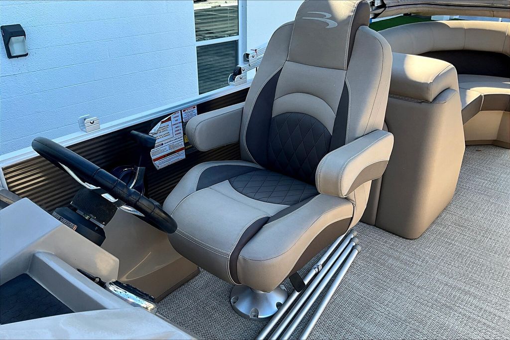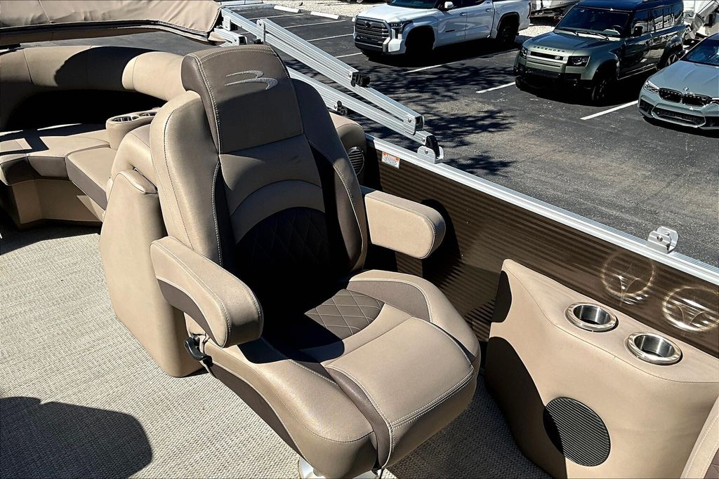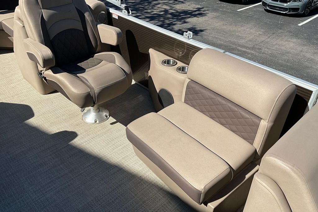 Additional highlights include a well-designed helm station with intuitive controls and clear instrumentation, giving the captain confidence and ease of operation. There is generous storage throughout the boat, including under-seat compartments that allow you to keep life jackets, gear, and personal items neatly organized and out of sight. Stainless-steel accents and high-quality finishes add to the overall durability and upscale appearance of this pontoon.