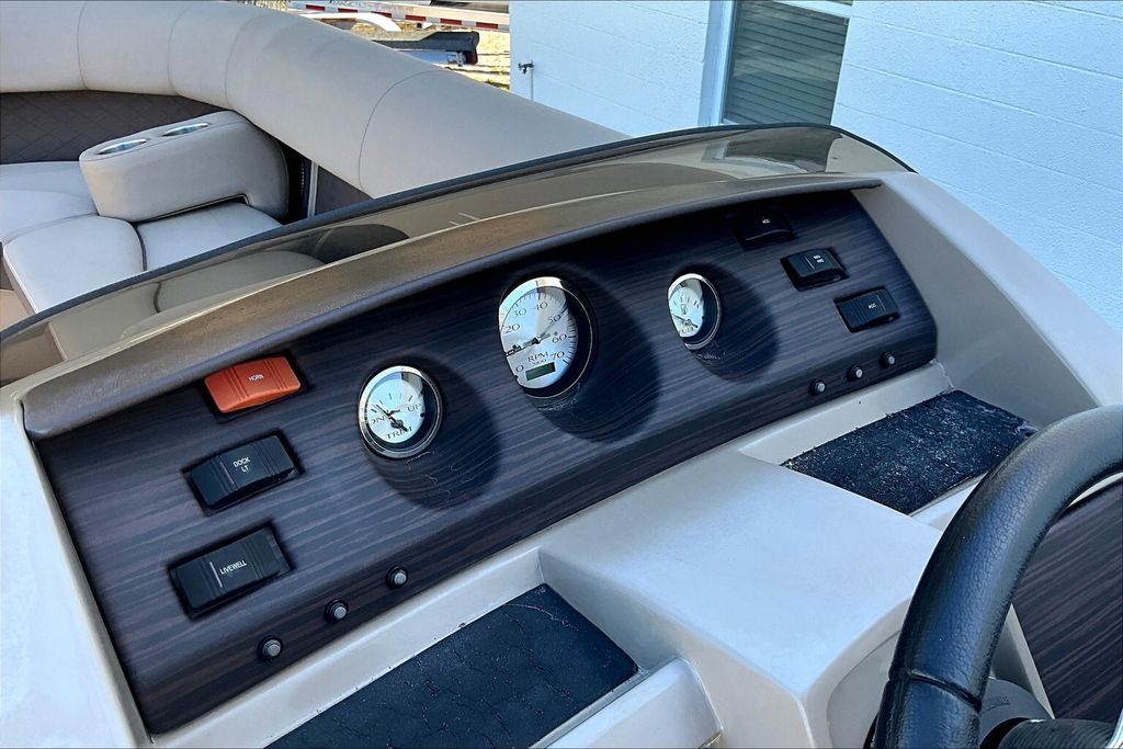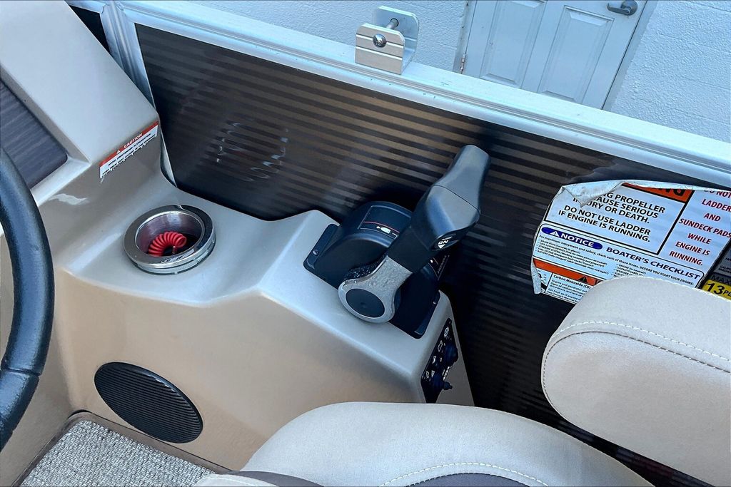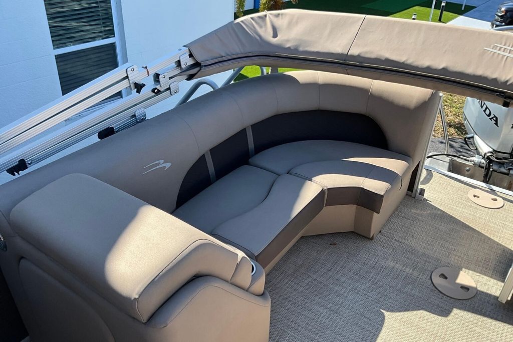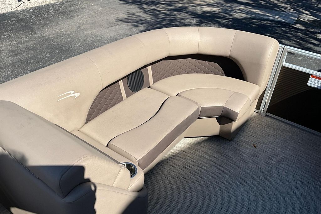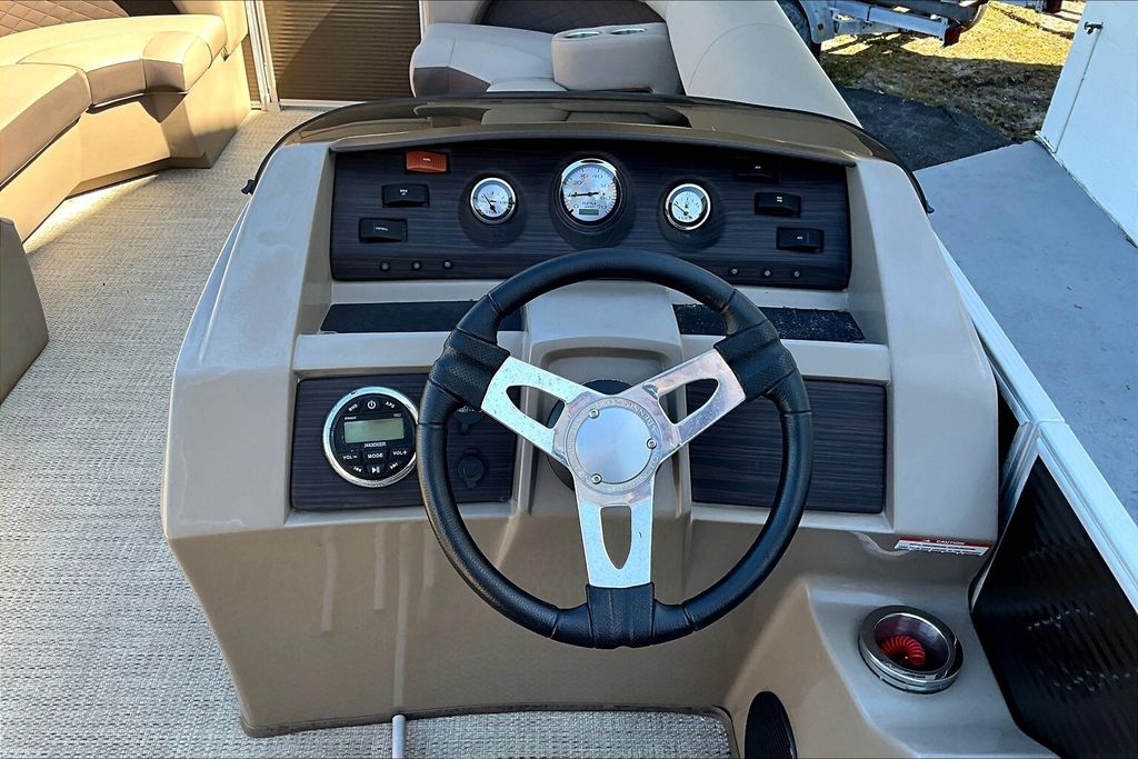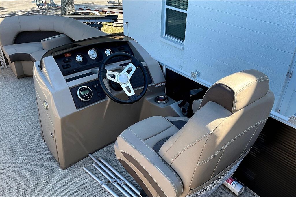 Additional highlights include a well-designed helm station with intuitive controls and clear instrumentation, giving the captain confidence and ease of operation. There is generous storage throughout the boat, including under-seat compartments that allow you to keep life jackets, gear, and personal items neatly organized and out of sight. Stainless-steel accents and high-quality finishes add to the overall durability and upscale appearance of this pontoon.