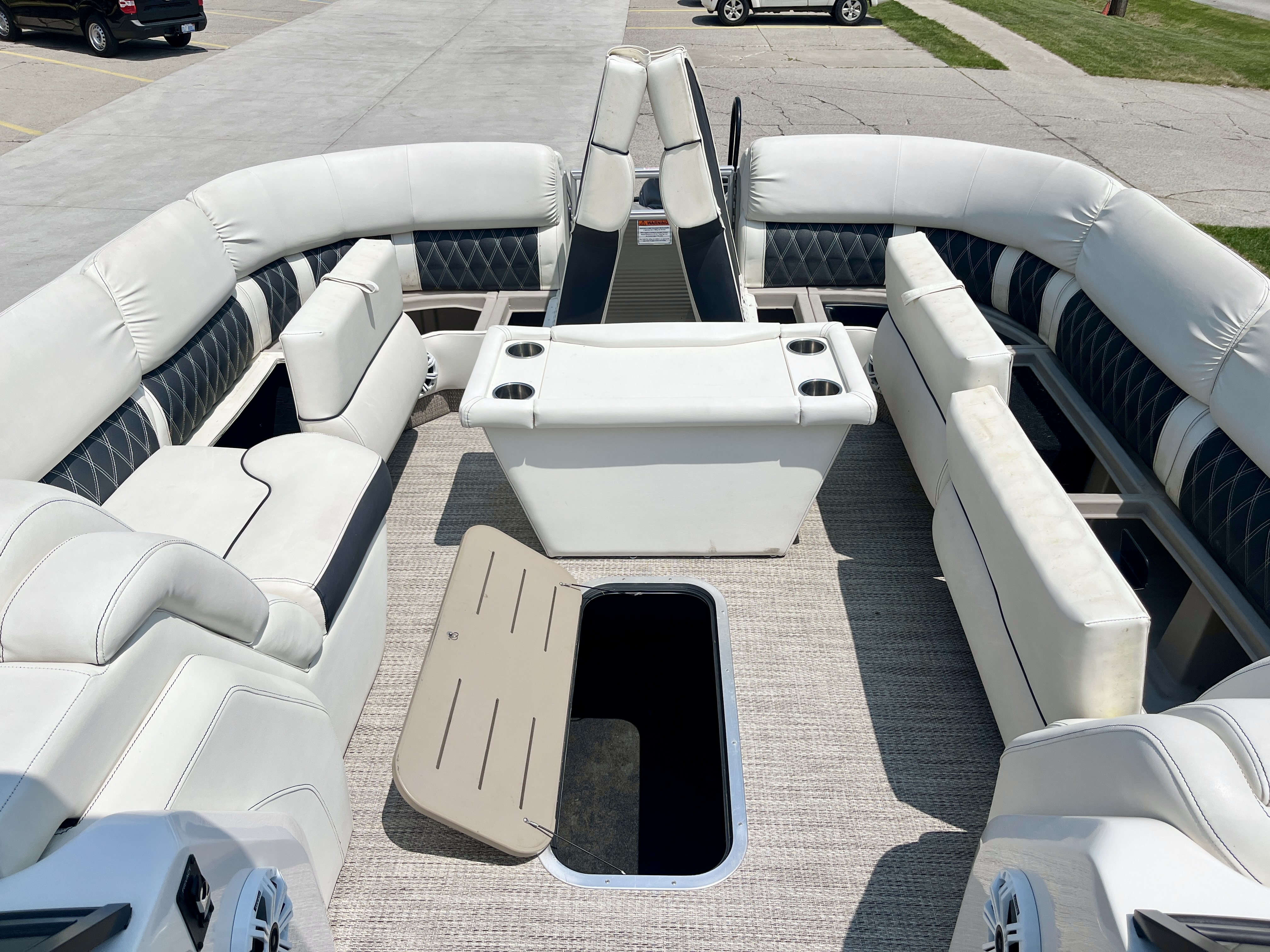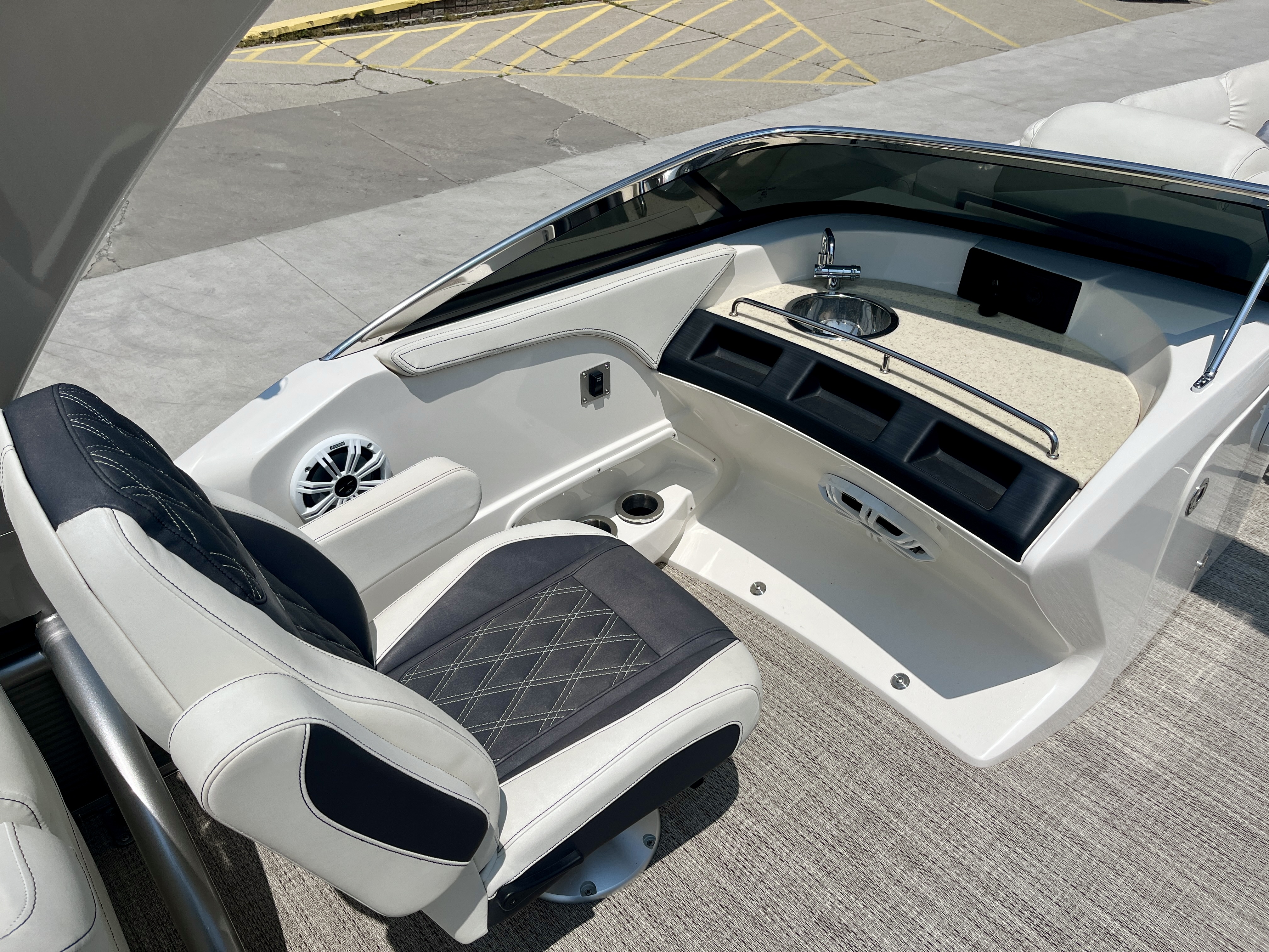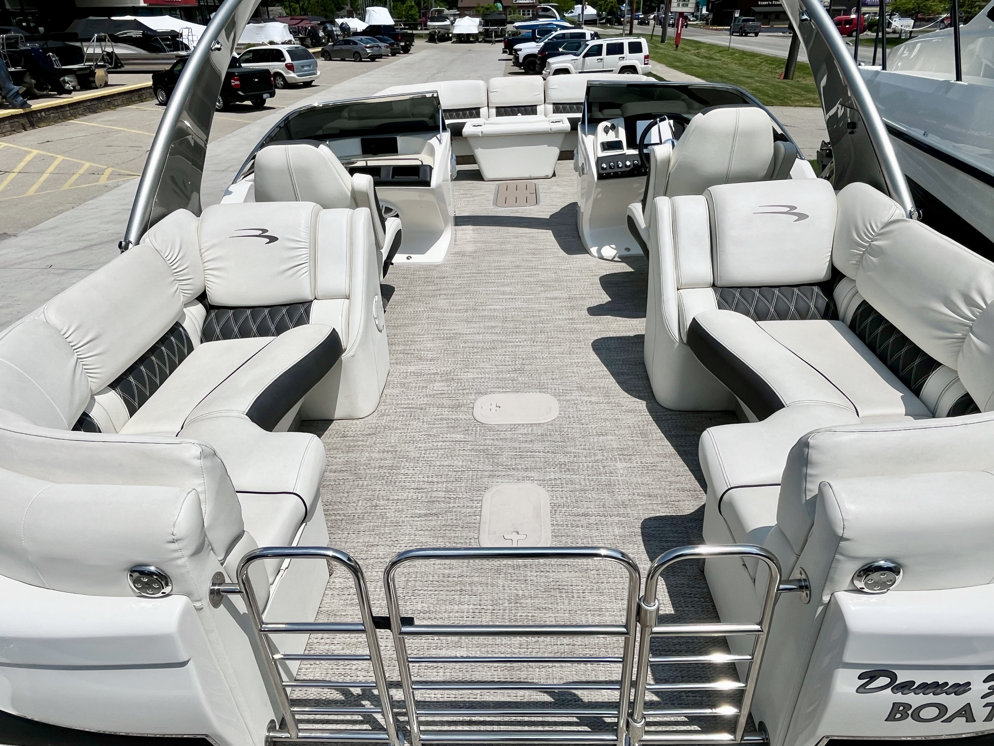 Boat has full fiberglass arch with speakers built-in and bimini top, stainless steel docking lights, full vinyl flooring, stainless steel rubrail, fill clip-on mooring cover, pillowtop upholstery, rear swim ladder, ottoman cooler, movable bow gate seat for extra seating, two portable cupholders, bluetooth stereo with speakers, Simrad and Yamaha screens in-dash, dual console with windshield, in-floor ski locker and so much!!