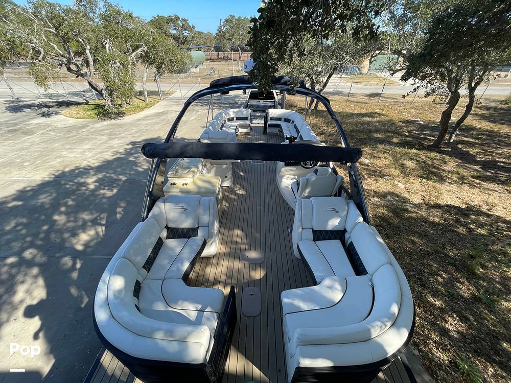 Stretching 30 feet in length, this premium pontoon boat features an elegant, modern design with plush, high-back seating and a well-thought-out layout that maximizes both relaxation and entertainment.