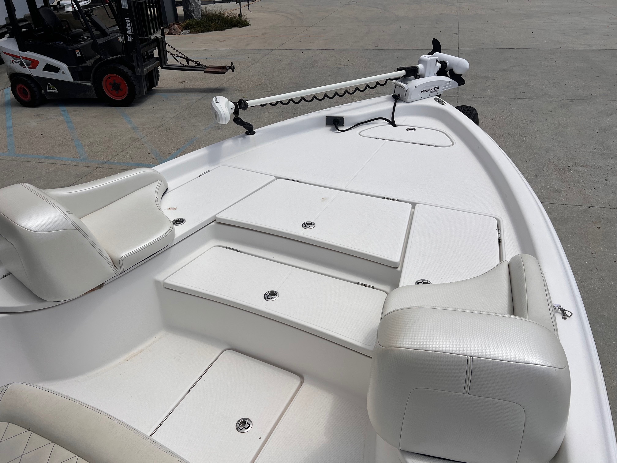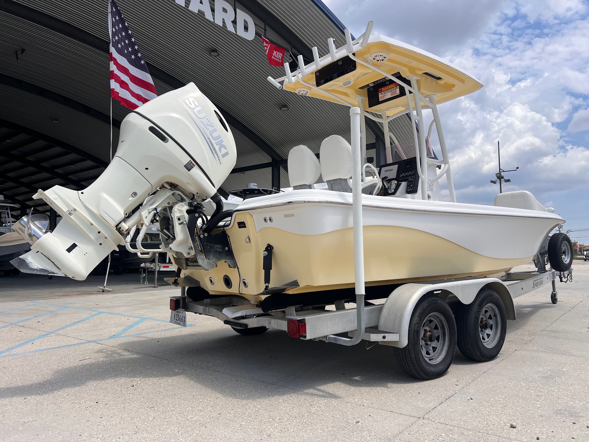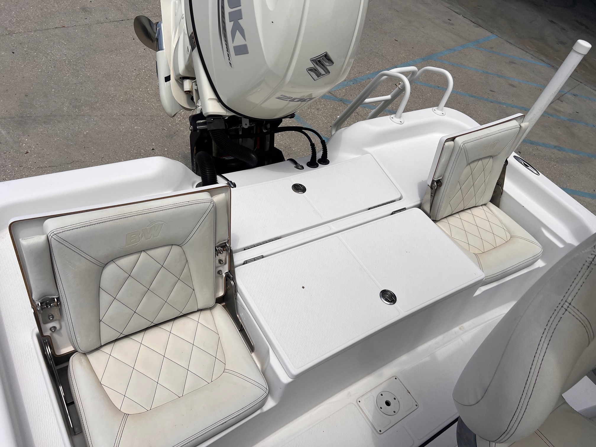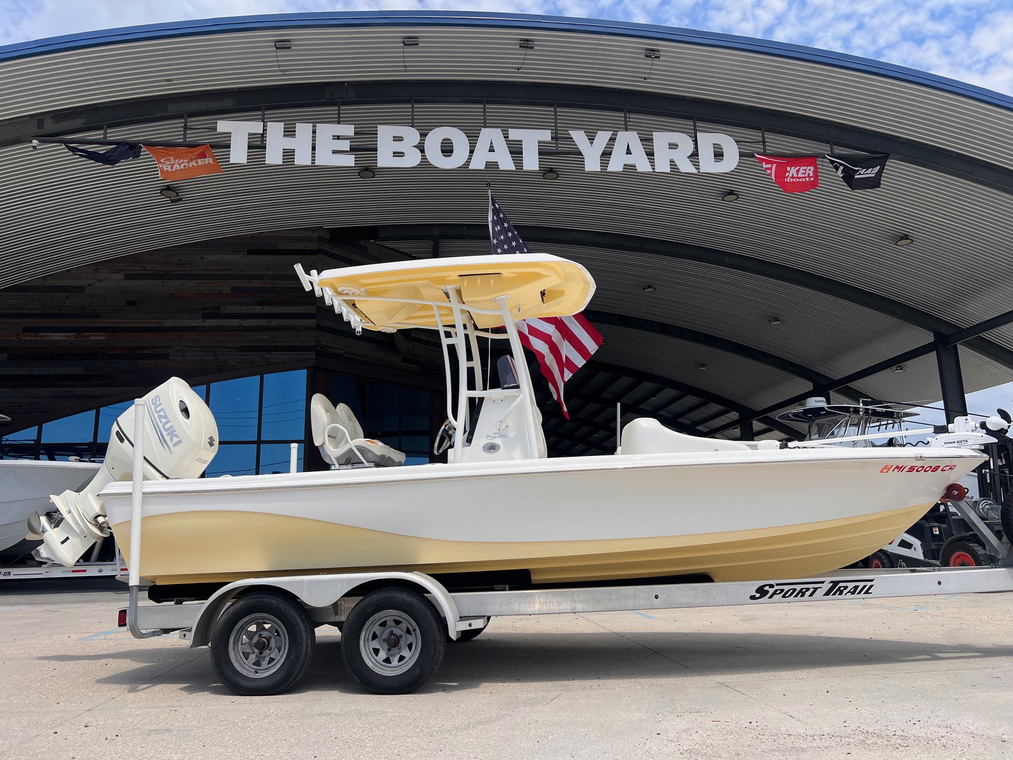 The 2019 Blue Wave 2200 Pure Bay is a fiberglass bay boat with a length of 21'4" and a beam of 8'6", designed for shallow water use and multi-species fishing. This Blue wave has a 12-inch draft, and an 8-person capacity.
