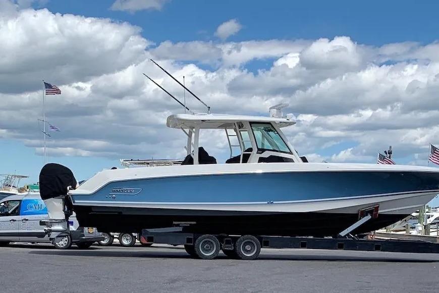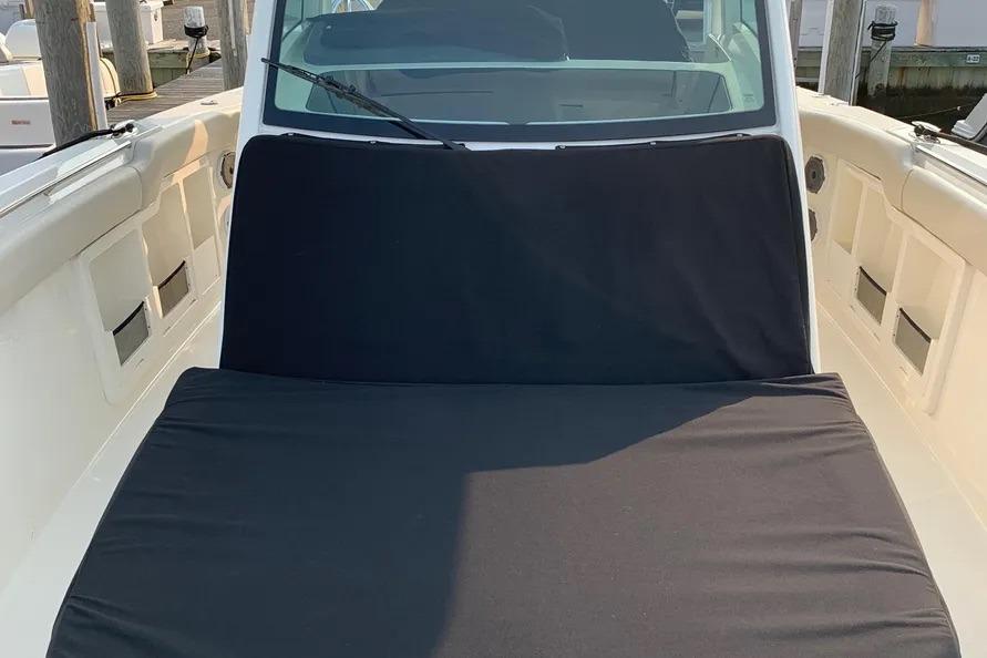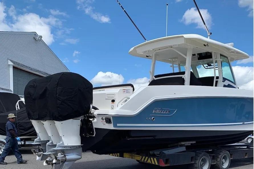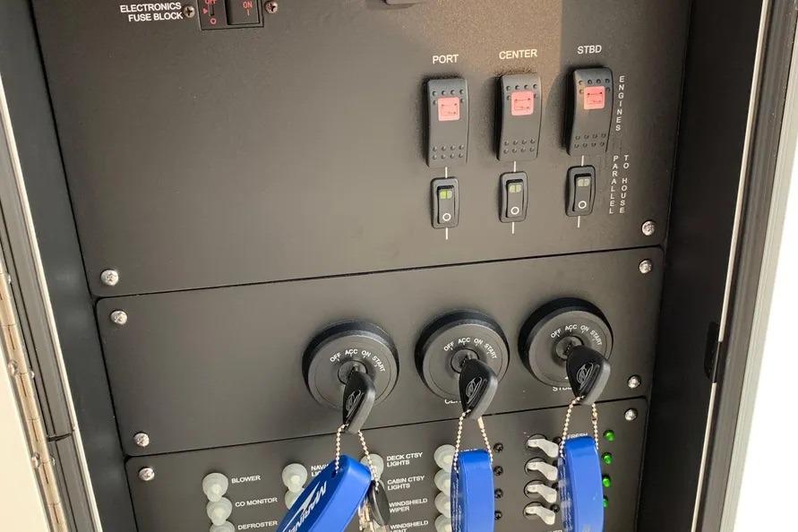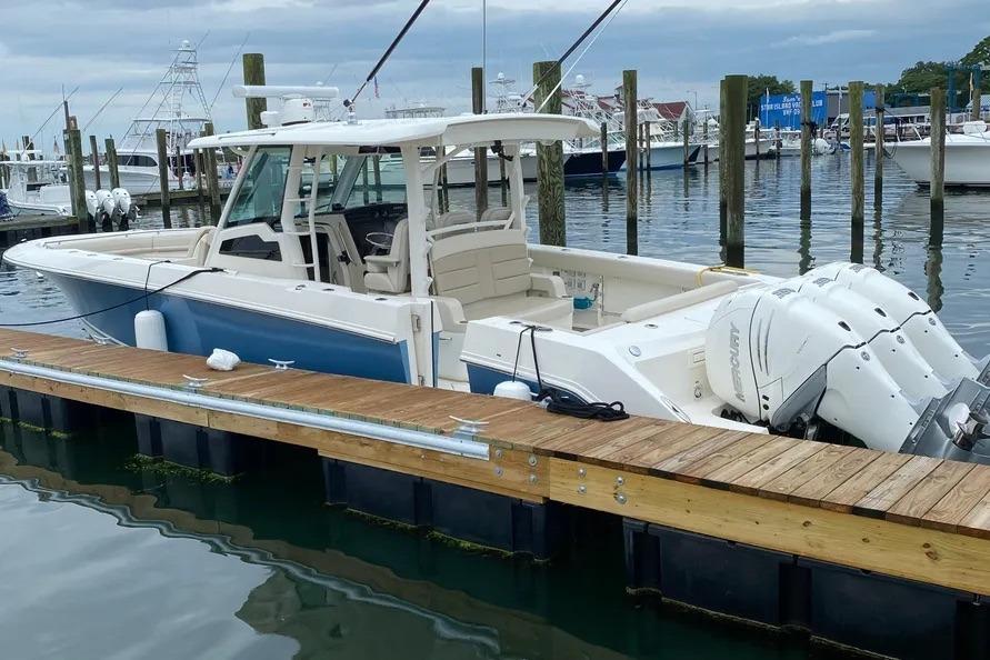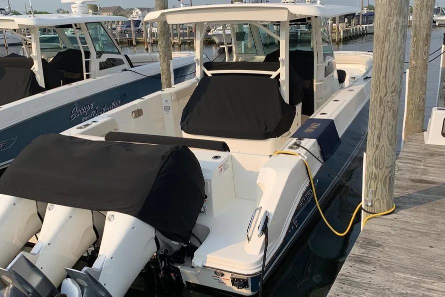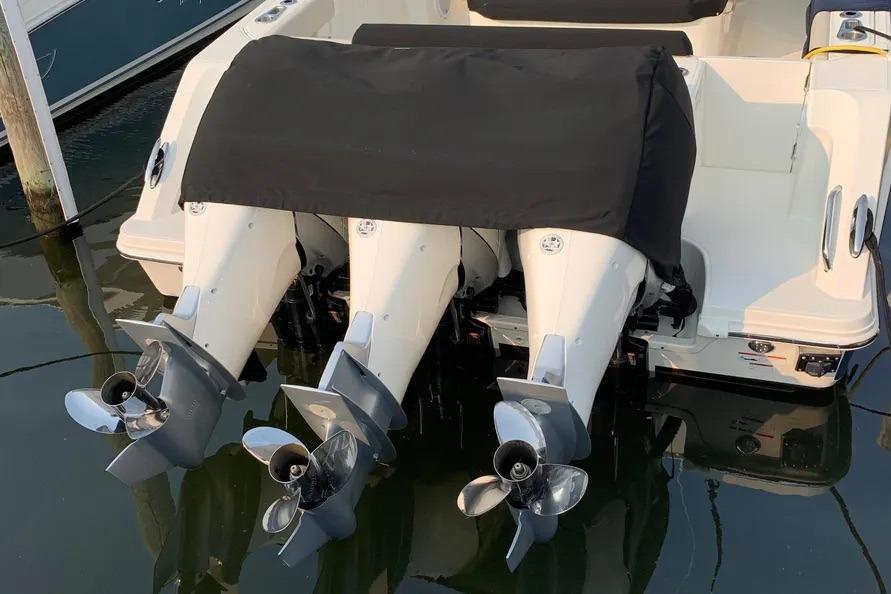 Abaco Blue hull w/ silver graphics · retractable cockpit sunshade · premium audio upgrade · Active Trim · engine fresh-water flush system · (2) aft teak cockpit tables · black radial outriggers · black canvas cover package · generator (~2 hrs) · ceramic coated spring 2022 & Feb 2024 · Micron 66 bottom renewed recently · stored indoors in heated facility every winter since new · engines flushed and helm/console/cushions covered after every use · sea strainers & A/C flushed monthly · 100-hr services each fall; 200-hr service completed 03/2024 · original owner