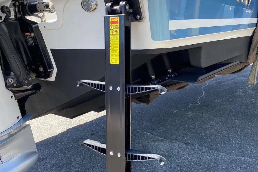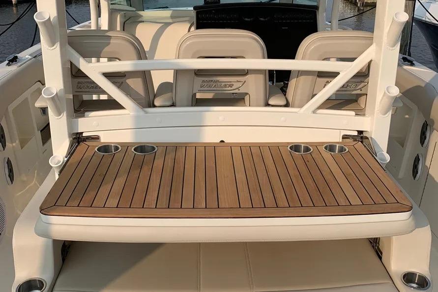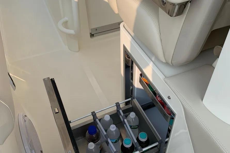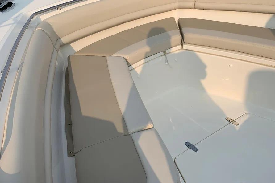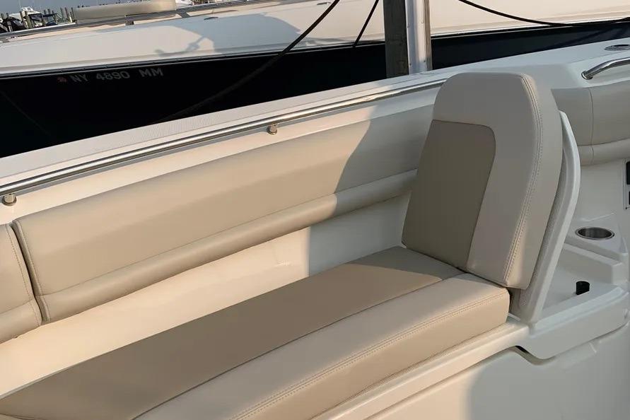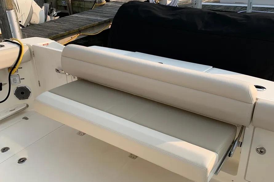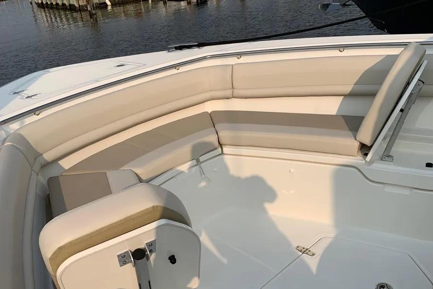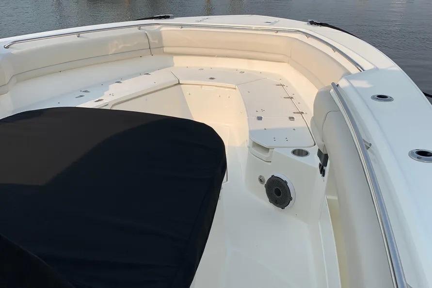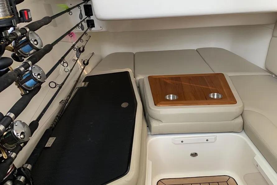 On the water, joystick piloting takes the stress out of tight slips, while the Outrage’s deep-vee ride and Active Trim keep runs composed. Fish or cruise as you like: a 60-gal pressurized livewell, insulated fish boxes, and outriggers support serious days offshore; the retractable sunshade, twin aft teak tables, bow lounge, and forward console chaise pivot the boat to family time. With a generator showing only about two hours and a Mercury Platinum warranty in place through May 2026, you get confidence to match the condition.