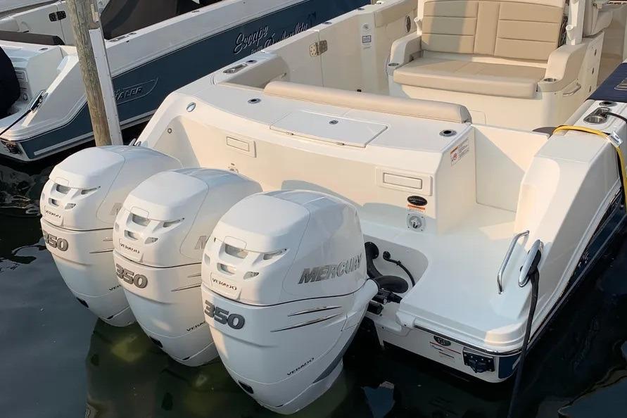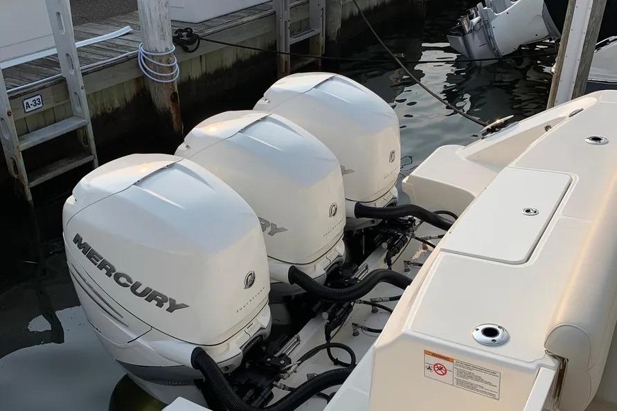 Triple Mercury Verado 350 hp outboards with joystick piloting · 396 hours (as of 9/2024) · Mercury Platinum Extended Warranty to 05/21/2026