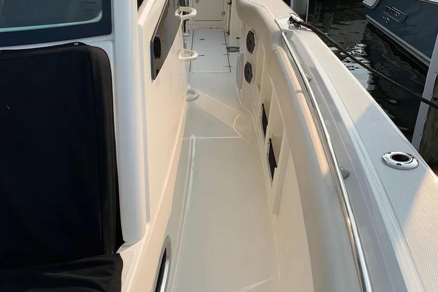 Meticulous is the theme here. This original-owner 380 Outrage has lived indoors every winter in a heated facility, was ceramic coated in 2022 and again in 2024, carries fresh Micron 66 on the bottom, and shows the kind of care you can see in spotless bilges, monthly-flushed systems, and covers on after every run. The helm presents cleanly with dual 16″ Axiom XL displays recessed behind a single glass panel, a rare, high-end look that complements the Abaco Blue hull.