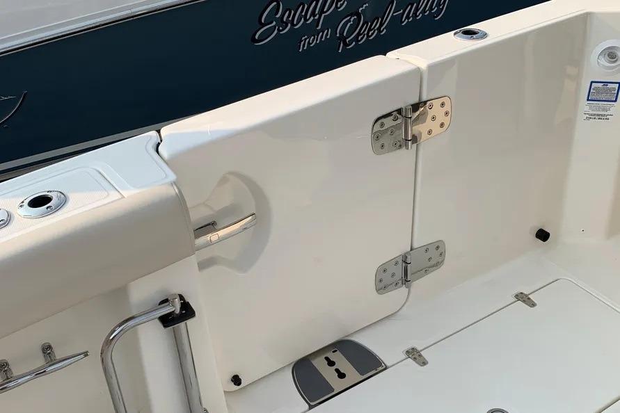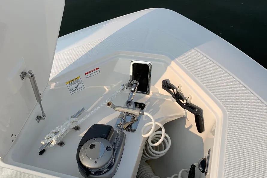 Center-helm layout with tilt SS wheel & footrest platform · pressurized 60-gal transom livewell (acrylic lid, blue interior, divider, dual LED) · dive door to port with removable ladder + transom door · insulated in-deck fish boxes (fwd & aft) with pump-outs · foldaway stern bench · forward console lounge with armrests & USB · wrap-around bow seating with flip-up backrests · hardtop rod holders (6) + gunnel/transom holders · full coaming bolsters · LED courtesy/rope/compartment lighting · low-profile bow rail & cockpit toe rails · anchor roller with SS anchor · swim platform with telescoping ladder · lockable console storage and bow/mech stowage.