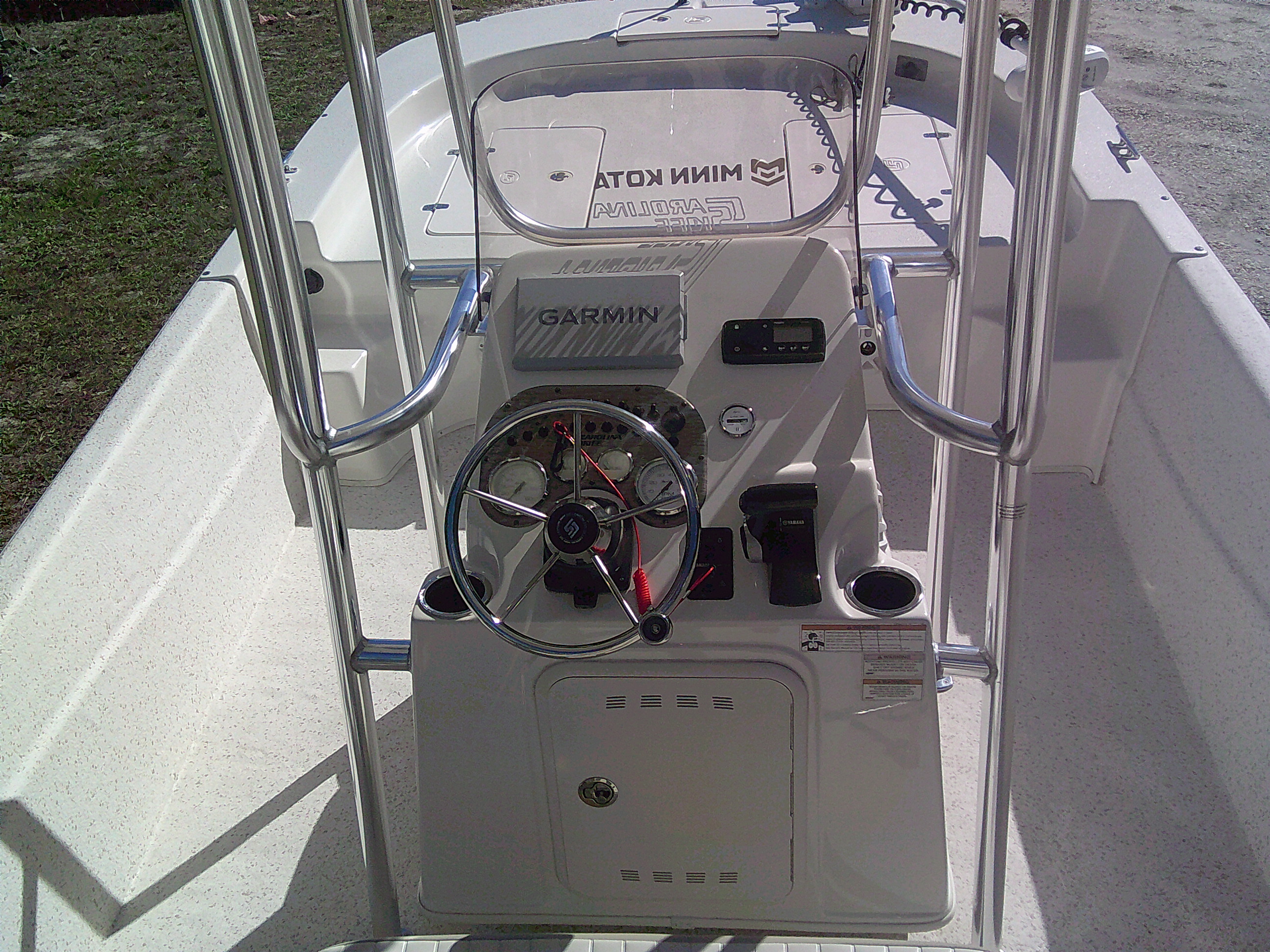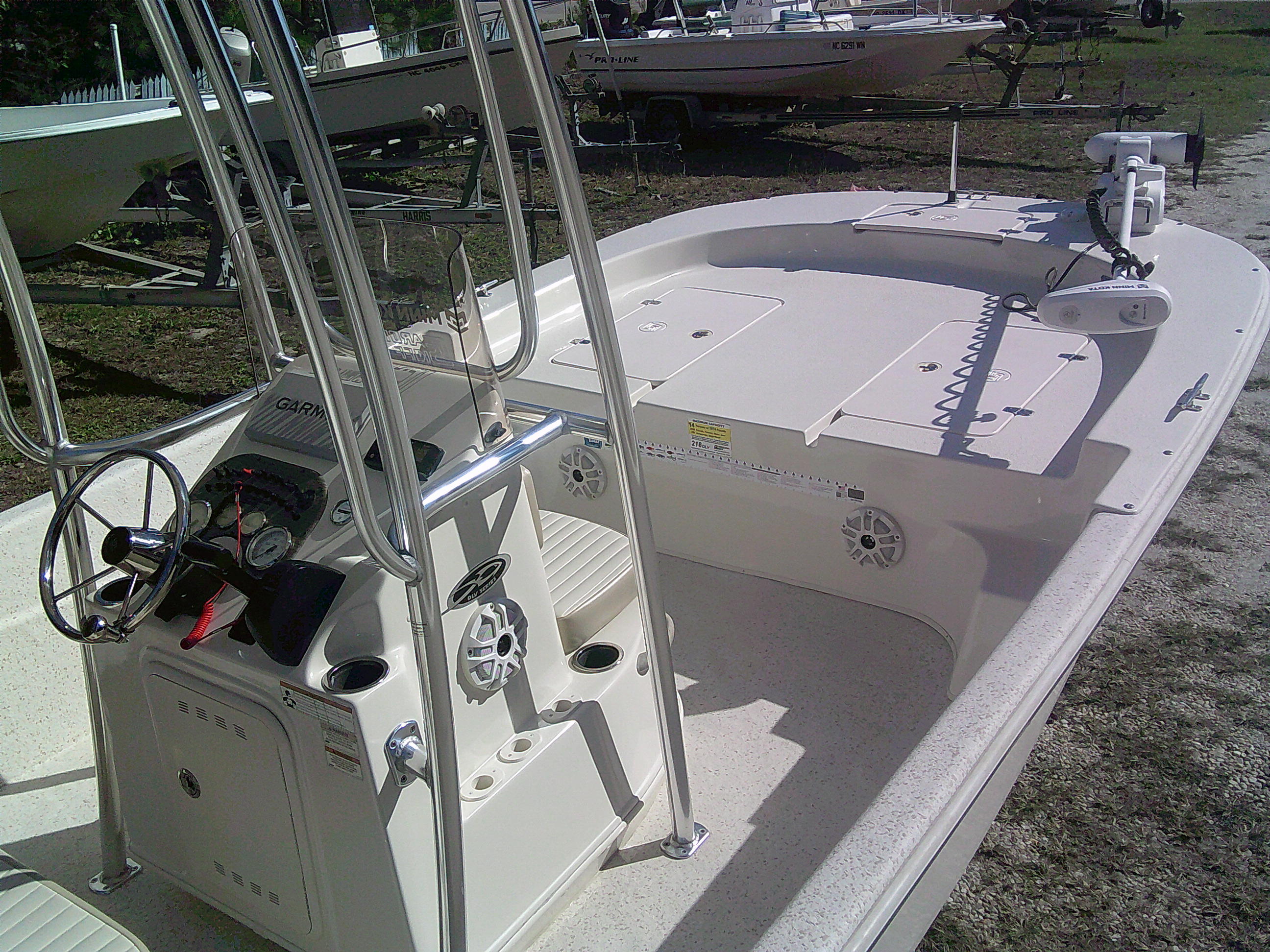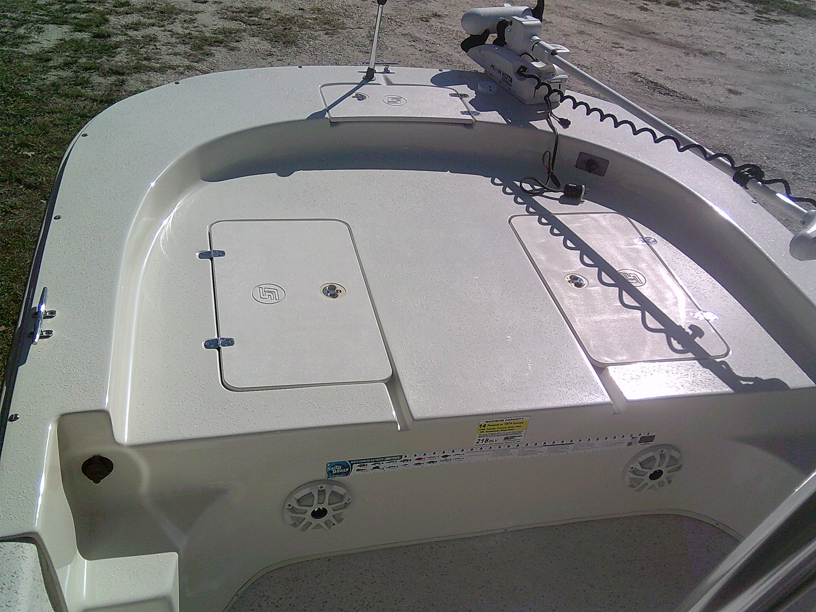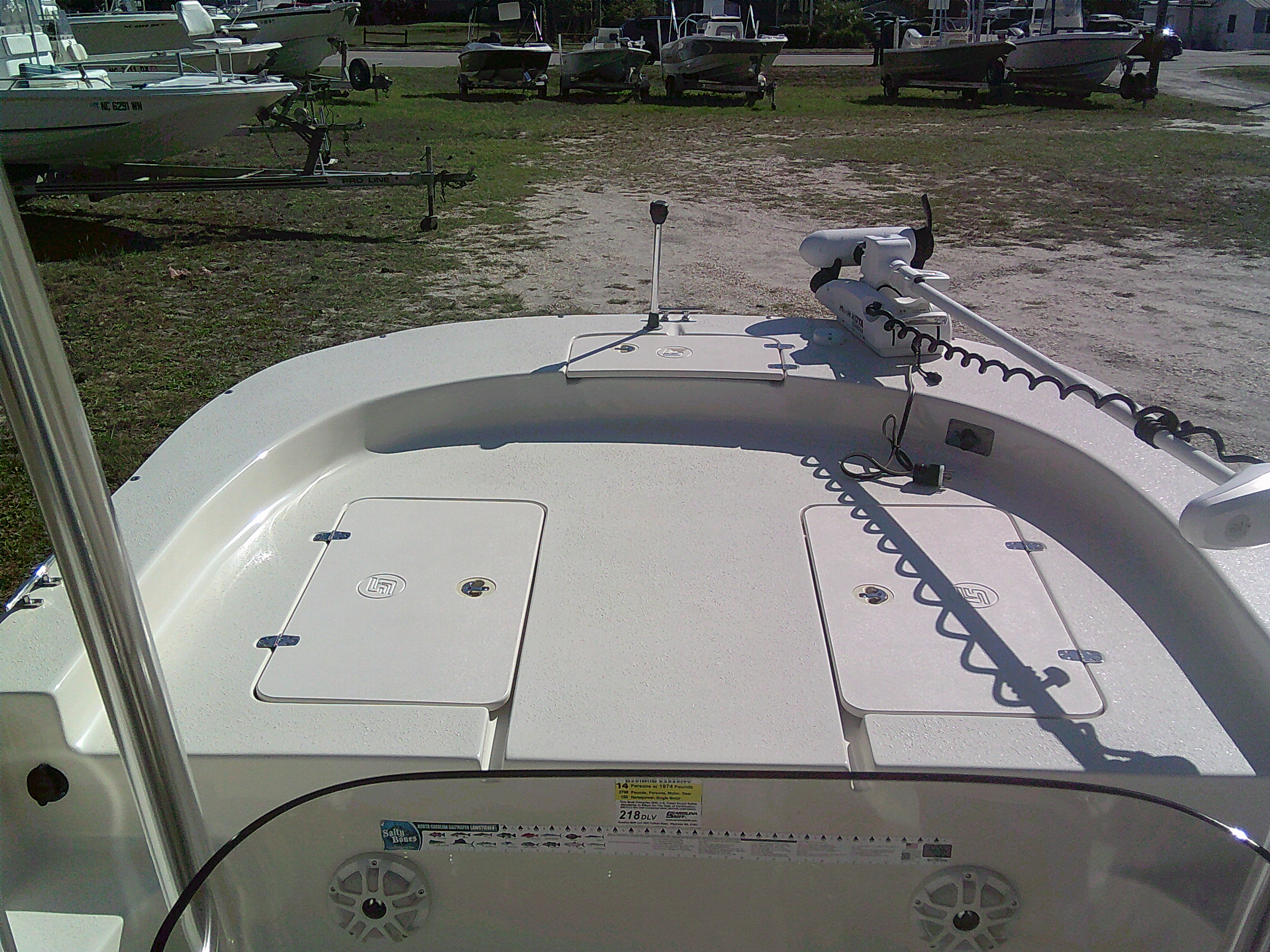 Vessel Info: Large Forward Platform, Perfect for Throwing a Cast Net, Fishing or Sunning w/Anchor Locker w/Anchor, Chain, Line, Minn Kota Terrova I-Polit Trolling Motor, 24 Volts, 80Lbs Thrust, 2 Large Storage Boxes, EZ Step to Platform, 2 Speakers / Forward of Console Cushioned Seat/Live-Well/Cooler w/Back Rest, 2 Cup Holders, Grab Rails / T-Top w/ Weblon Top, Elc Box, Grab Rails, Forward and Aft LED Spreaders Lights, T-Bag, 4 Rod Holders / Console w/Wind Screen, Grab Rails, Gauges, Controls, Switch Panel, Stainless Steel Tilt Helm w/Hydraulic Steering and Knob, 2 Speakers, Cup Holders, Storage, 6 Side Rod Holders / Cushioned Helm Bench Seat w/Swing Back Rest, Cooler / Large Aft Platform w/ 2 Cushioned Jump Seats, Large Live Well, Storage, 2 In Deck Rod Holders / Self Bailing Deck / 2 Batteries w/ Switch / 2 Anchors