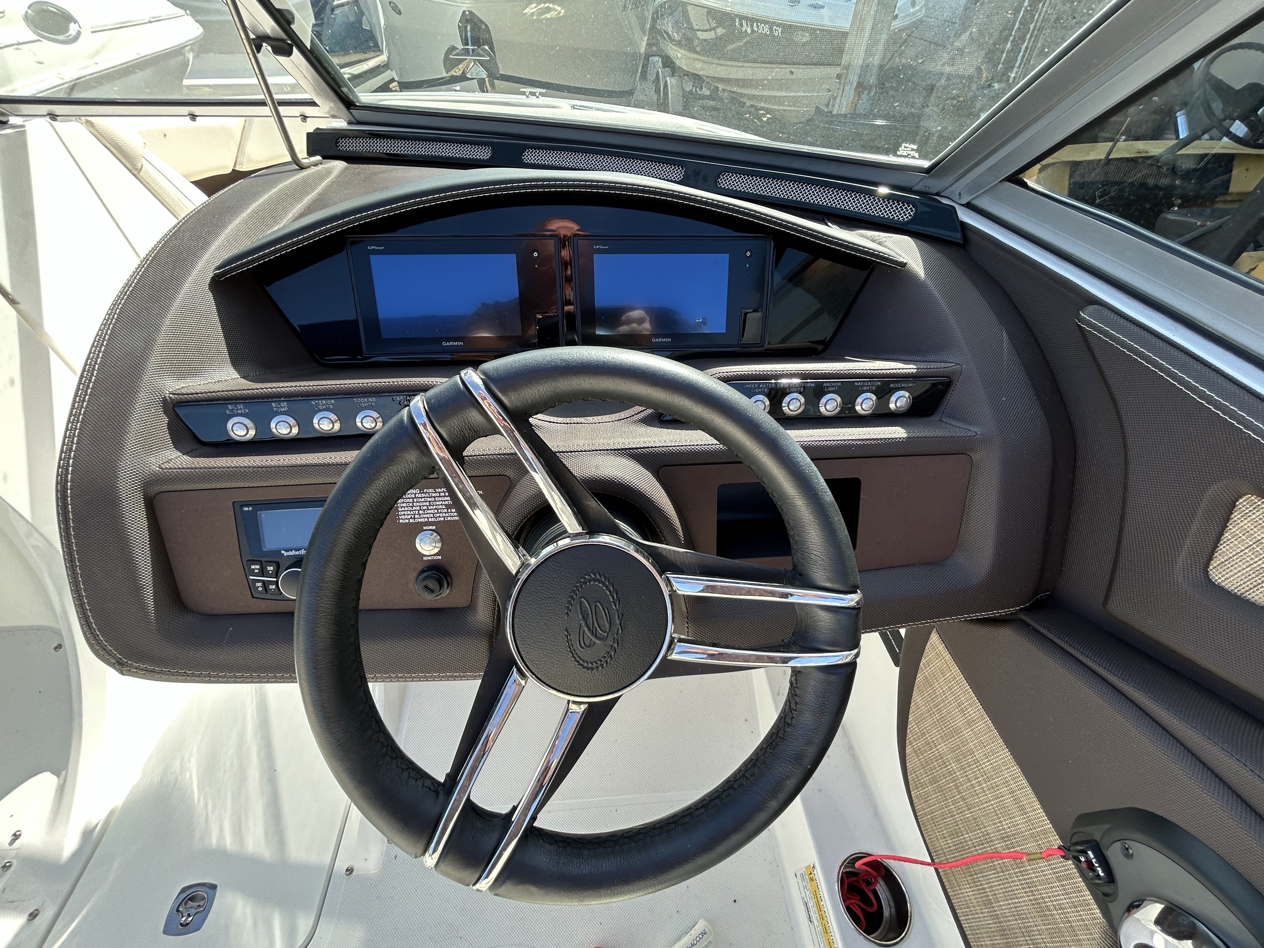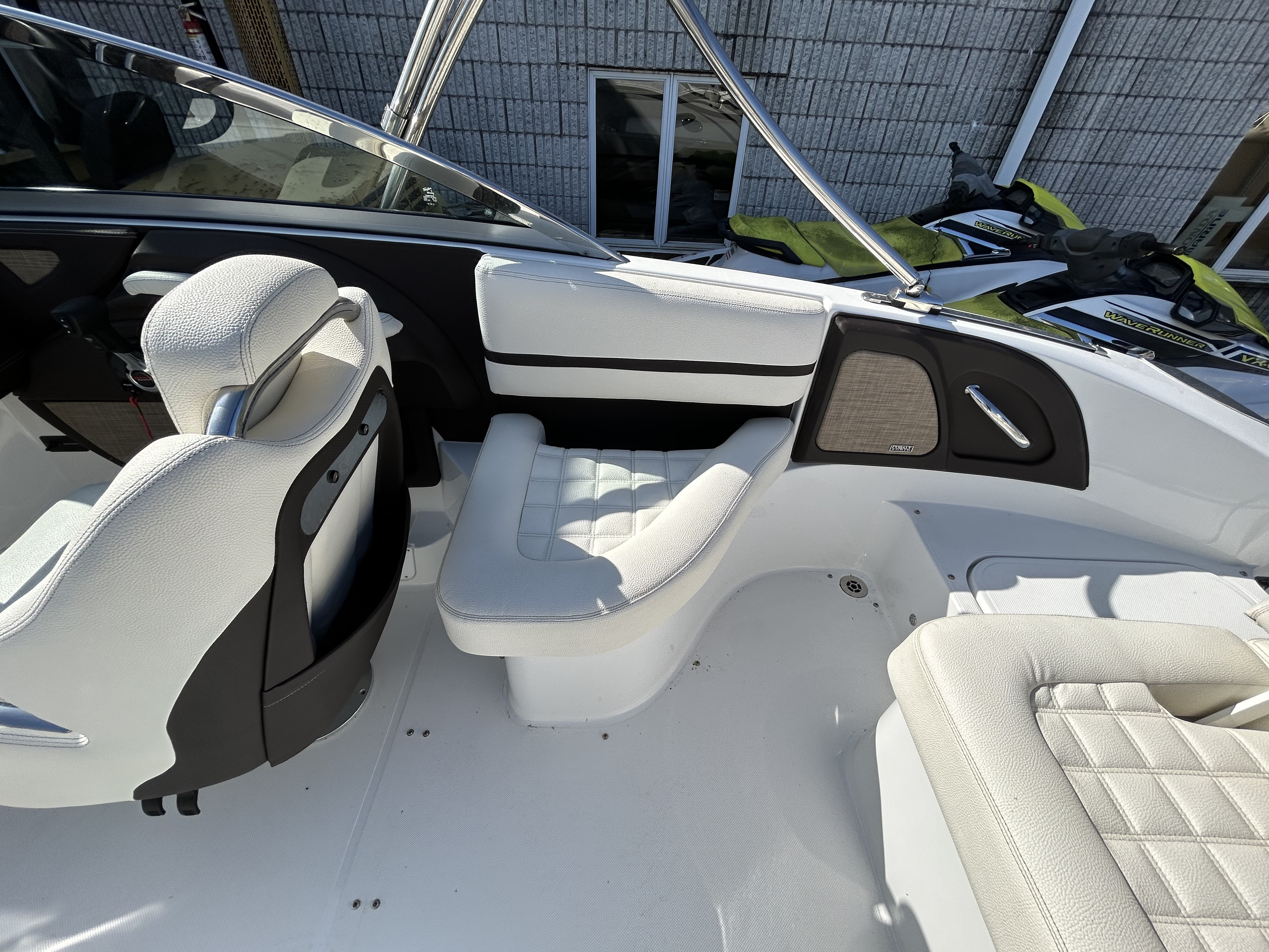 Call to make an offer today, 609-597-3488! This Cobalt Boats R3 Bowrider exterior profile is sleek and low. The transom, platform design and aft sunpad are sculpted beautifully creating a smooth and sexy profile. The sunpad backrest is convertible, and the rumble seat is simple and effective. As we step aboard through the walk-through transom, you will notice the cockpit has an interior beam measurement that is over a foot wider than any competitive runabout. This is no illusion. This interior expansion, Free Space Reclamation, is exactly what Cobalt’s build process creates. It is most noticeable in the cockpit, which is adorned with seating that wraps around the transom and the port side. The wrap-around yacht style seating is exclusive to a boat her size. Notice the attention to detail in the upholstery with the stitching in perfect harmony. The design of the passenger seat provides a completely innovative convertibility to the cockpit. At the helm, the aluminum dash panels, stainless switches, and form-fitted vinyl eyebrow are all highlighted by the 5? digital gauges with multi-function displays. The six-speaker Rockford Fosgate stereo with Bluetooth, provides fidelity the audiophiles will appreciate. Feel the leather wrapped wheel, sit in comfort at the helm and utilize the perfectly placed armrest, and ergonomically positioned footrest. Everything fits, everything Cobalt.