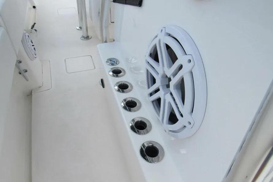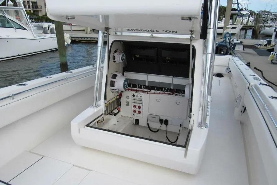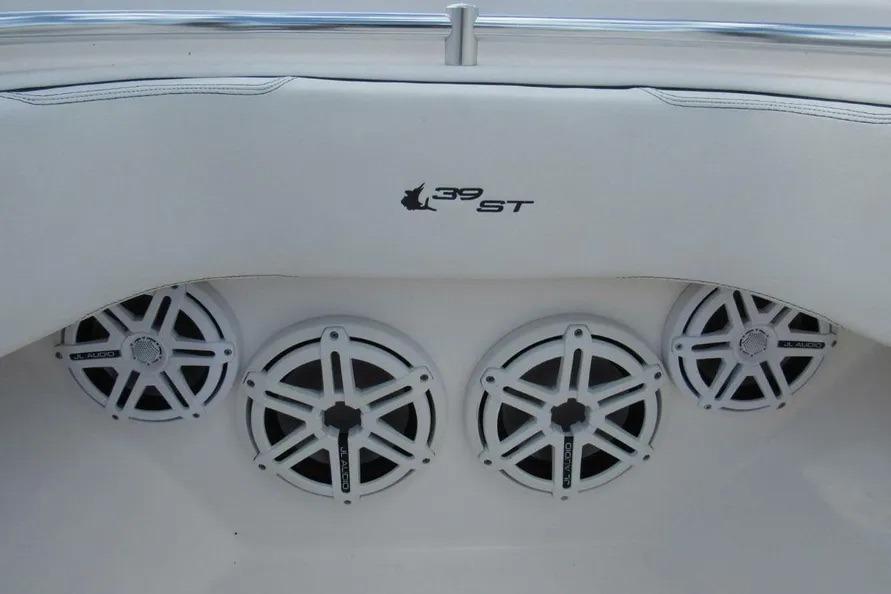 Built to run wide and fish hard, this 39 ST checks the big boxes: an indoor-kept, no-bottom-paint hull finished in white with black accents, true high-30s/40-kn cruise, and serious range on a 500-gal tank. The helm is dialed with a full Simrad package, dual 16" Evo3 displays backed by a 10 kW open-array radar, so plotting offshore routes and tracking weather is straightforward whether you’re tournament-bound or chasing a mid-week window.