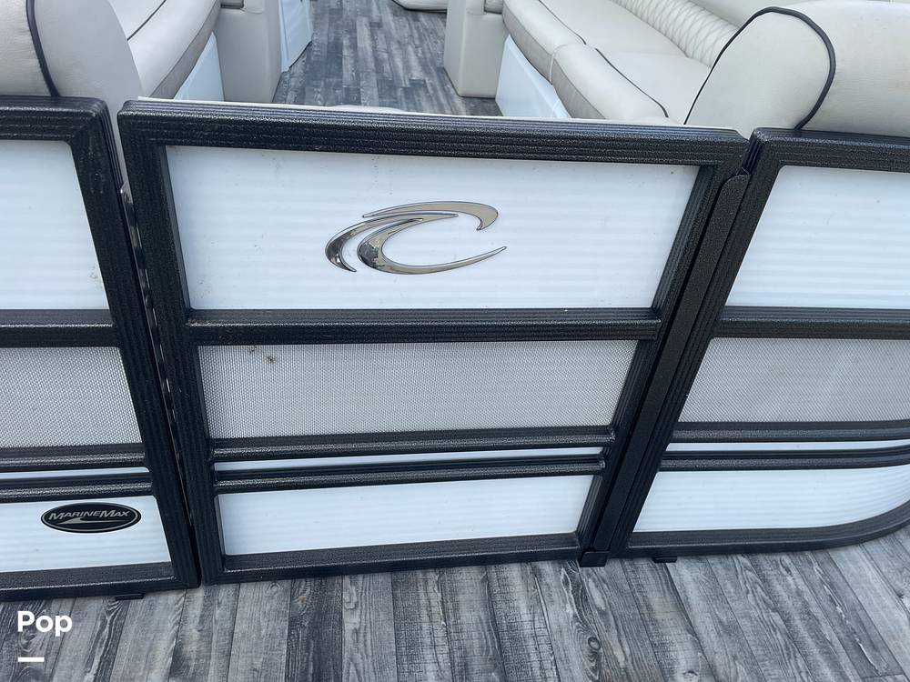 This boat has a number of premium features you won't find in the average tritoon, including 2 built-in coolers in the bow seating area, a SIMRAD GPS/plotter in the dash, a large ski tow bar above the engine, and a shore power connection.