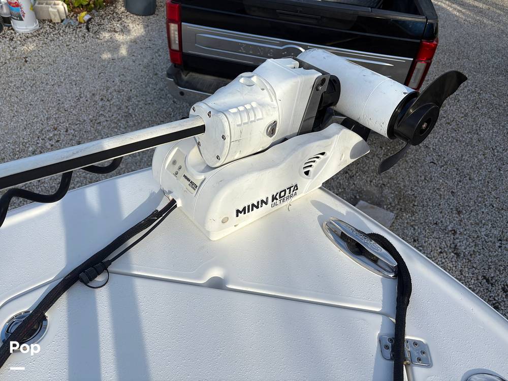Additional amenities comprise a custom fiberglass leaning post with tackle storage and rod holders, an electric slide sunroof on the hardtop, a 36-volt Minn Kota Terrova trolling motor powered by Lithium Pro batteries, and a three-bank Power Pole charging system.