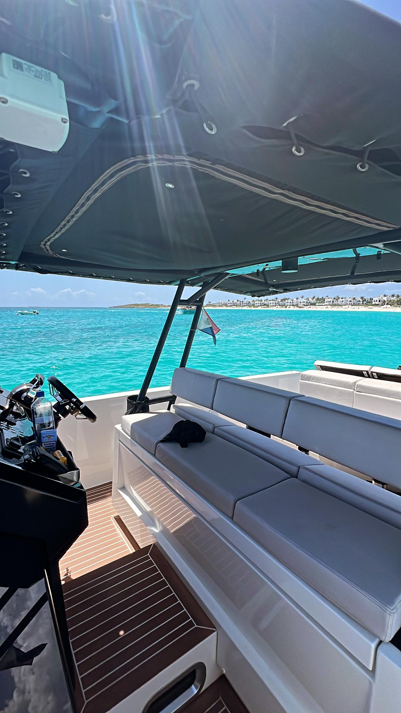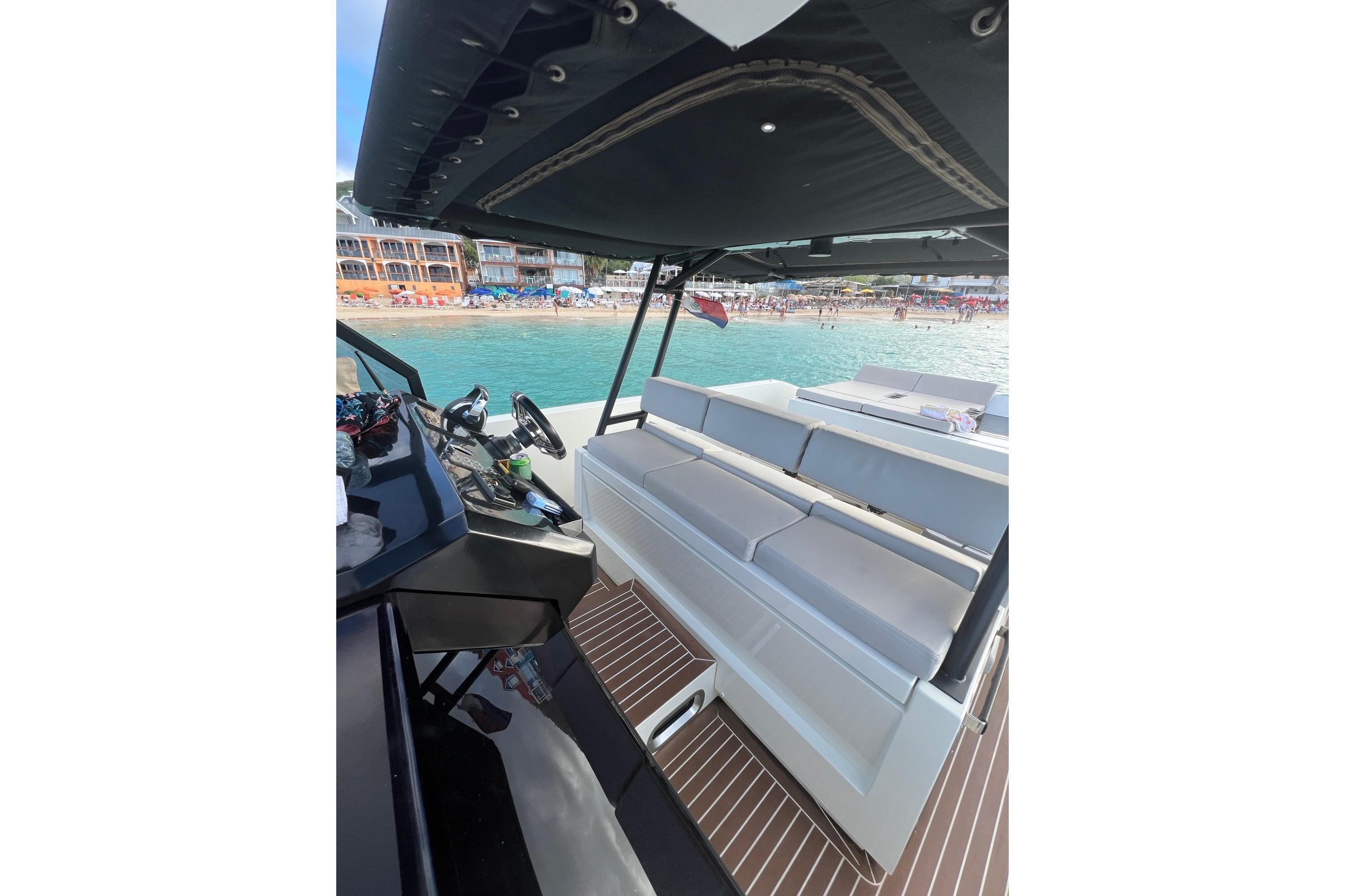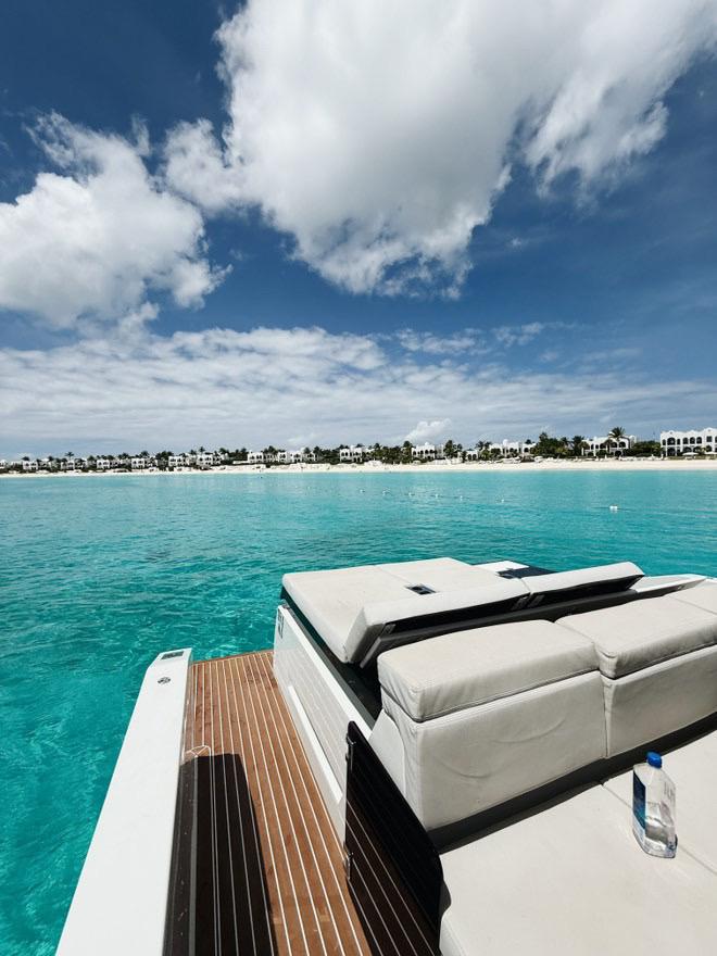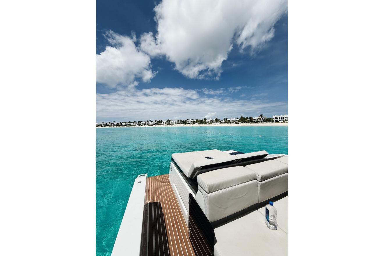 • Exterior: Spacious deck with relaxation areas, including bow and stern sundecks, and a convertible central seating area with a large table.