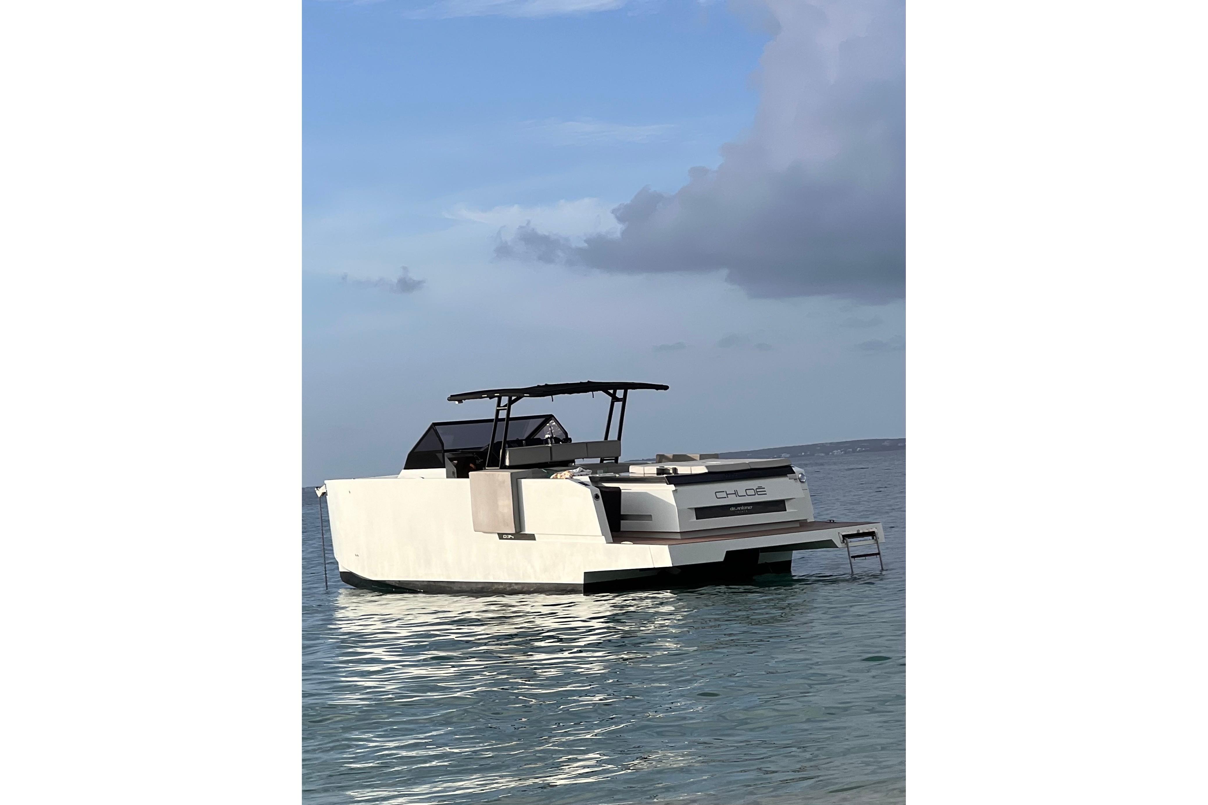 • Interior: Modern and minimalist design featuring quality wood finishes, ample natural light through large portholes, a compact kitchen, and a well-appointed bathroom.