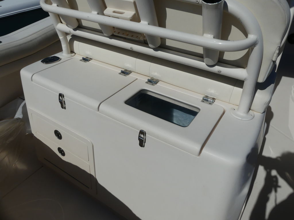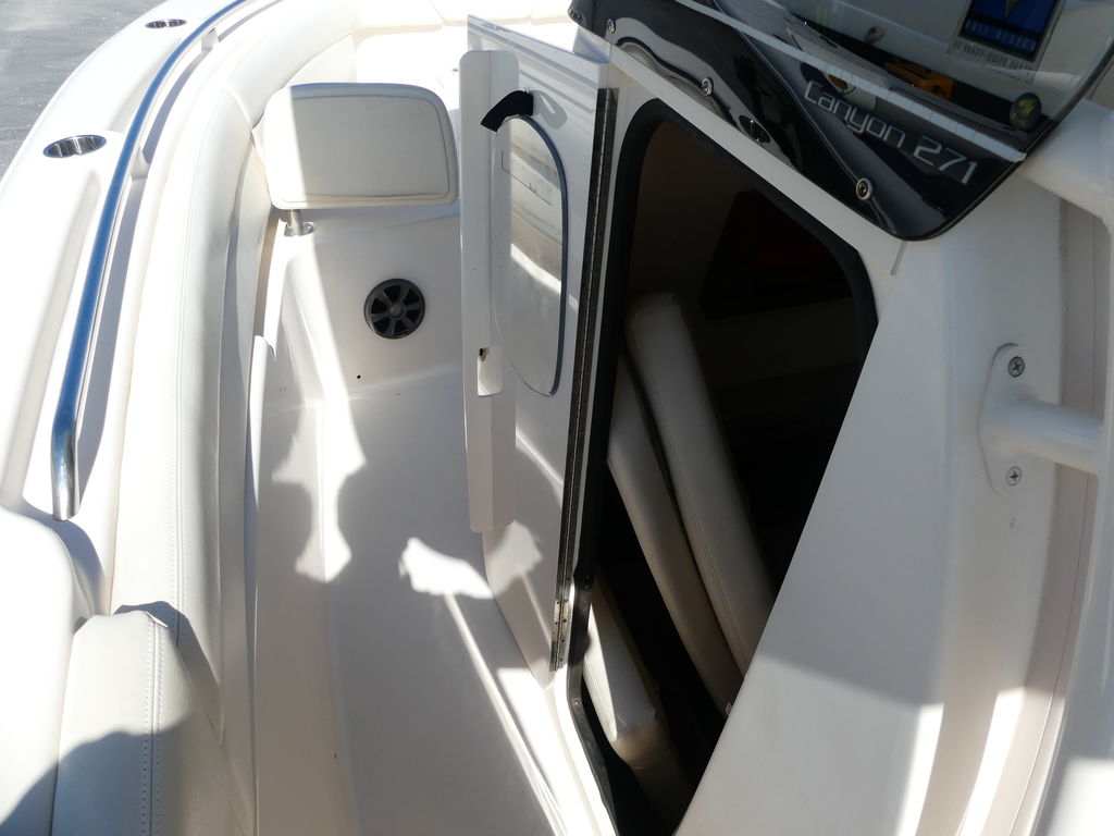 Grady-White produces another great-riding premium saltwater sportfishing boat, the 27-foot center console Canyon 271! The 271 features port and starboard bow fish boxes and cushioned seating with forward facing fold away backrests, plus a forward console seat with cooler underneath—increasing bow seating capacity from two to five or more people. New T-top integrated windshield design, too!