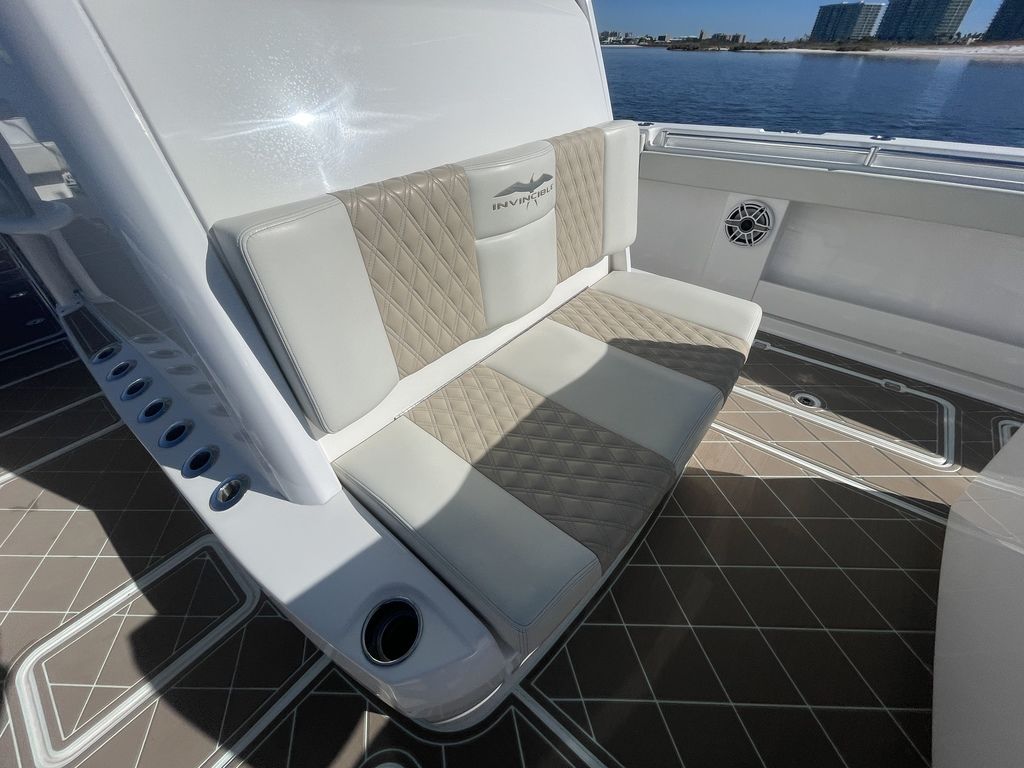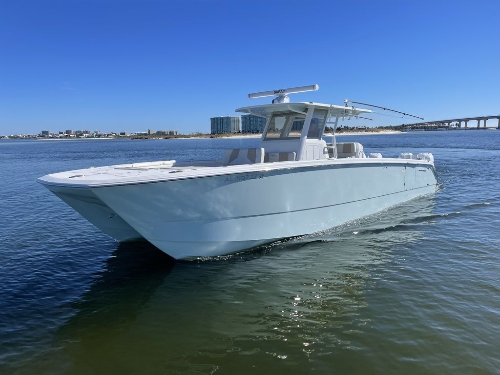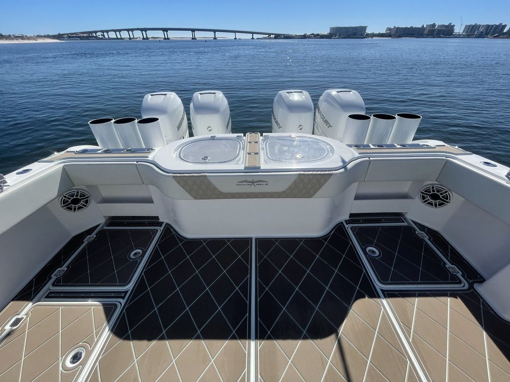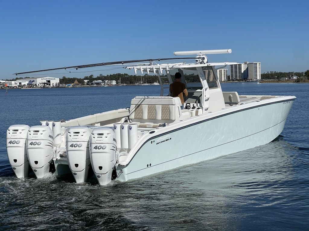 This pre-owned 2019 Invincible 40 Catamaran comes powered by quad 400 Mercury Verado's with around 800 hours and has an Aqua Mist colored hull. It has an 800 gallon fuel capacity and comes loaded with options. The installed options include: Twin 24" Simrad Displays, Simrad 4 FT Open Array Radar, Simrad Autopilot, Optimus Steering with joystick Piloting, FLIR Thermal Imaging, Twin Simrad VHF Radio, Extreme JL Audio Stereo Package, 6 Tuna tubes, Gemlux Bluewater Outrigger Bases w/ Carbon Fiber Poles, navigation lights in hard top, LED lights under hardtop, LED spreader lights, Gem Lux carbon-fiber outriggers, rod holders for back of hardtop, windshield enclosure, powder coating package, deluxe back to back helm seat w/ built-in cooler, deluxe flat-back tackle station, coffin box w/ cushions and backrest, diamond stitching upholstery, 26 rod holders on side of gunnel, 7 rod holders on console, 14 rod holders on coffin box, heavy duty swivel rod holders, large Seachest w/ 6 livewell pumps, clear plexiglass lid for livewells, diaphragm pump for rear fish box, insulated front fish box, 4 electric reel outlets, 30 AMP w/ cover, 70 gallon in floor livewell, fancy rigid rubrail w/ stainless steel inserts, dive door w/ dive ladder, freshwater washdown, hose coil kits for fresh and salt water washdowns, additional hose coil kit, deluxe electric head in console, LED underwater lights, extra AGM battery, Odyssey PC and a battery charger w/ Galvanic isolator. www.grandermarine.com | 251-271-0166