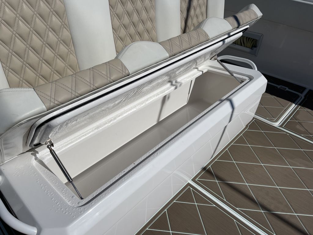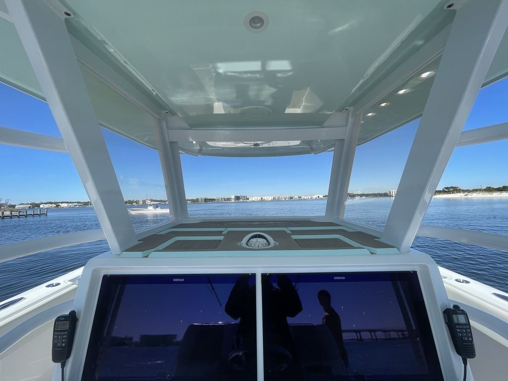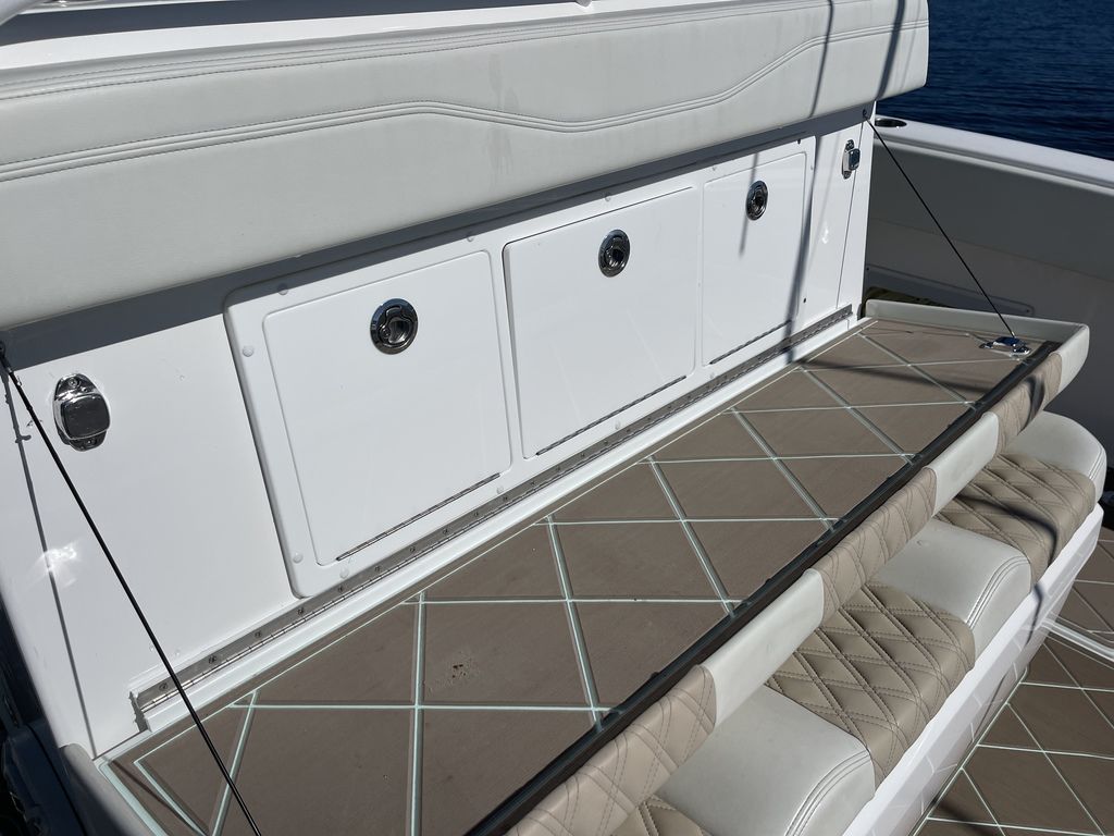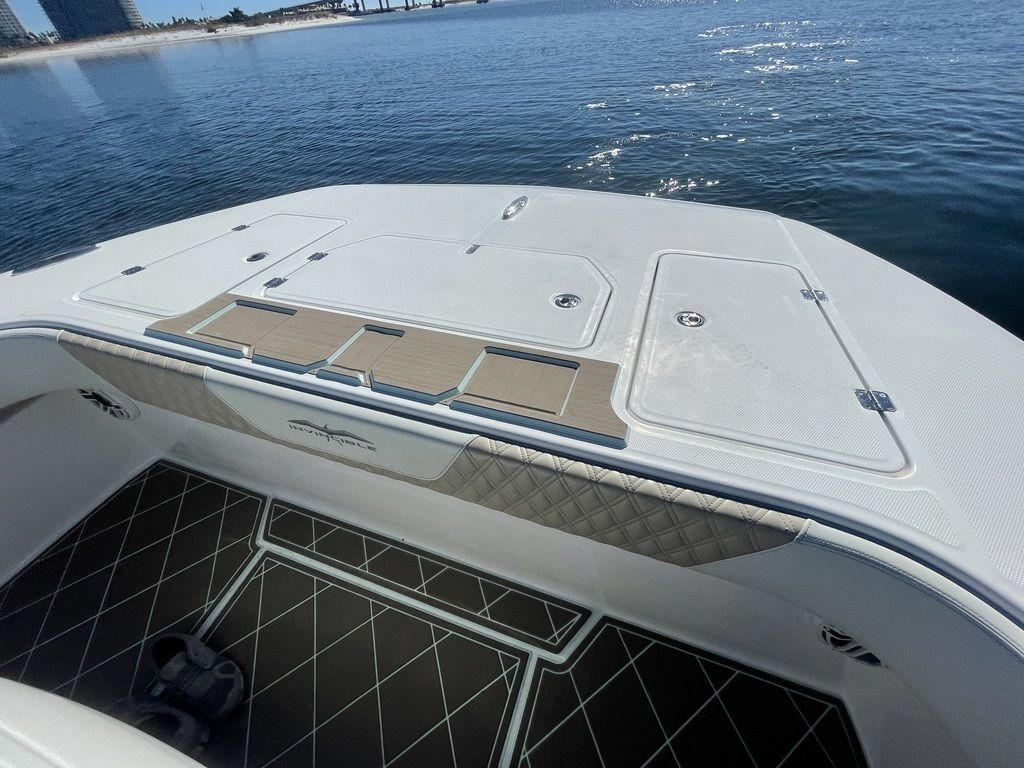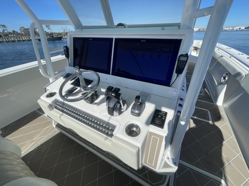 This pre-owned 2019 Invincible 40 Catamaran comes powered by quad 400 Mercury Verado's with around 800 hours and has an Aqua Mist colored hull. It has an 800 gallon fuel capacity and comes loaded with options. The installed options include: Twin 24" Simrad Displays, Simrad 4 FT Open Array Radar, Simrad Autopilot, Optimus Steering with joystick Piloting, FLIR Thermal Imaging, Twin Simrad VHF Radio, Extreme JL Audio Stereo Package, 6 Tuna tubes, Gemlux Bluewater Outrigger Bases w/ Carbon Fiber Poles, navigation lights in hard top, LED lights under hardtop, LED spreader lights, Gem Lux carbon-fiber outriggers, rod holders for back of hardtop, windshield enclosure, powder coating package, deluxe back to back helm seat w/ built-in cooler, deluxe flat-back tackle station, coffin box w/ cushions and backrest, diamond stitching upholstery, 26 rod holders on side of gunnel, 7 rod holders on console, 14 rod holders on coffin box, heavy duty swivel rod holders, large Seachest w/ 6 livewell pumps, clear plexiglass lid for livewells, diaphragm pump for rear fish box, insulated front fish box, 4 electric reel outlets, 30 AMP w/ cover, 70 gallon in floor livewell, fancy rigid rubrail w/ stainless steel inserts, dive door w/ dive ladder, freshwater washdown, hose coil kits for fresh and salt water washdowns, additional hose coil kit, deluxe electric head in console, LED underwater lights, extra AGM battery, Odyssey PC and a battery charger w/ Galvanic isolator. www.grandermarine.com | 251-271-0166