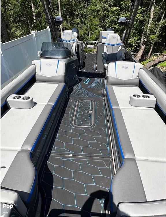 With its sleek black hull, striking blue interior, and snap-in black Seadek flooring, this Manitou SHP Tritoon is the definition of a head-turner. It's a boat designed to look as sharp as it performs, with every detail built for those who demand more than just a day on the water. From its bold style to its raw power, this tritoon delivers the perfect mix of luxury, speed, and fun.