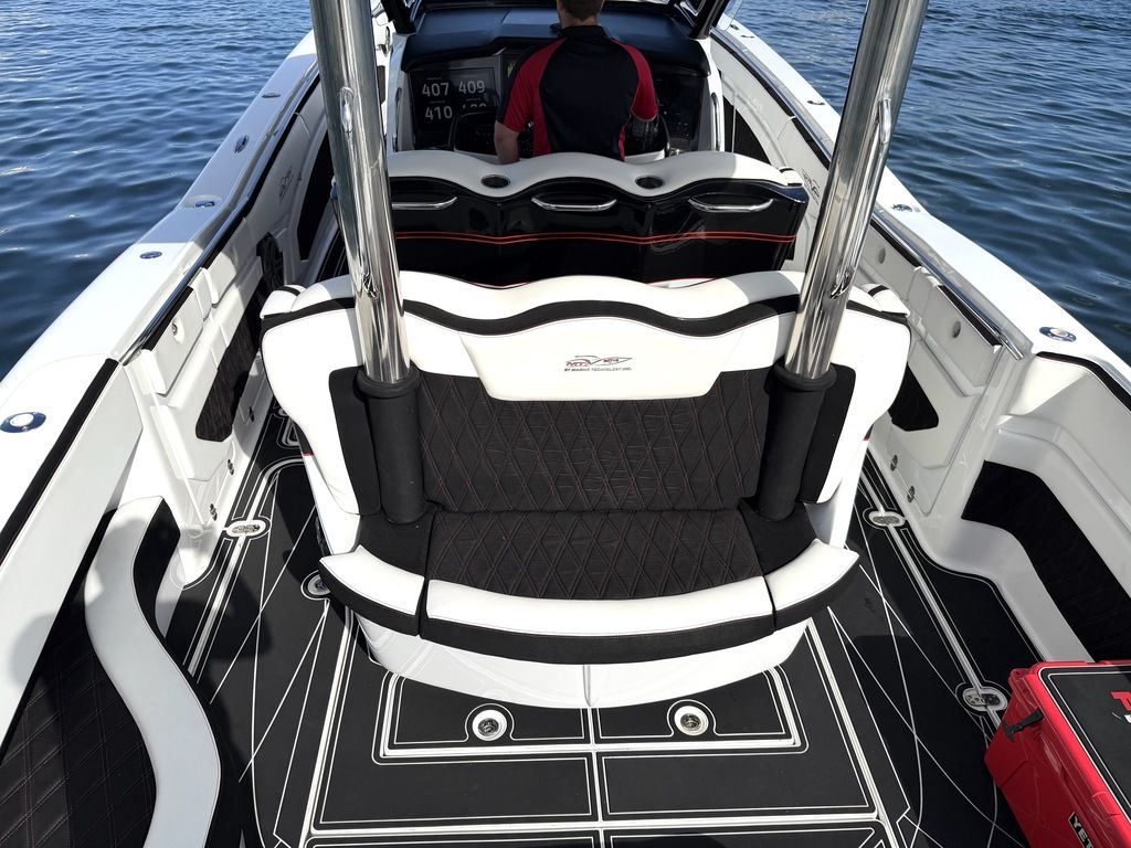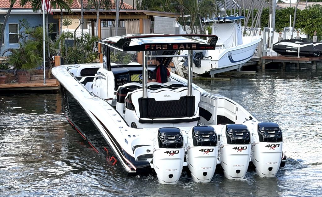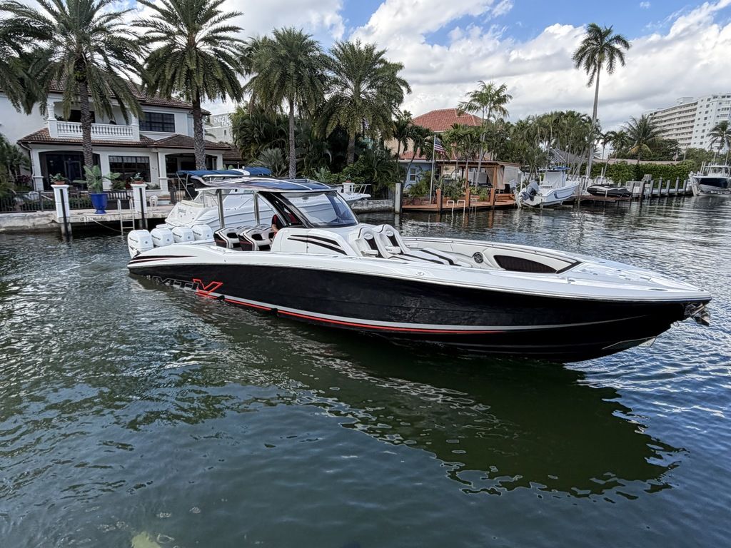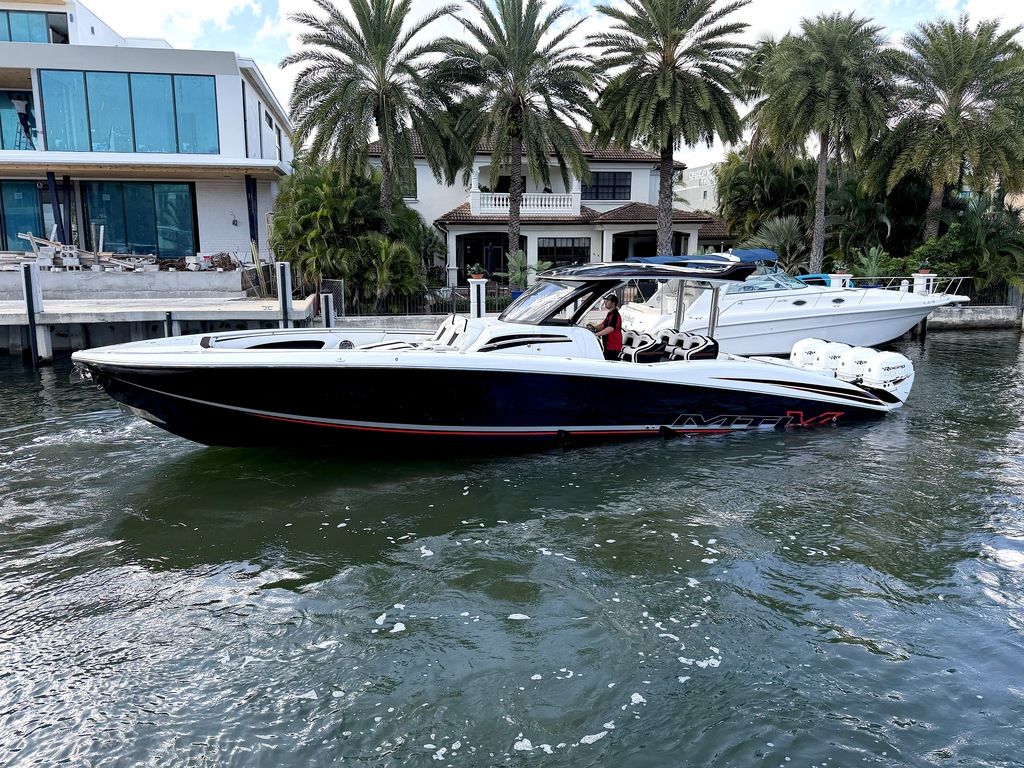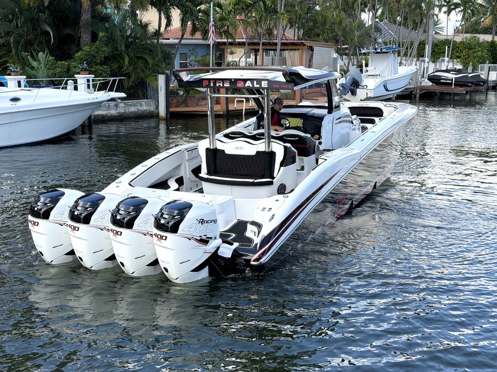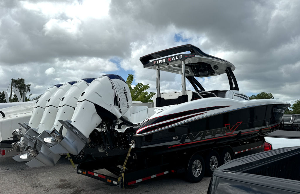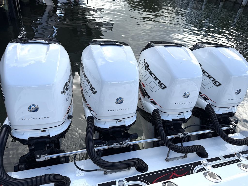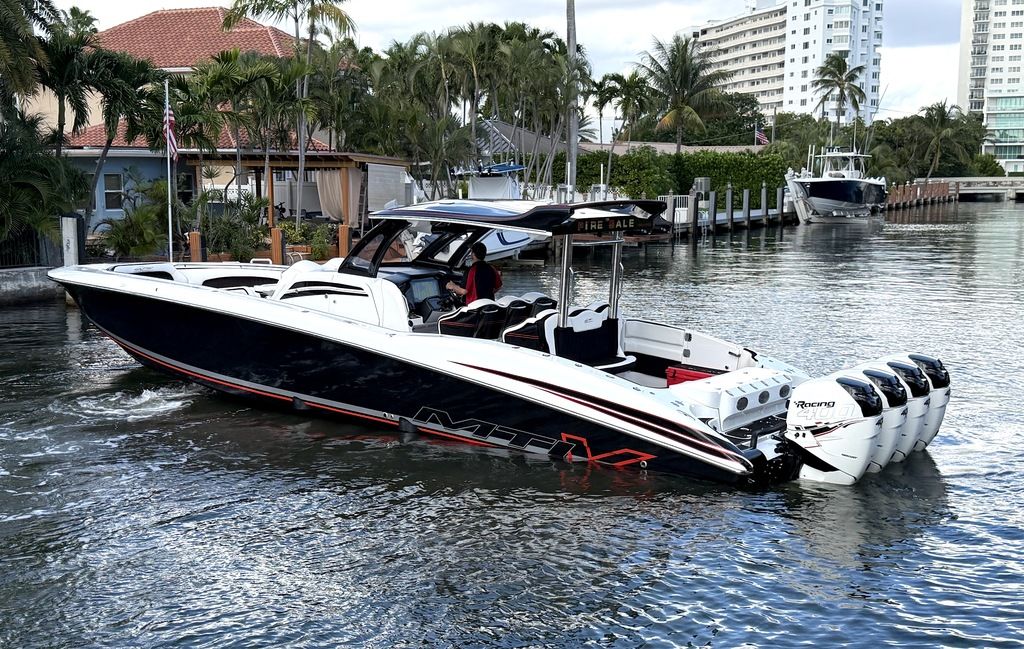 2019 MTI-V 42 with 410 hours on Quad White Mercury Racing 400Rs on STR Jack Plates. Full engine services just completed. Extensively updated throughout with new interior. Bow Thruster, Anchor Windlass, Triple Garmin GPS' at helm, Underwater Lights with control on GPS screen, Console Wind Deflectors, Rear Facing seat with Cooler, Custom ordered as a Yacht Tender originally, Towing Eye, XSF Hard Top with Light Bar and Alcantara Headliner to match upholstery. Mattress deleted from original build with rod storage in lieu of mattress. Refrigerator in Cabin, Red graphics are vinyl over the black, silver and pearl white paint, Price includes Black Aluminum Myco Trailer