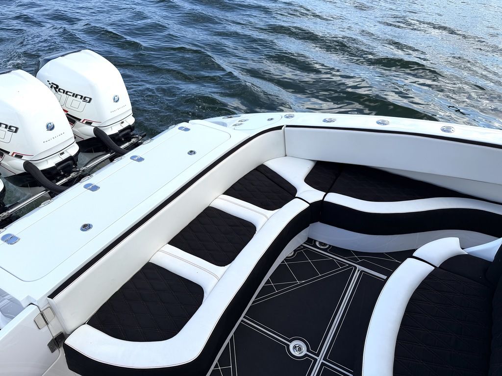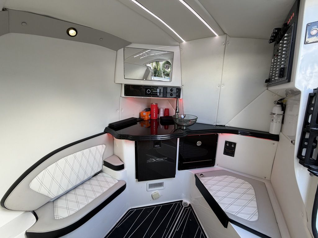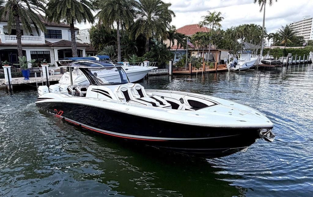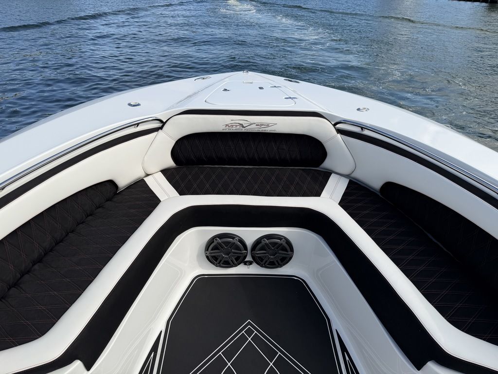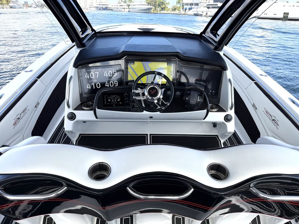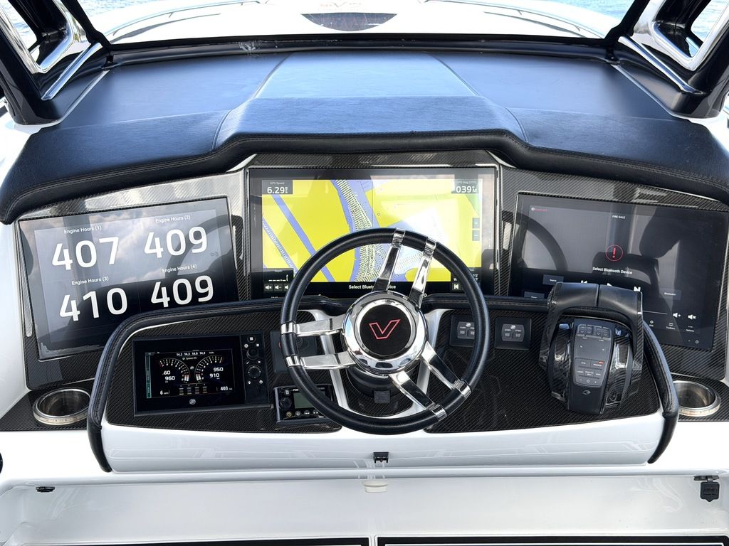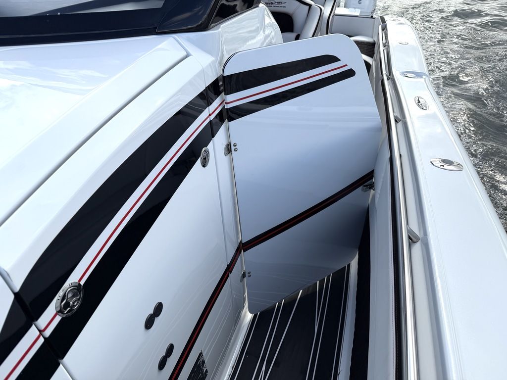 2019 MTI-V 42 with 410 hours on Quad White Mercury Racing 400Rs on STR Jack Plates. Full engine services just completed. Extensively updated throughout with new interior. Bow Thruster, Anchor Windlass, Triple Garmin GPS' at helm, Underwater Lights with control on GPS screen, Console Wind Deflectors, Rear Facing seat with Cooler, Custom ordered as a Yacht Tender originally, Towing Eye, XSF Hard Top with Light Bar and Alcantara Headliner to match upholstery. Mattress deleted from original build with rod storage in lieu of mattress. Refrigerator in Cabin, Red graphics are vinyl over the black, silver and pearl white paint, Price includes Black Aluminum Myco Trailer