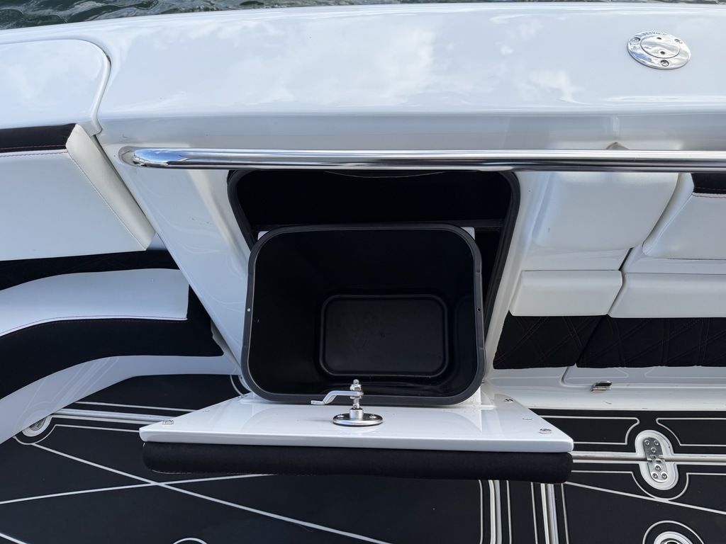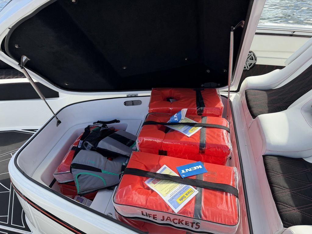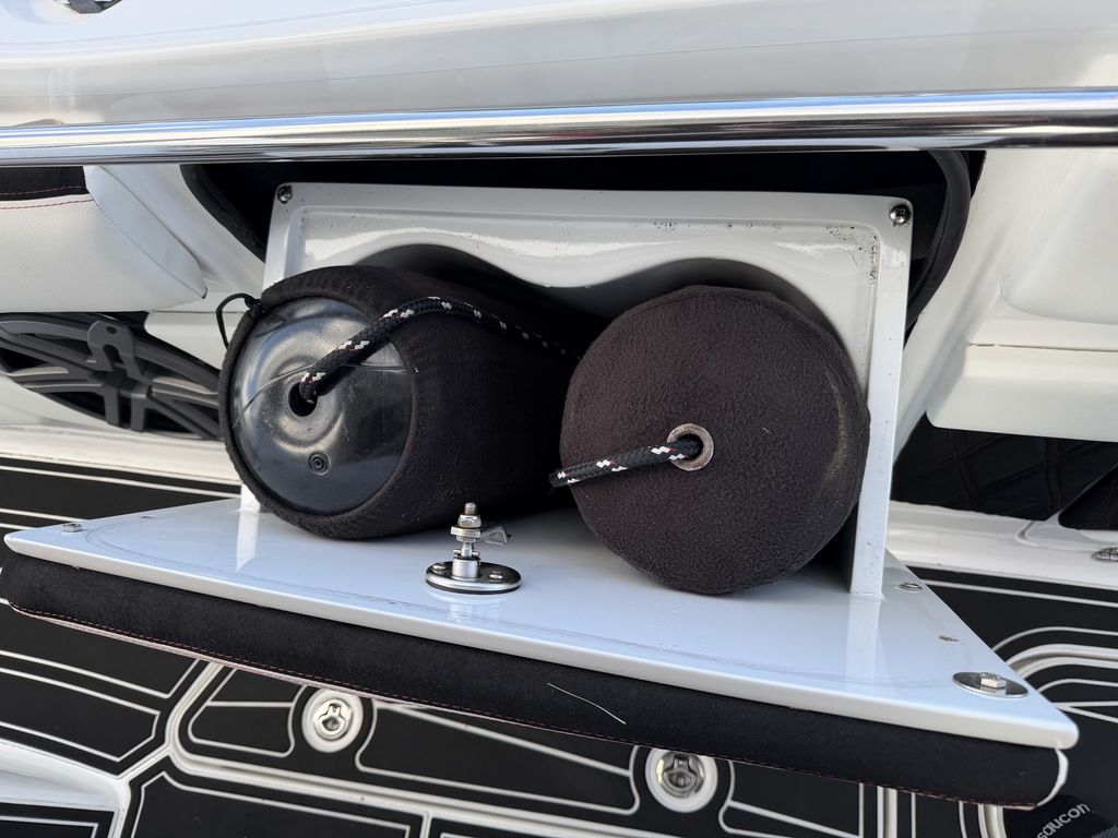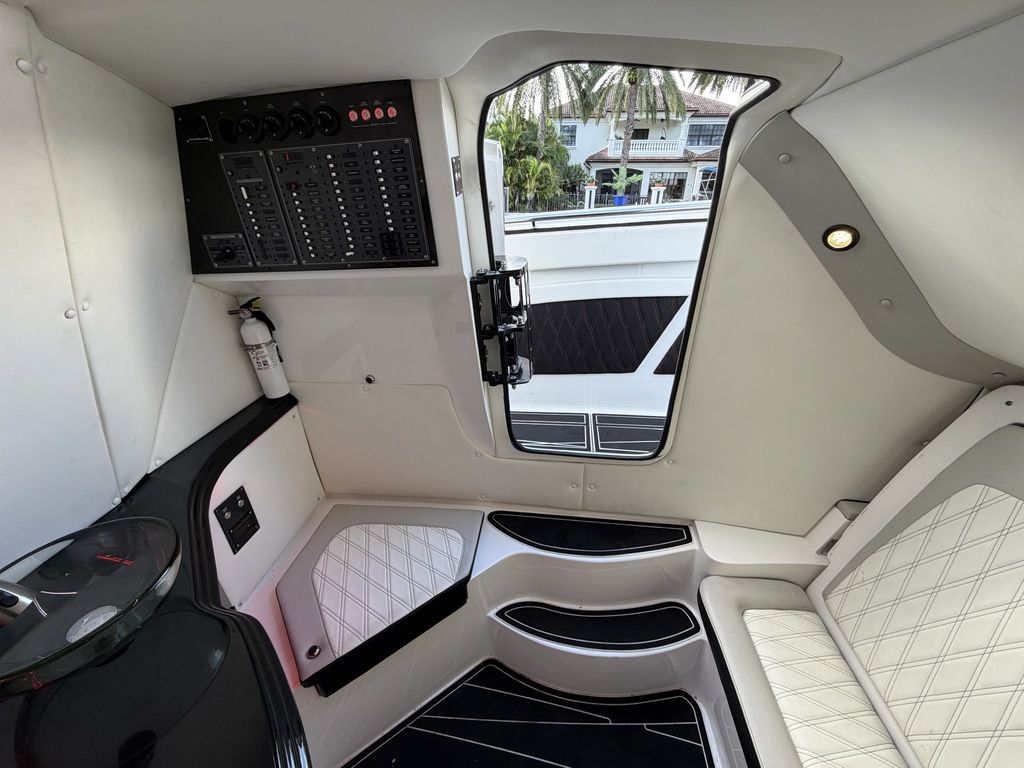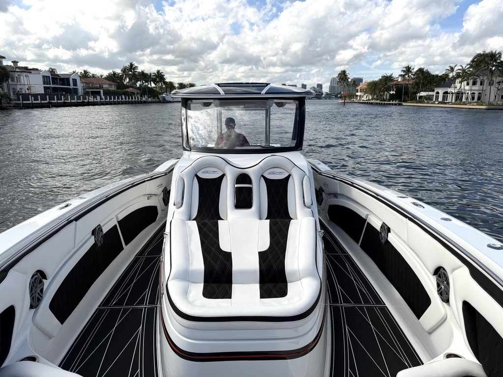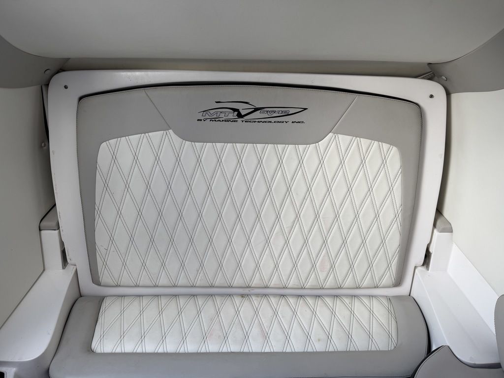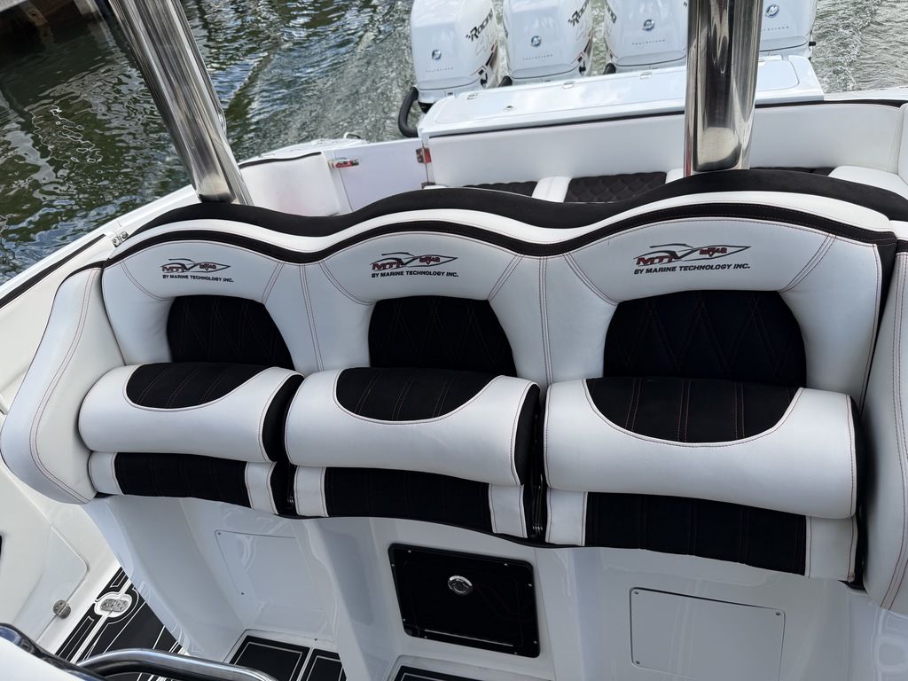 2019 MTI-V 42 with 410 hours on Quad White Mercury Racing 400Rs on STR Jack Plates. Full engine services just completed. Extensively updated throughout with new interior. Bow Thruster, Anchor Windlass, Triple Garmin GPS' at helm, Underwater Lights with control on GPS screen, Console Wind Deflectors, Rear Facing seat with Cooler, Custom ordered as a Yacht Tender originally, Towing Eye, XSF Hard Top with Light Bar and Alcantara Headliner to match upholstery. Mattress deleted from original build with rod storage in lieu of mattress. Refrigerator in Cabin, Red graphics are vinyl over the black, silver and pearl white paint, Price includes Black Aluminum Myco Trailer