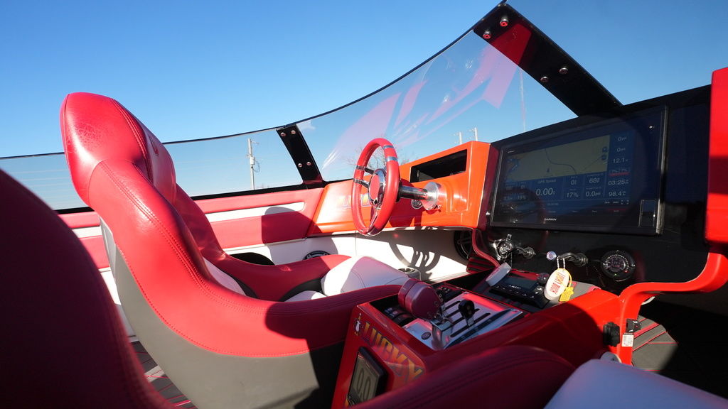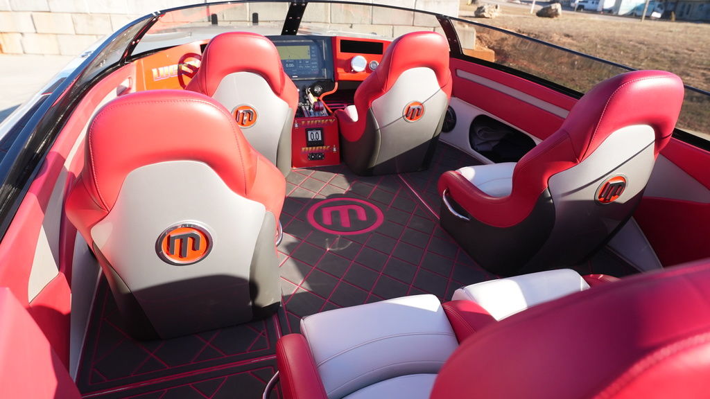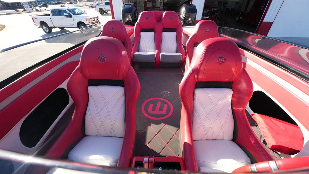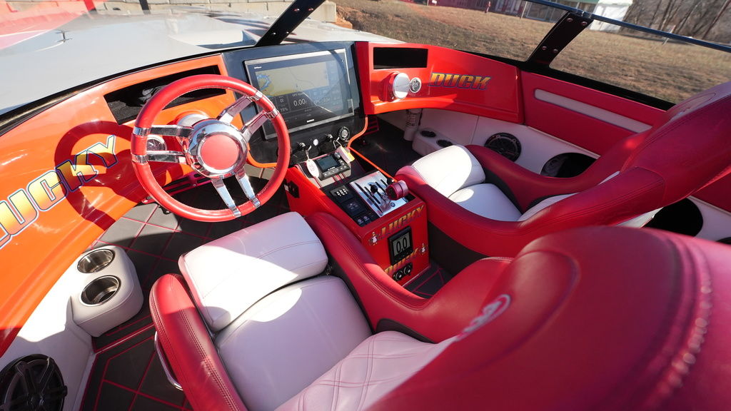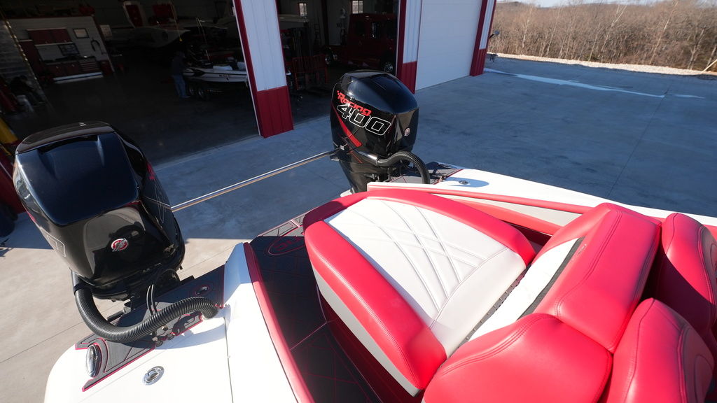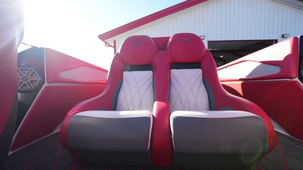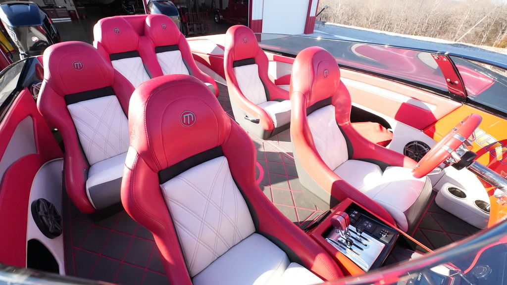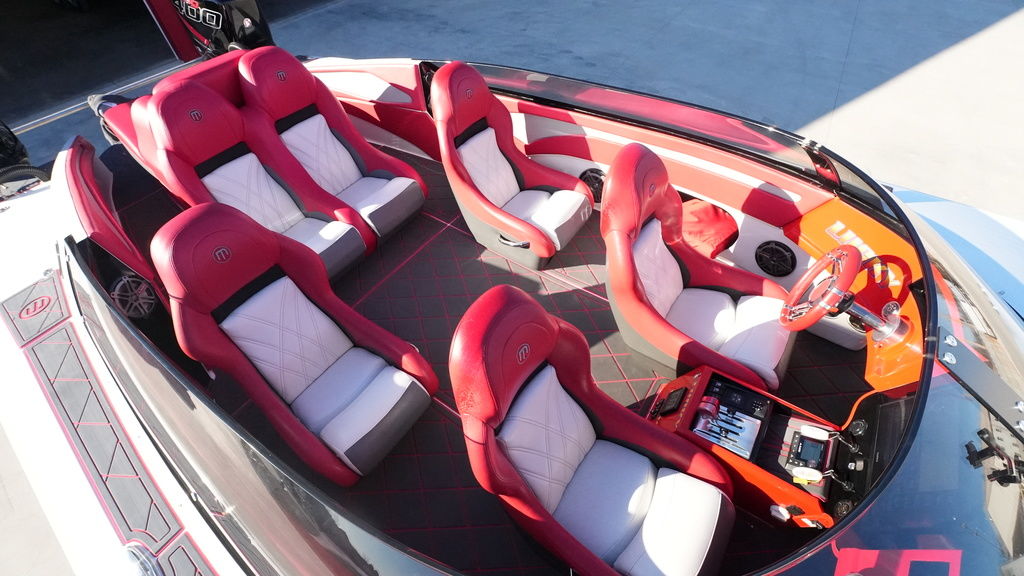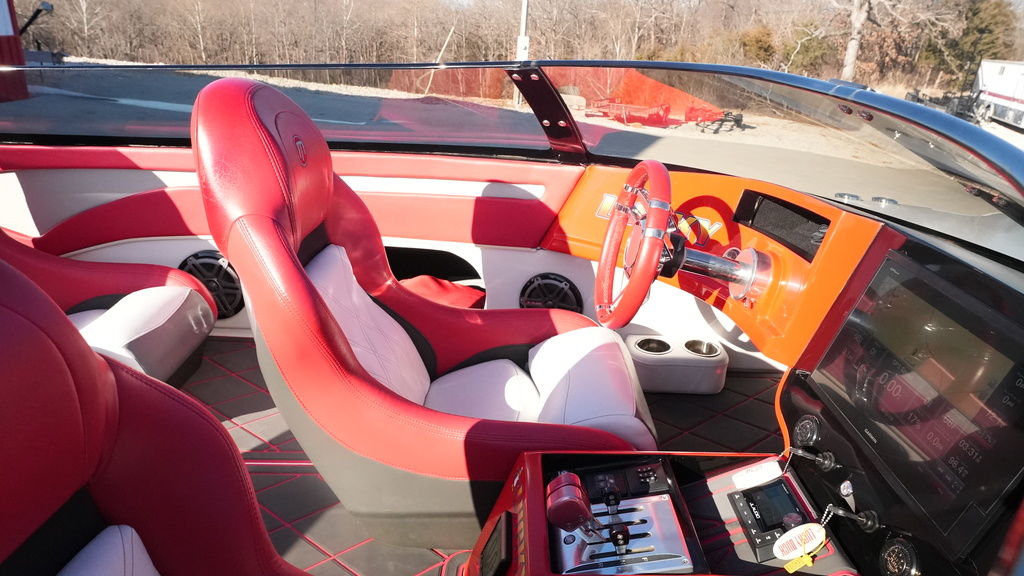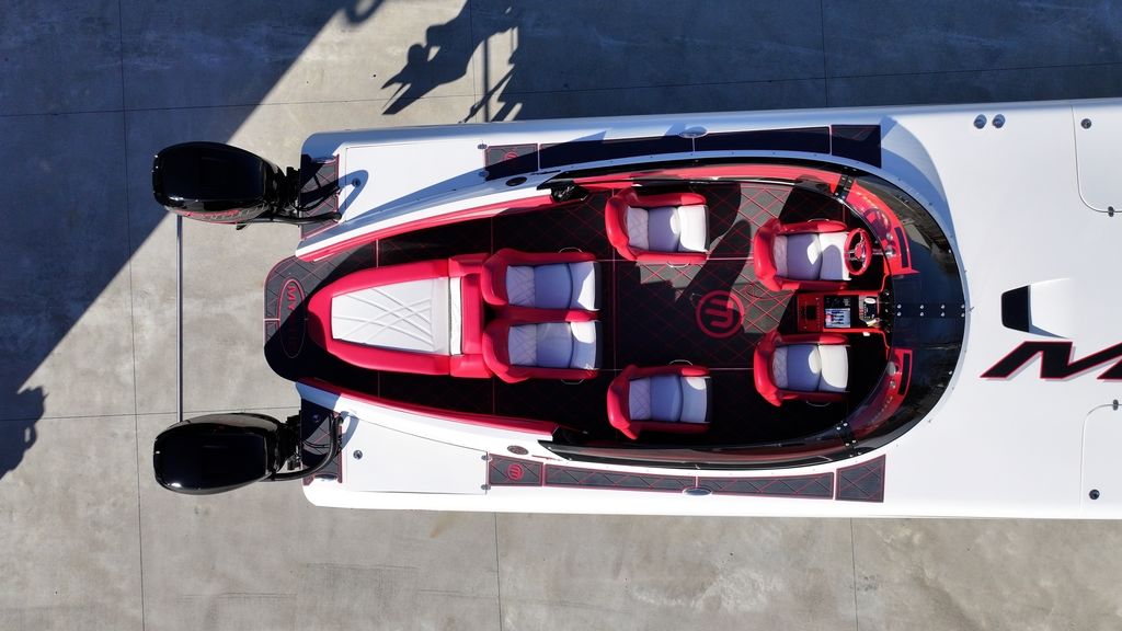 6 person cockpit, rear lounge seat, marine foam flooring throughout, transom walk through, custom color matched upholstery, touch screen Garmin, JL Audio sound system, dash blowers, stainless steel 5 blade props, stainless steel tie bar, manual jack plates.