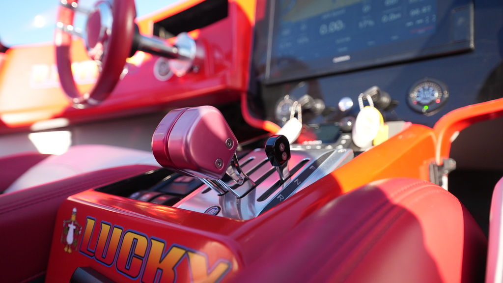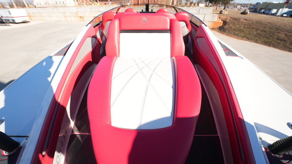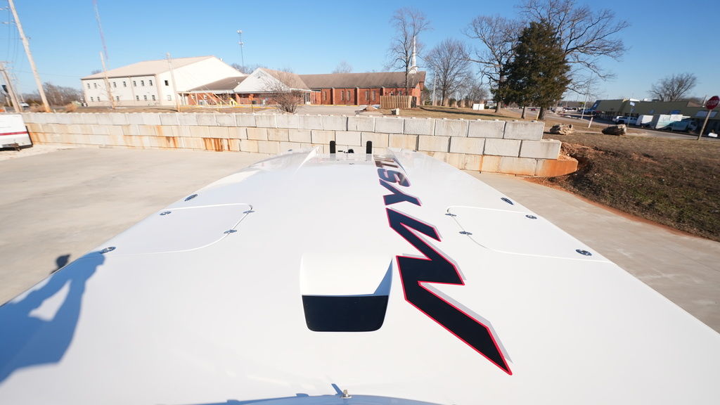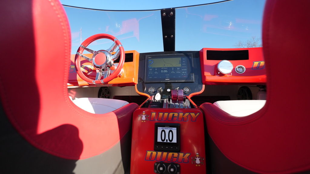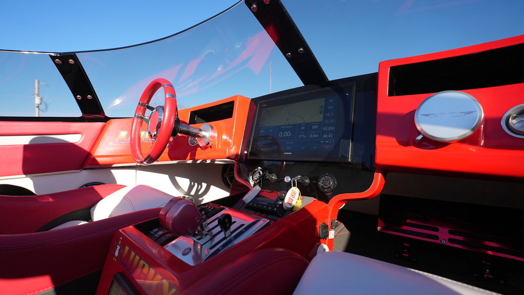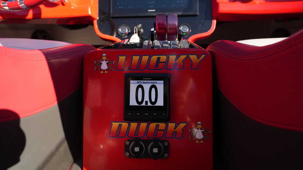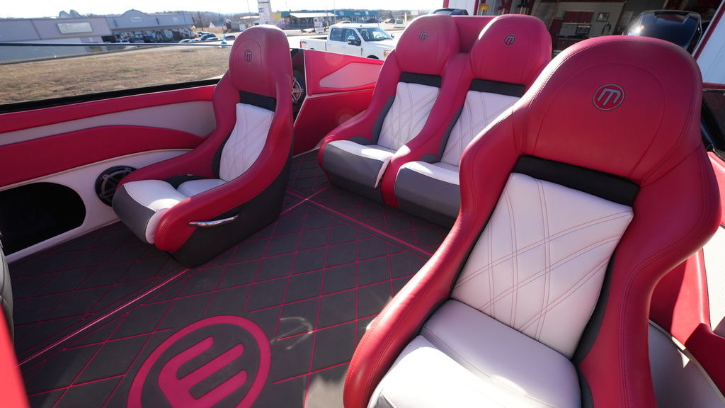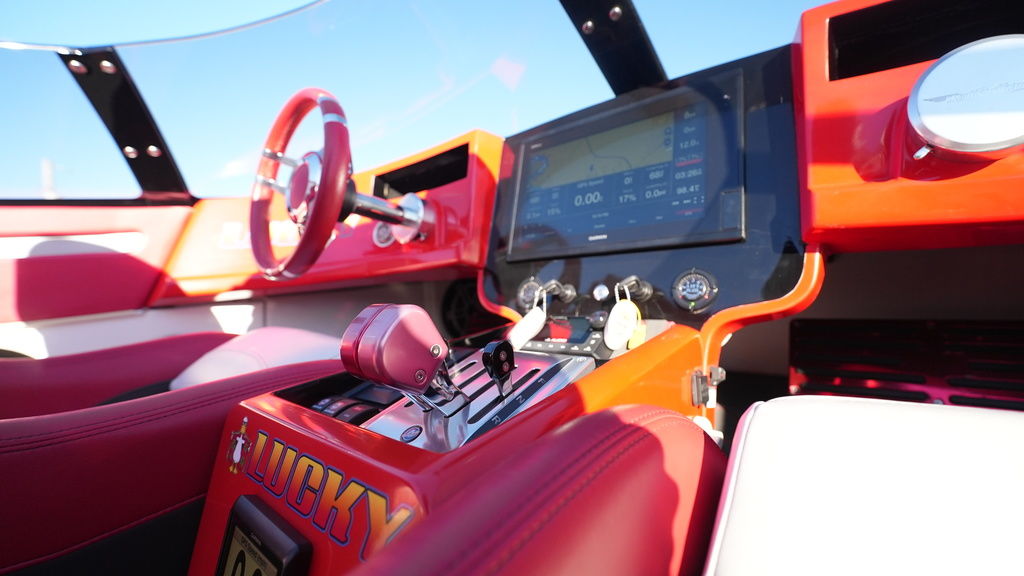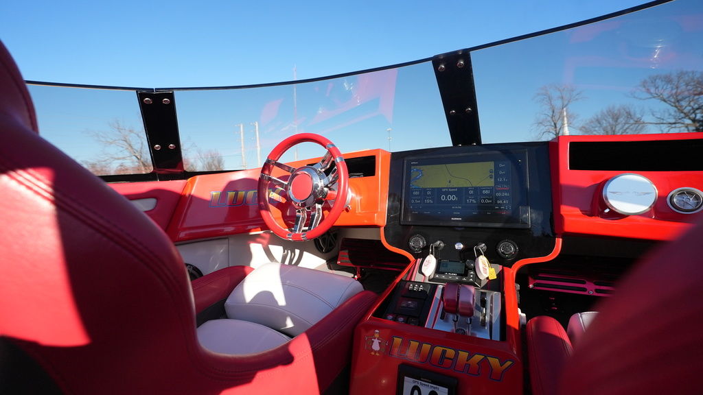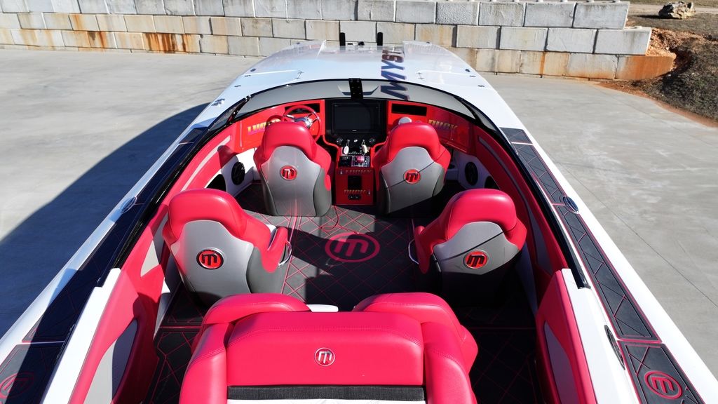 6 person cockpit, rear lounge seat, marine foam flooring throughout, transom walk through, custom color matched upholstery, touch screen Garmin, JL Audio sound system, dash blowers, stainless steel 5 blade props, stainless steel tie bar, manual jack plates.