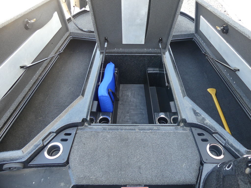 - Oversized lockable center bow storage locker