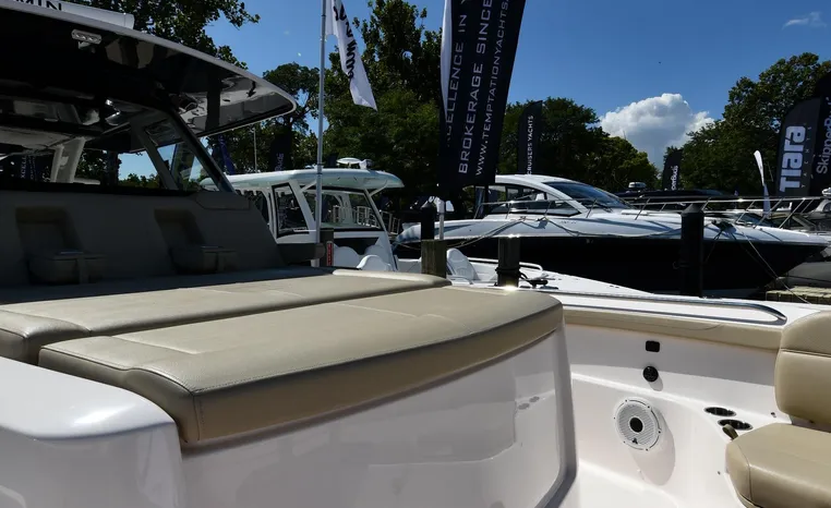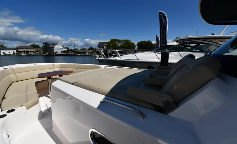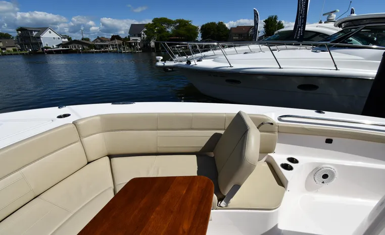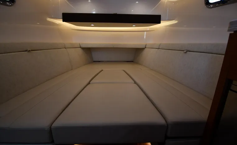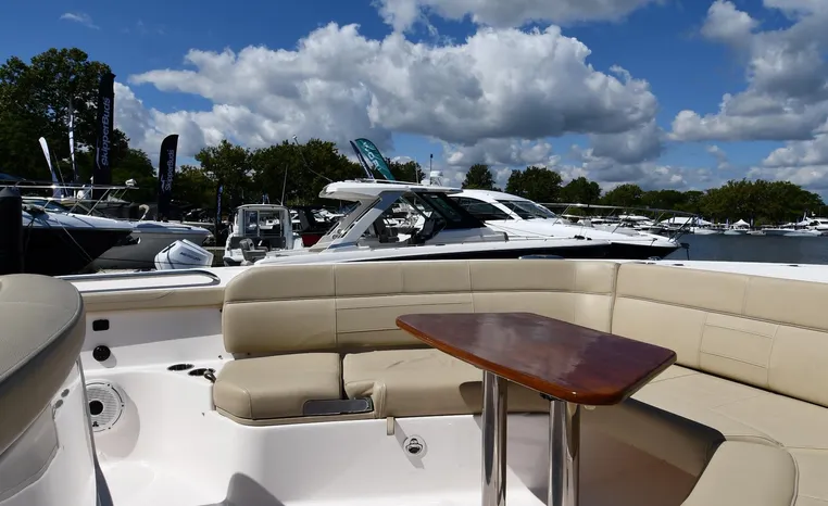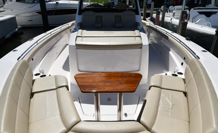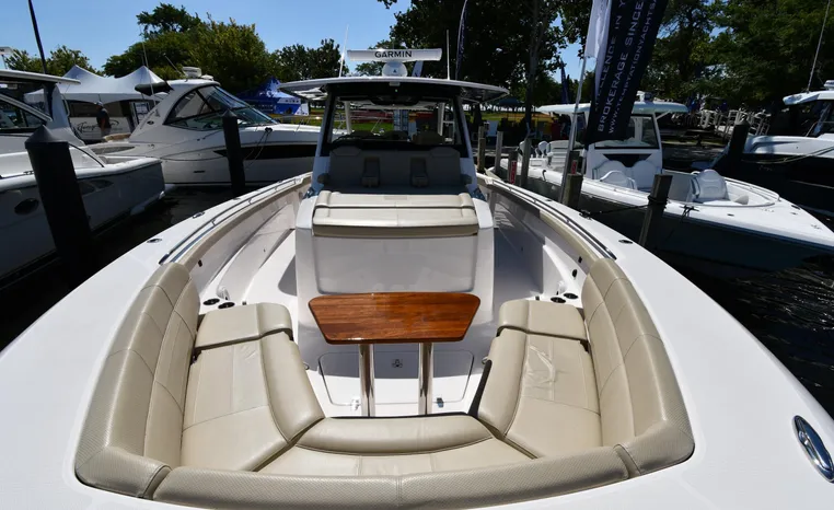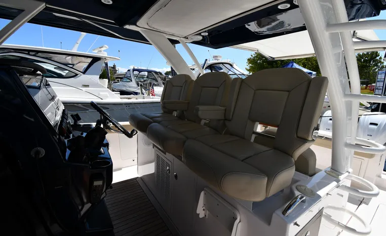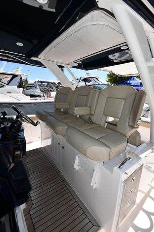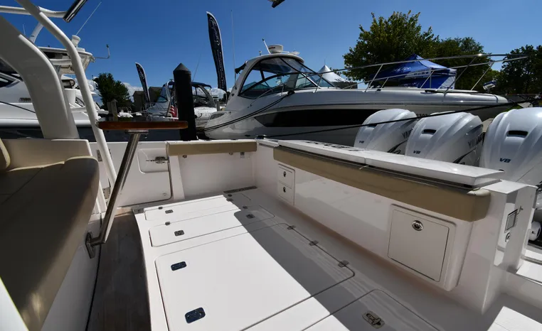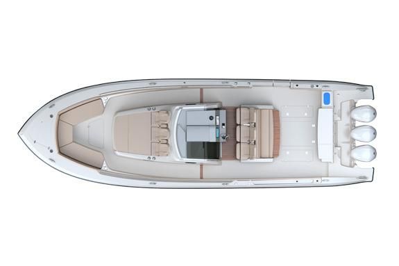Pursuit’s contribution to the yacht-class center console market, the S 408 is a big hybrid 42-footer designed for offshore fishing, entertaining and luxury day cruising. The spacious cockpit, comfortable forward lounging area, and roomy step-down cabin offer big-game fishermen and families alike exceptional center console versatility. A triple-seat helm arrangement provides plenty of room to enjoy operating the boat with friends and family nearby, and the uncluttered cockpit comes complete with an aft-facing mezzanine seat, hull side dive door, lighted 44-gallon transom live-well and insulated fish box. A transom rigging station with tackle storage doubles as an outdoor kitchen with Corian cutting board, electric grill, sink with hot and cold water faucet, and refrigerator/freezer with digital thermostat controlled from the cabin. A port-side transom door opens to the stern platform which extends well aft on each side of the motors in a design unique to Pursuit. Below, a well-appointed cabin with hardwood flooring offers wraparound seating that concerts to a V-berth, enclosed head and full-service galley.