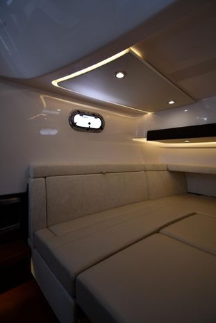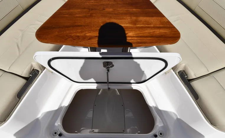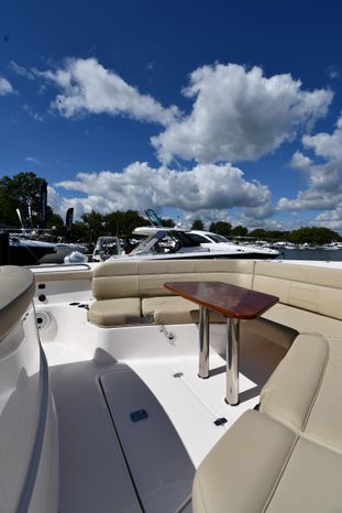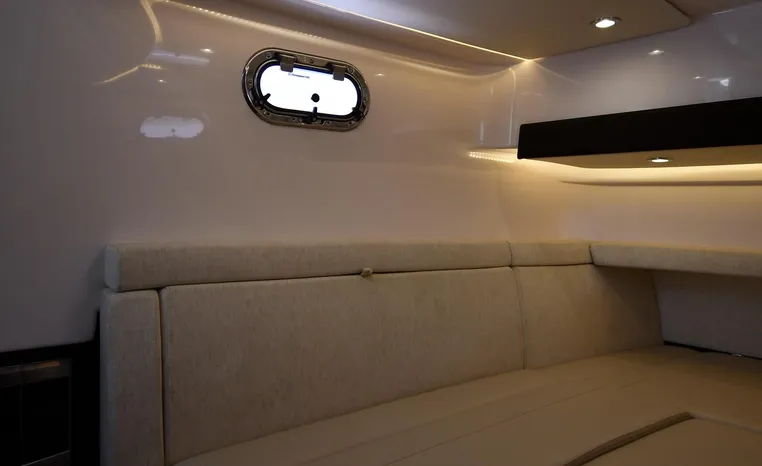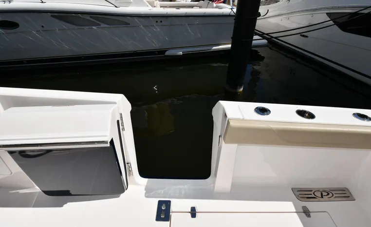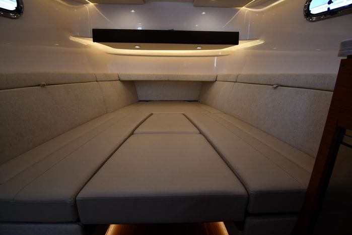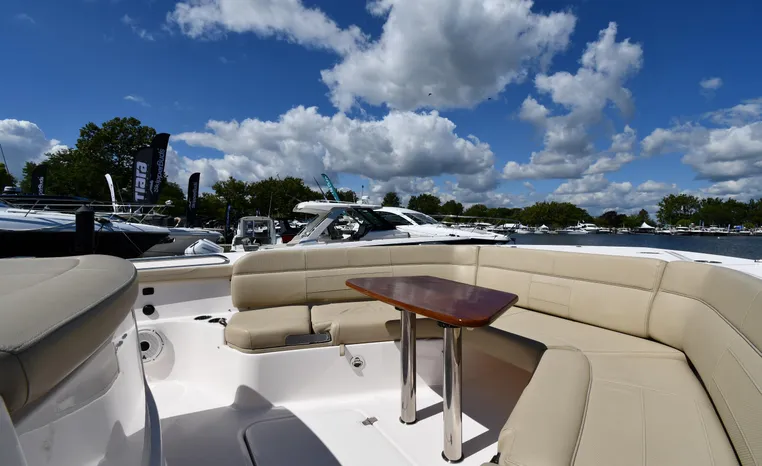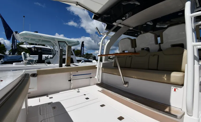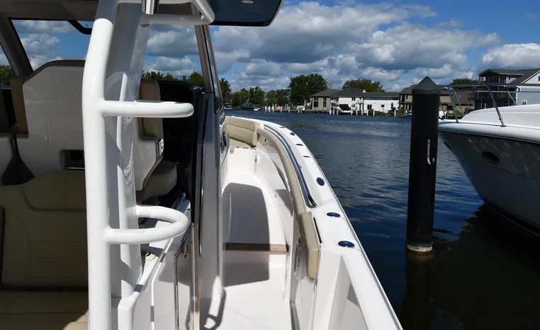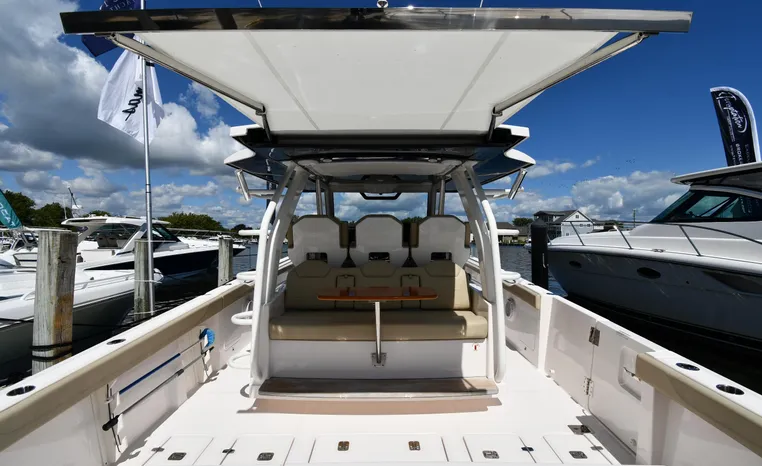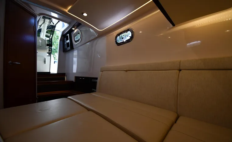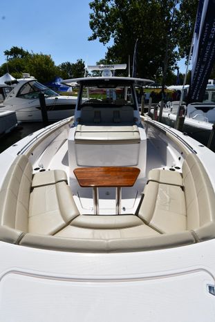 Pursuit’s contribution to the yacht-class center console market, the S 408 is a big hybrid 42-footer designed for offshore fishing, entertaining and luxury day cruising. The spacious cockpit, comfortable forward lounging area, and roomy step-down cabin offer big-game fishermen and families alike exceptional center console versatility. A triple-seat helm arrangement provides plenty of room to enjoy operating the boat with friends and family nearby, and the uncluttered cockpit comes complete with an aft-facing mezzanine seat, hull side dive door, lighted 44-gallon transom live-well and insulated fish box. A transom rigging station with tackle storage doubles as an outdoor kitchen with Corian cutting board, electric grill, sink with hot and cold water faucet, and refrigerator/freezer with digital thermostat controlled from the cabin. A port-side transom door opens to the stern platform which extends well aft on each side of the motors in a design unique to Pursuit. Below, a well-appointed cabin with hardwood flooring offers wraparound seating that concerts to a V-berth, enclosed head and full-service galley.