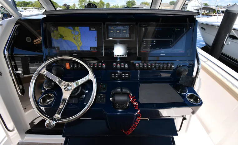 Features Triple Yamaha 425-hp Motors (Note Joy-Stick Piloting) with 700 original hours. Notable features include but are not limited to the following: Air-Conditioning & Heat (2-Units; Note Cockpit AC/Heat), Head (Vacuflush) w/Vanity/Sink/Shower, Windlass Anchor w/Polished Stainless-Steel Anchor, LewMar Bow-Thruster, Fischer Panda Generator (550-hrs.), Full Garmin NAV w/(2) Multi-Function Color / TouchScreen Display's w/Radar/GPS/Chartplotter, Autopilot, Premium Sound System w/Bluetooth, Starboard Dive Door, Cockpit Refrigerator, Cockpit Electric BBQ-Grill, Transom Live Well, and MUCH more!