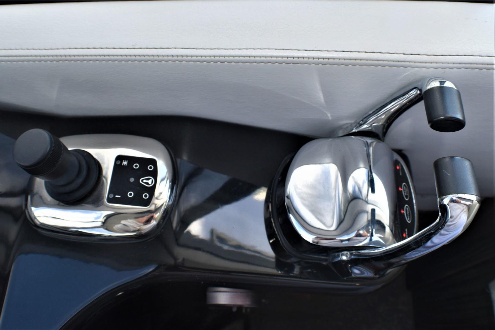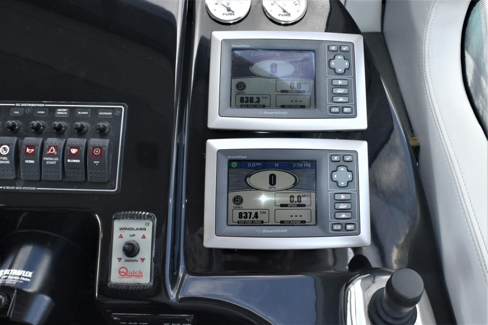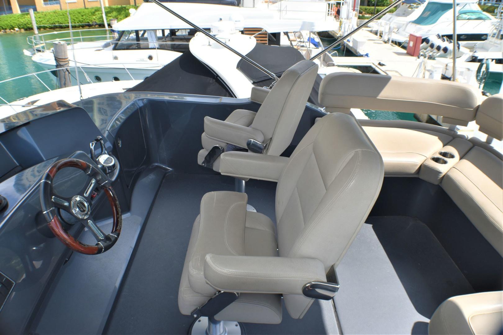 Flybridge with U-Shaped seating, Raymarine GPS, and joystick for docking.