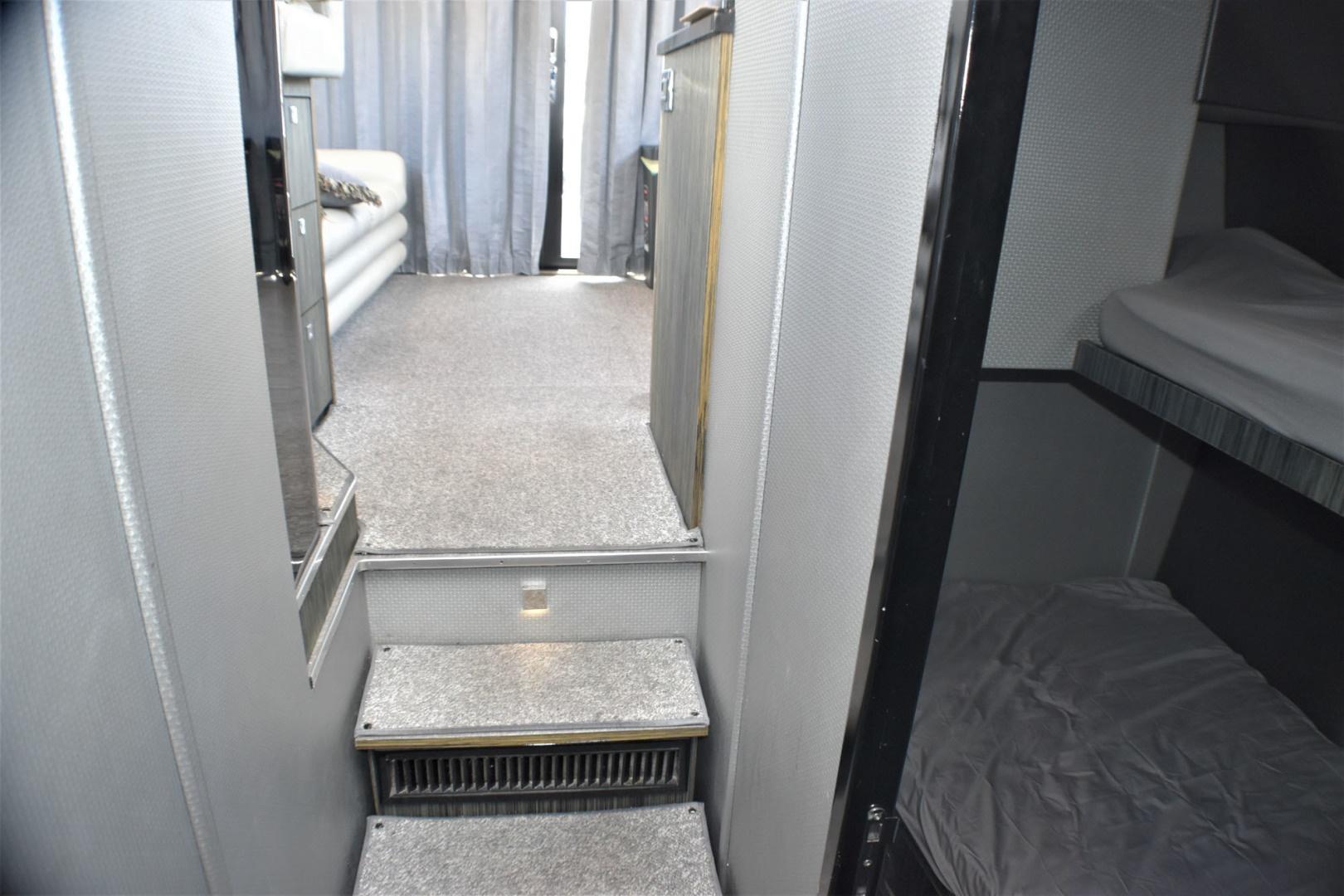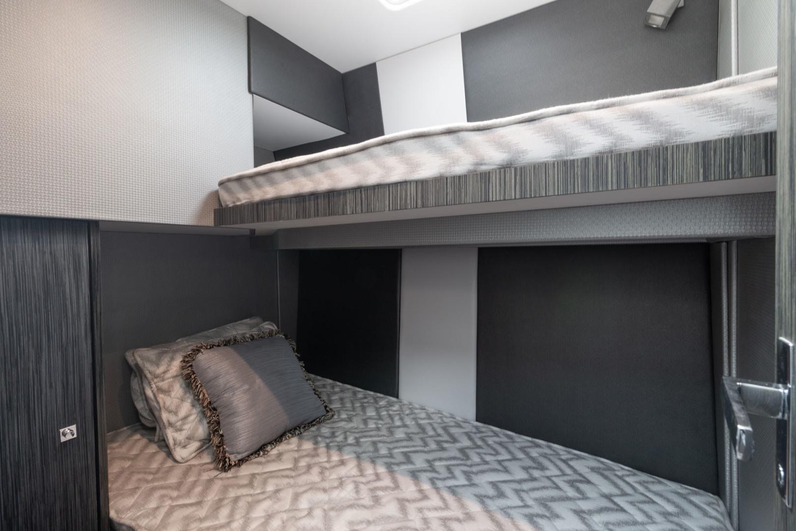 Guest cabin with cozy bunk beds and ample hanging locker space.