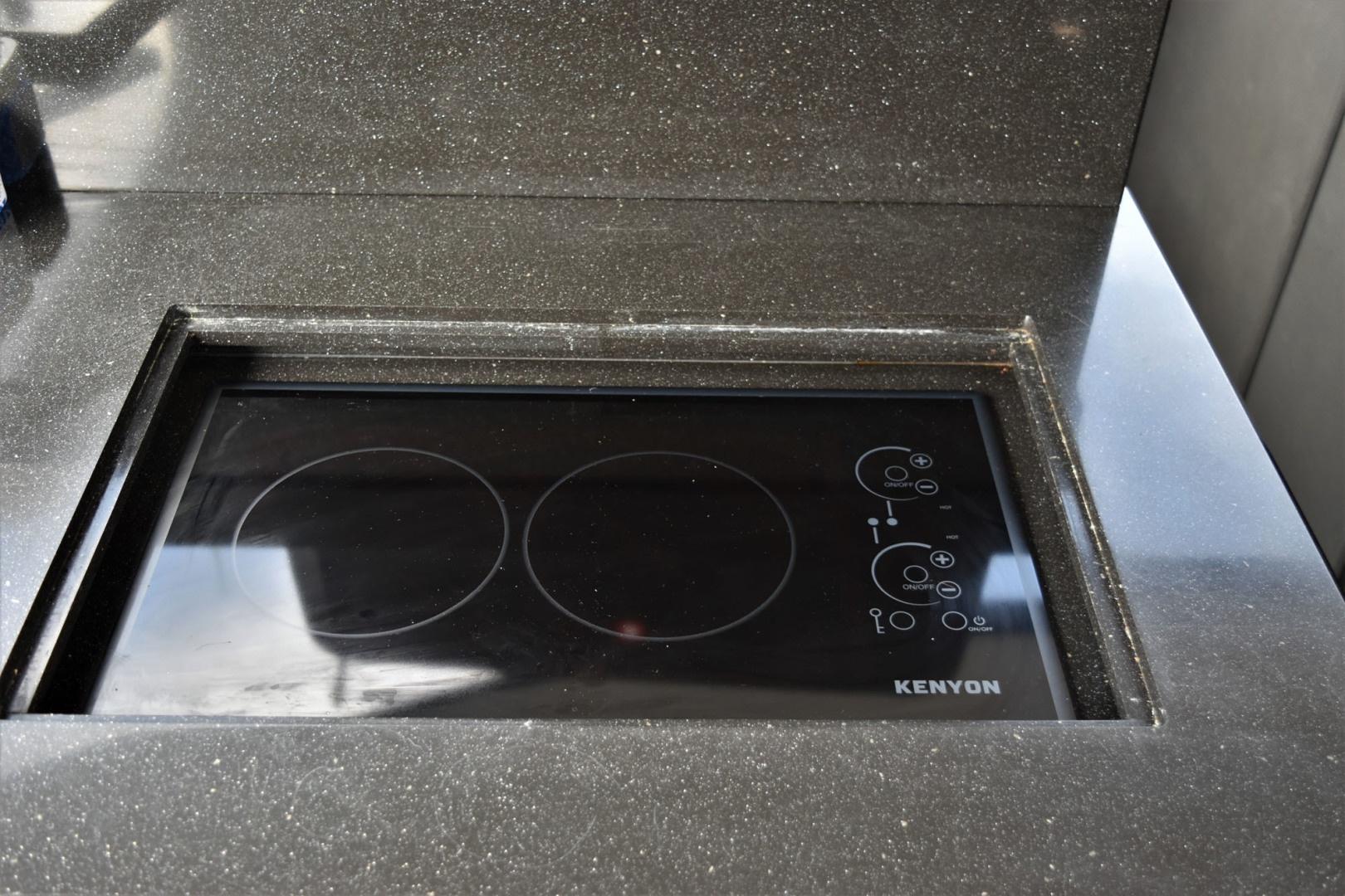 Fully equipped galley with cabinet fridge/freezer doors.