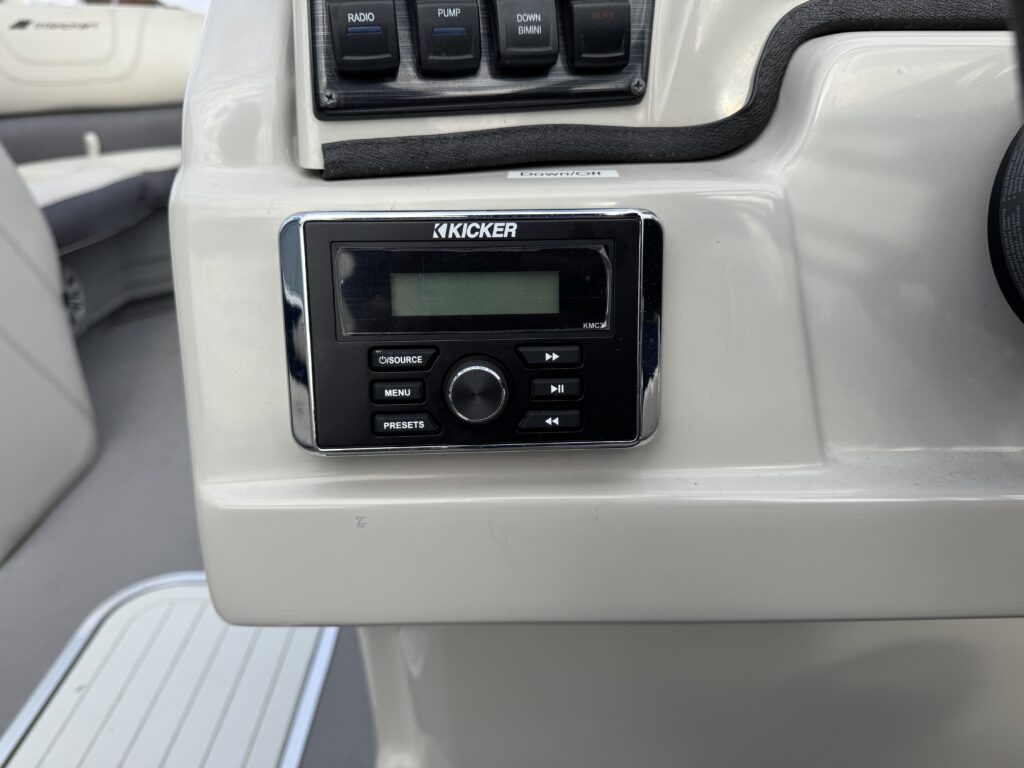 Features include black bimini top and playpen cover, full vinyl flooring in gray, extended deck, GPS, Kicker KMC stereo system with four speakers and radio adapter, mood lights, two high back helm chairs in platinum, changing room, pylon ski tow, stainless steel ladder with wide handles, and more!