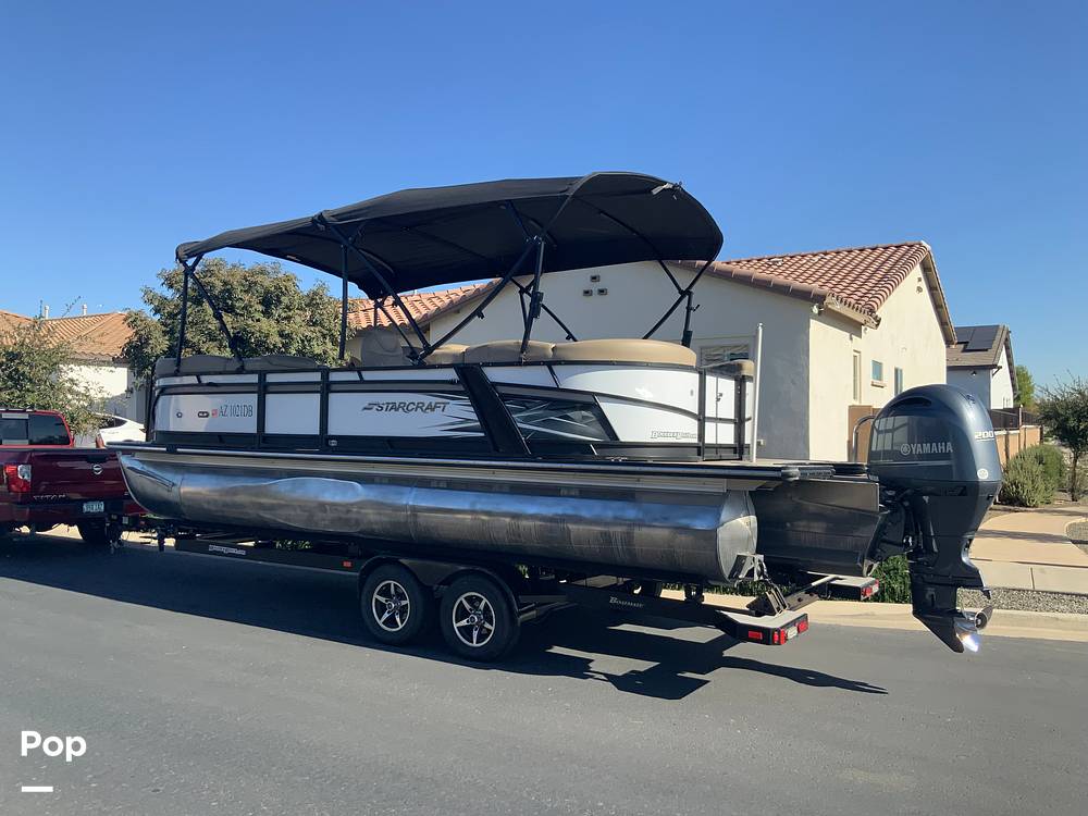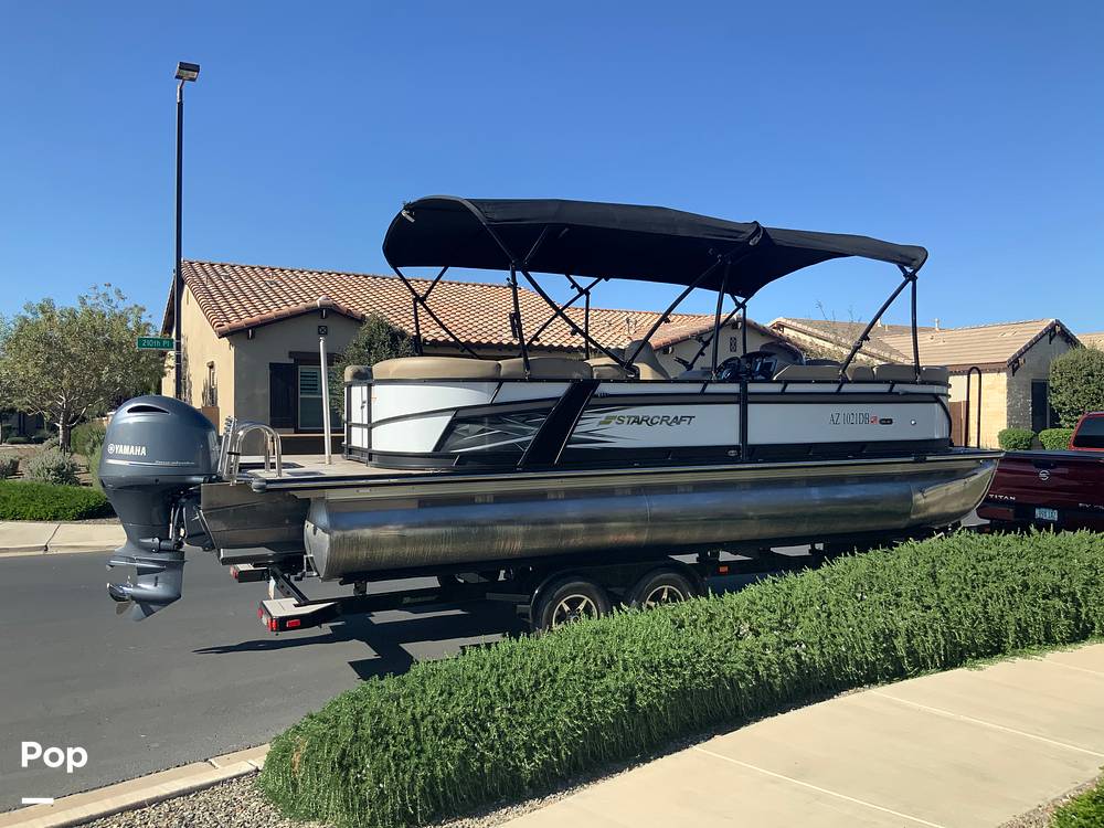 The boat is equipped with a ski tow bar suitable for tubing or watersports activities, along with comfortable wraparound seating and generous deck space for passengers. Aluminum pontoon construction and Starcraft's proven build quality contribute to a clean, functional layout appropriate for recreational use.