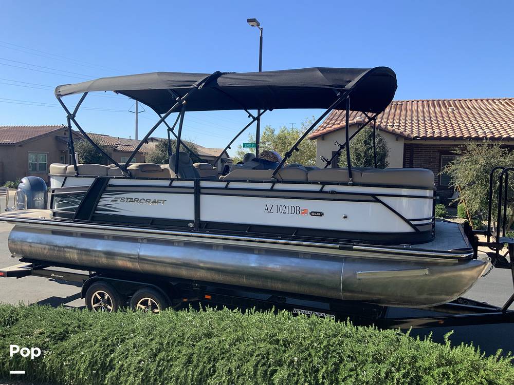 This 2019 Starcraft SL3 pontoon boat is a well-equipped and versatile platform designed for cruising, watersports, and family outings. It features a full Bimini top configuration covering both the front and rear seating areas, providing ample sun protection throughout the cockpit. Power is supplied by a Yamaha 200 HP four-stroke outboard, which the seller reports starts, runs, and performs as expected.