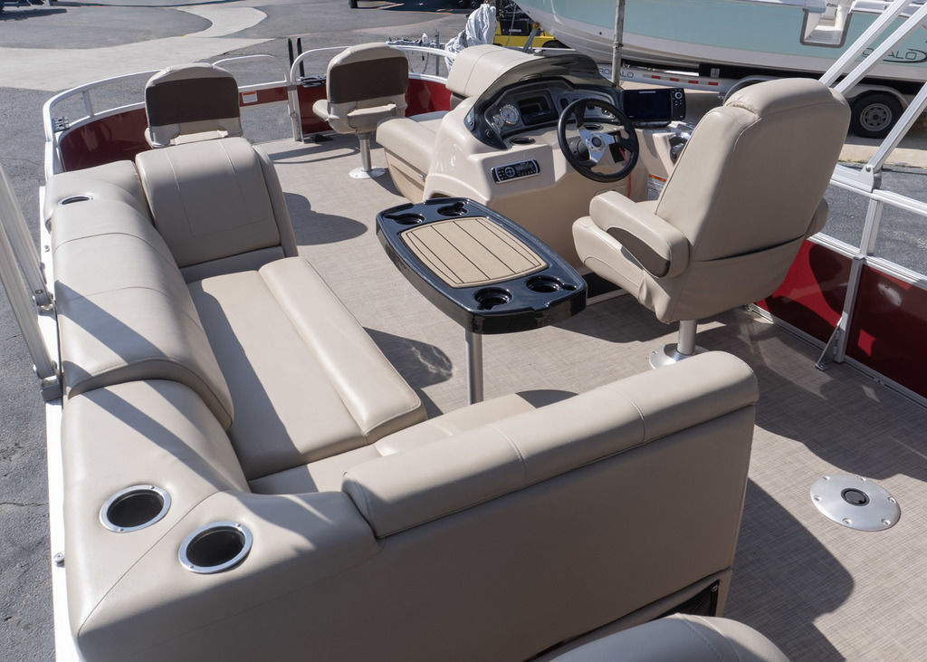 - Aft L-lounge w/underseat storage, movable drink holder, base for removable table, Stow More™ seat-back compartment & pop-up changing curtain