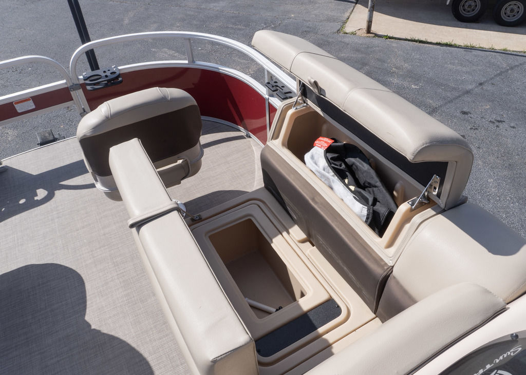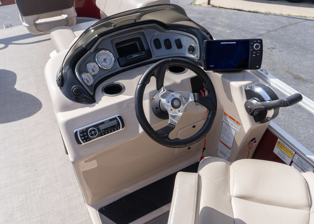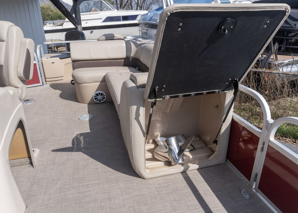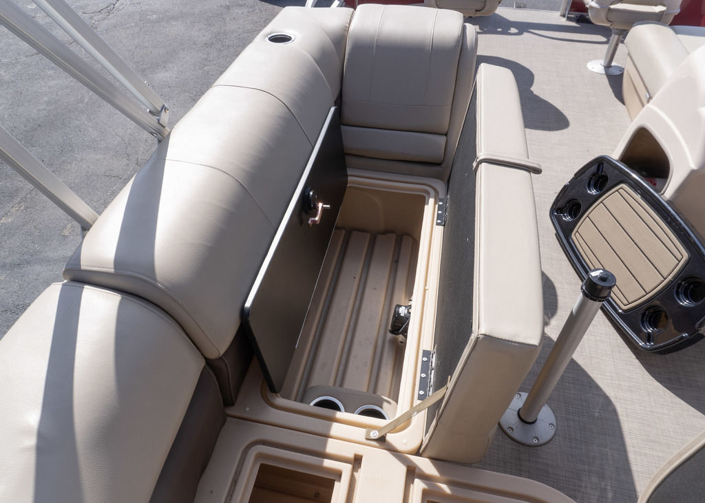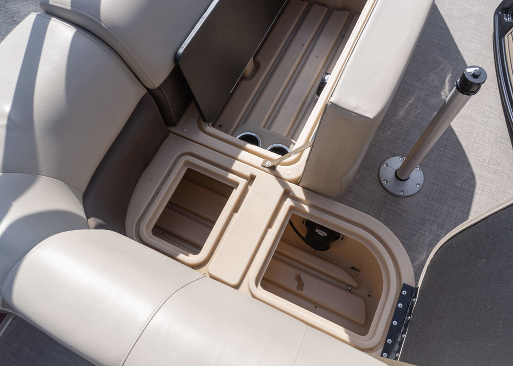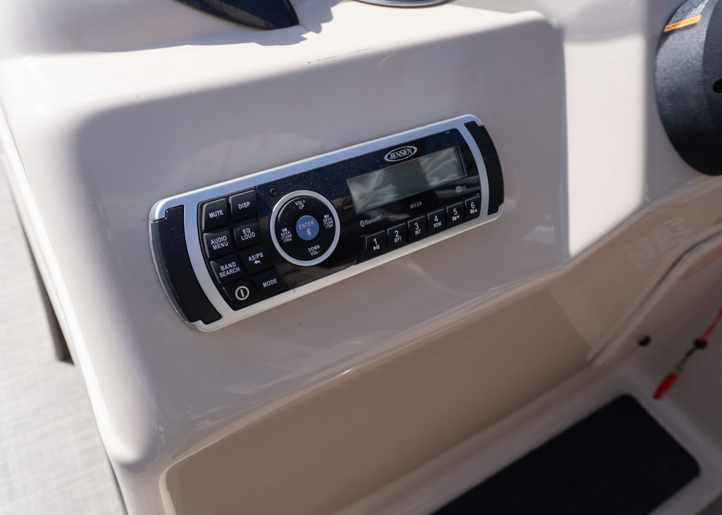 - Console w/cooler storage below, NEW helm chair, stereo w/Bluetooth® & USB input & forward couch w/Stow More™ seat-back compartment & lockable underseat compartment