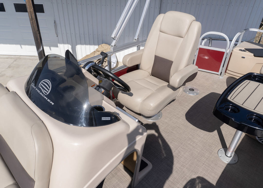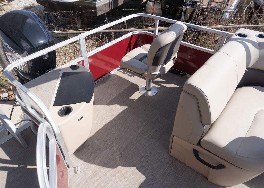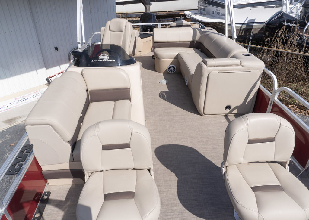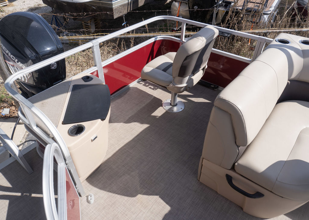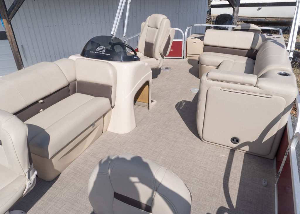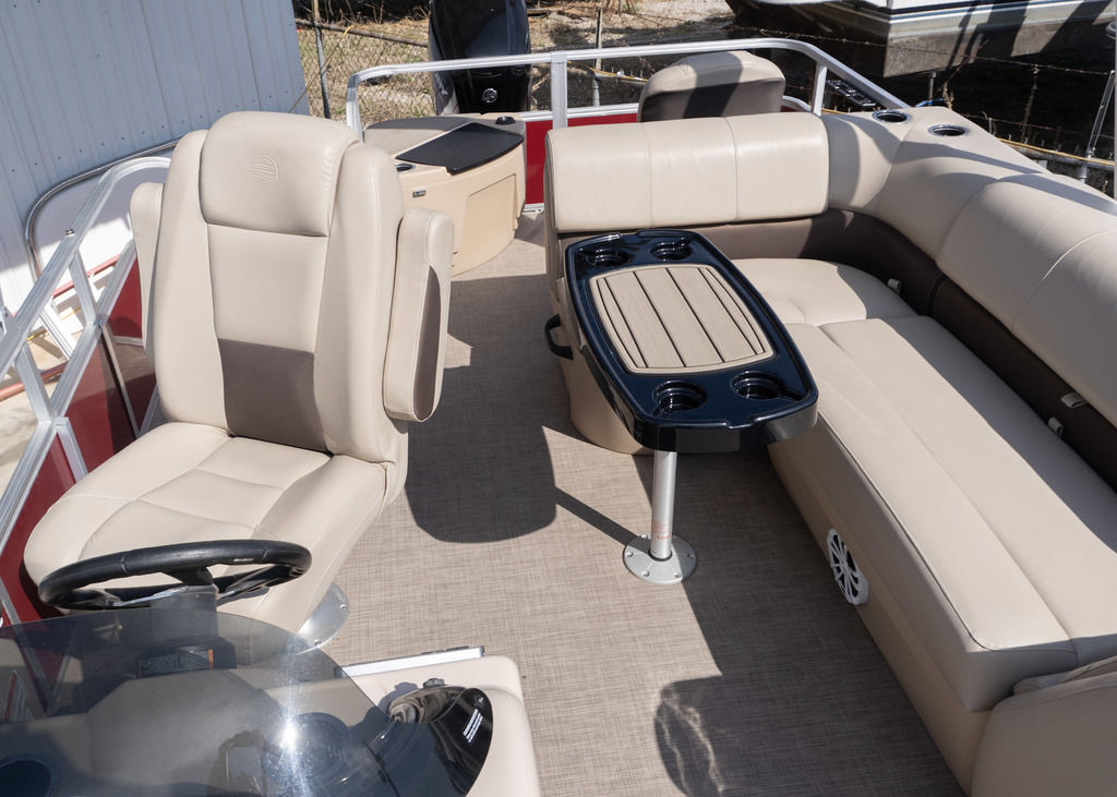 - Console w/cooler storage below, NEW helm chair, stereo w/Bluetooth® & USB input & forward couch w/Stow More™ seat-back compartment & lockable underseat compartment