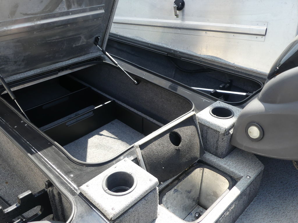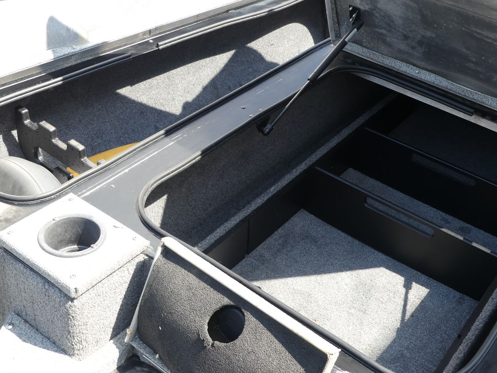 Interior- NEW redesigned, tournament-style 38-sq.-ft. (3.53-sq.-m) elevated bow deck w/oversized dual rod boxes & center tackle organizer