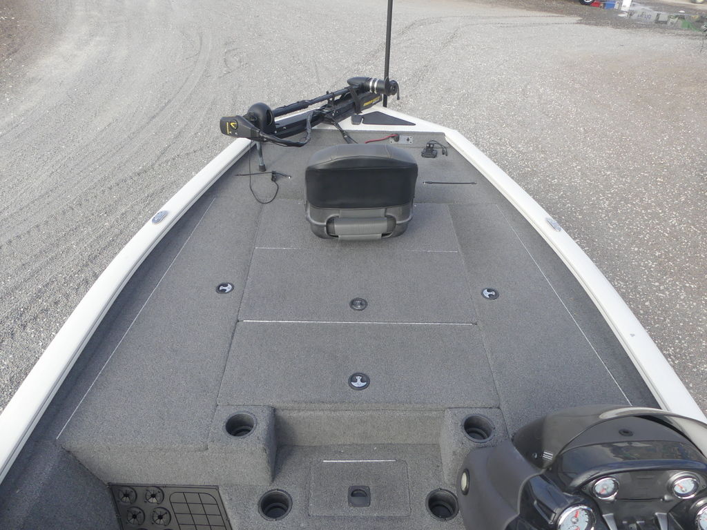 Interior- NEW redesigned, tournament-style 39-sq.-ft. (3.62-sq.-m) elevated bow deck w/oversized dual rod boxes & center tackle organizer