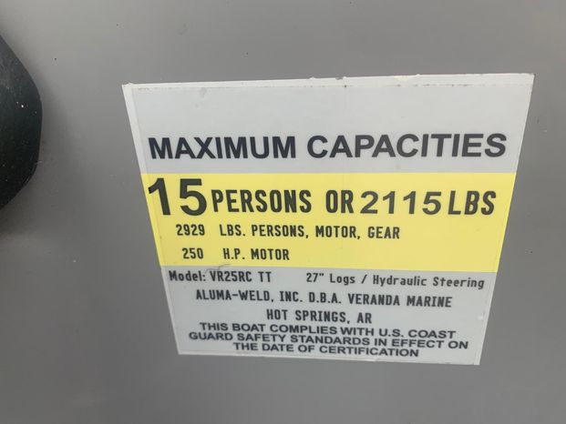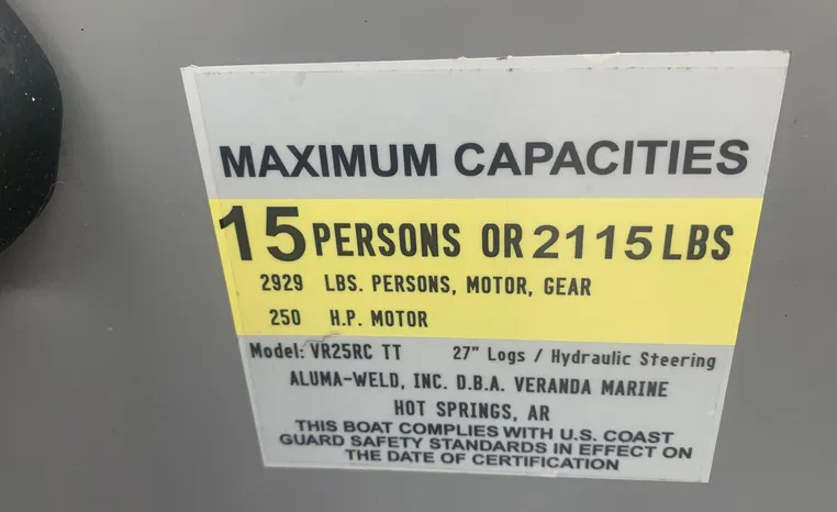 Boat Details ConditionUsed Year2019 Boat MakeVeranda Boat ModelVR25RC Deluxe Hull MaterialAluminum Posted1Day agoMeasurements Boat Length27 ft Beam8.5 ft Max # Passengers15Propulsion Propulsion TypeOutboard - 4 Stroke Engine MakeYamaha Engine ModelVF 175 LA Engine Year2018 Number of Engines1 Horsepower175 Engine Hours200 Fuel TypeGas
