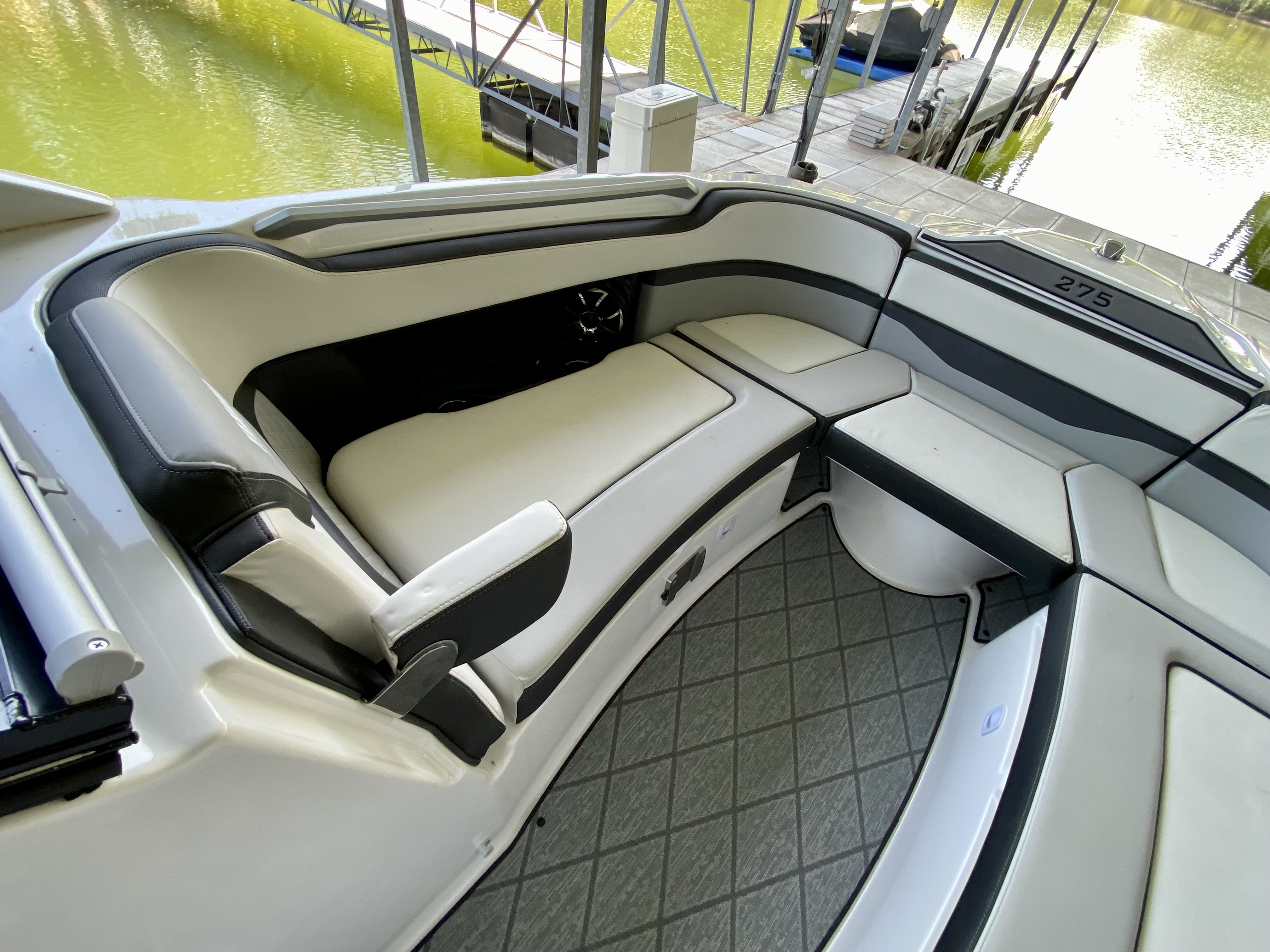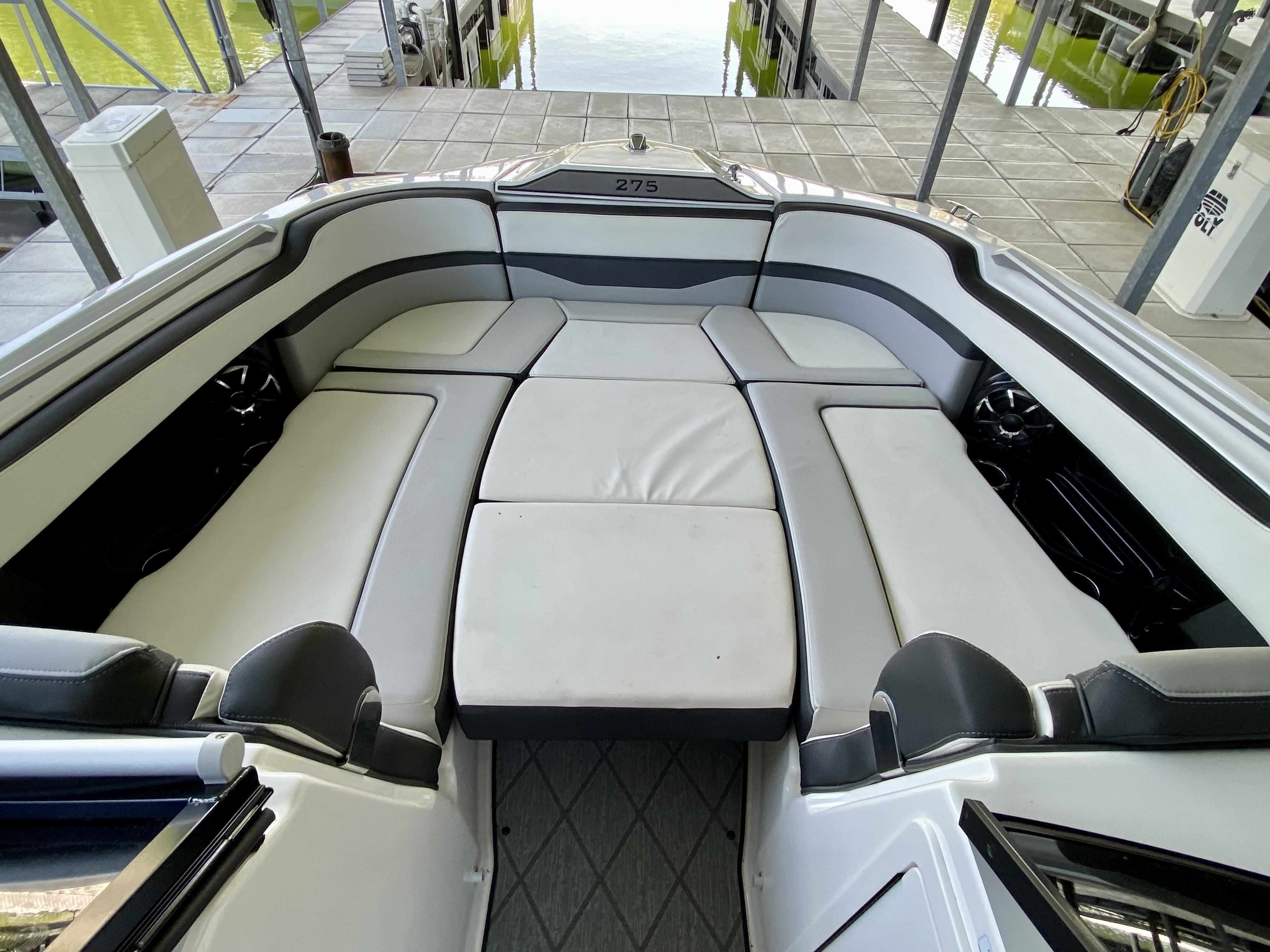 might see moored in Monaco and Cannes.The driver-forward position and bold wrap-around window treatment add to the 275’s sophisticated allure, and the expansive stern play area and open walkthrough transom give the impression that a party could go off at a moment’s notice.