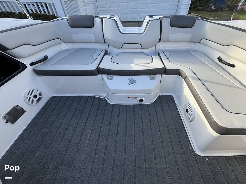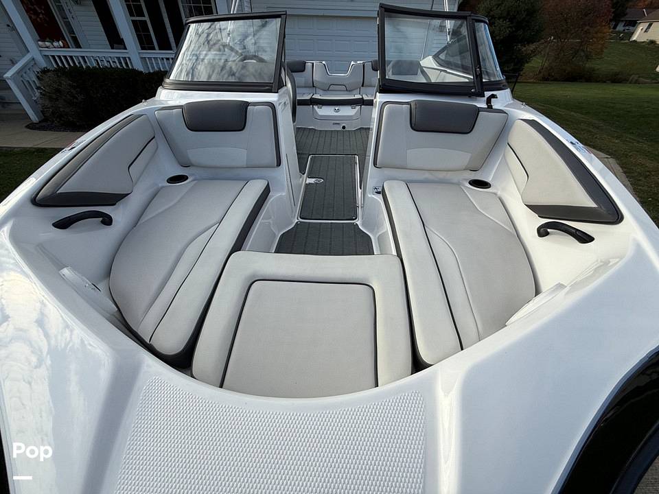 The SX190 can plane in just 3.3 seconds and hits 30 MPH in 6.8 seconds, with a top speed of 43.2 MPH. Inside, the SX190 comfortably seats up to eight passengers in a U-shaped cockpit lounge that maximizes space and comfort. The helm and companion seats feature bucket-style designs with flip-up bolsters, and a Bimini top provides shade for sunny days. Practical features include an anchor locker, in-floor ski and wakeboard storage, and a wet storage compartment at the transom for convenience.