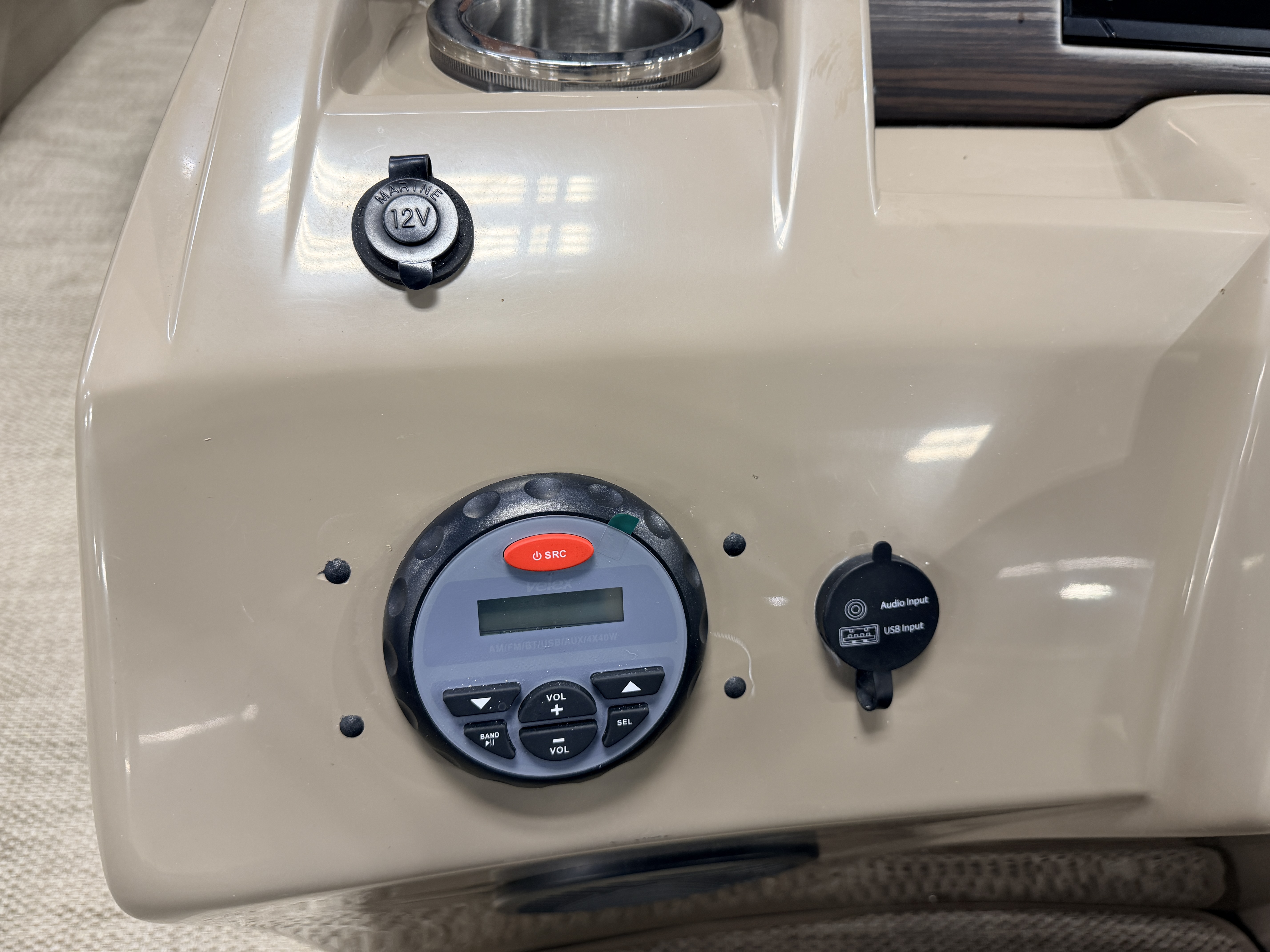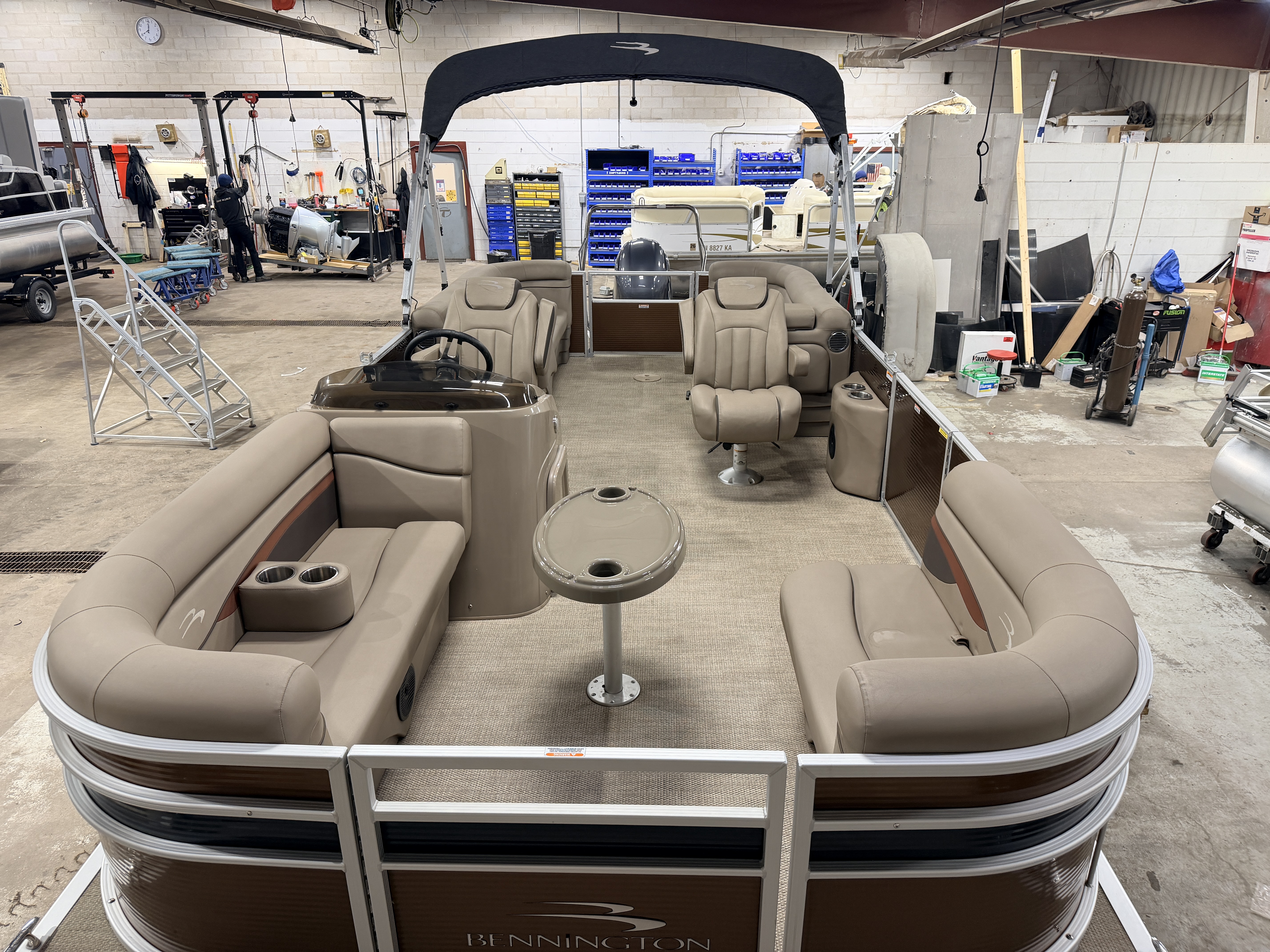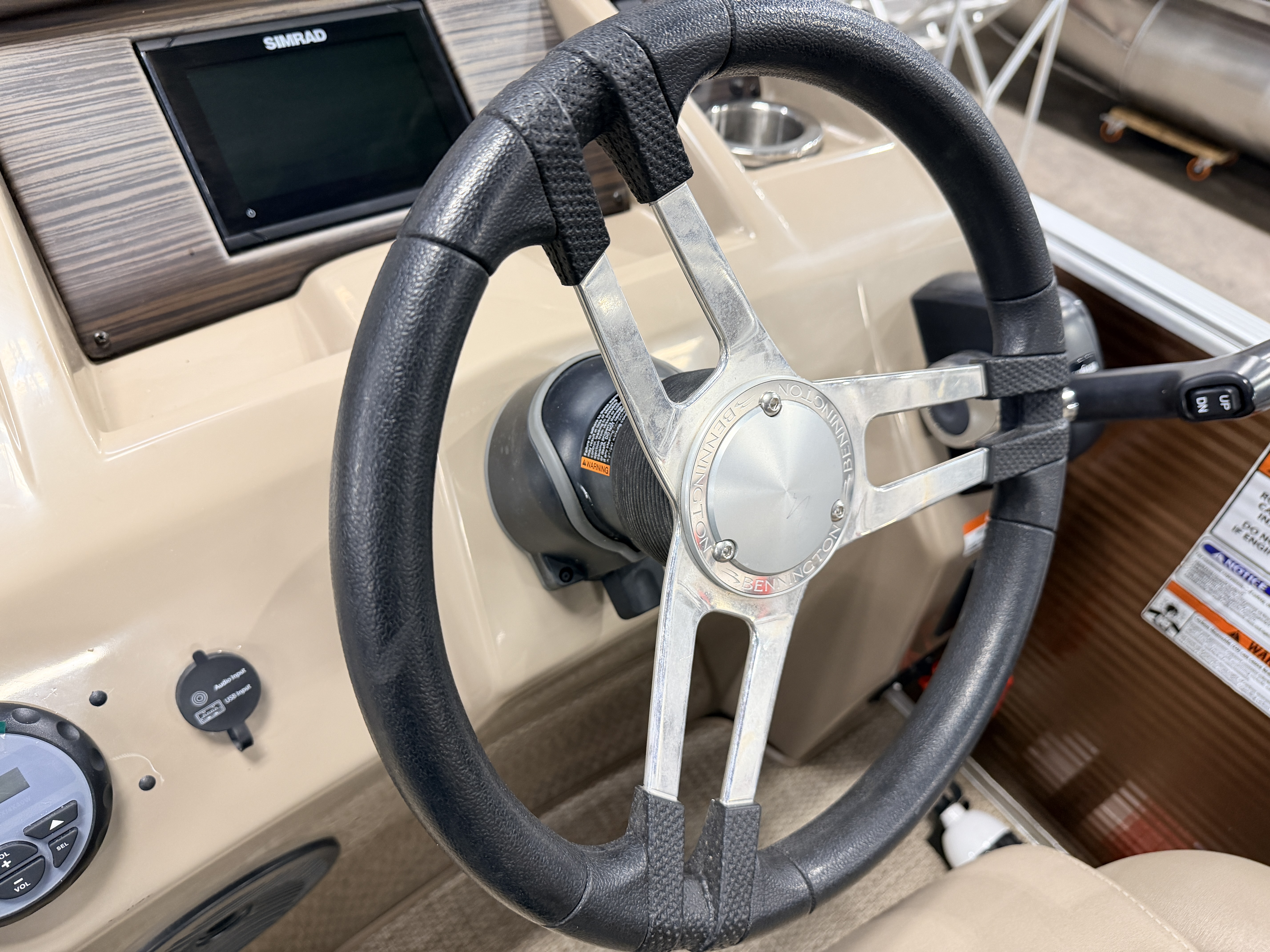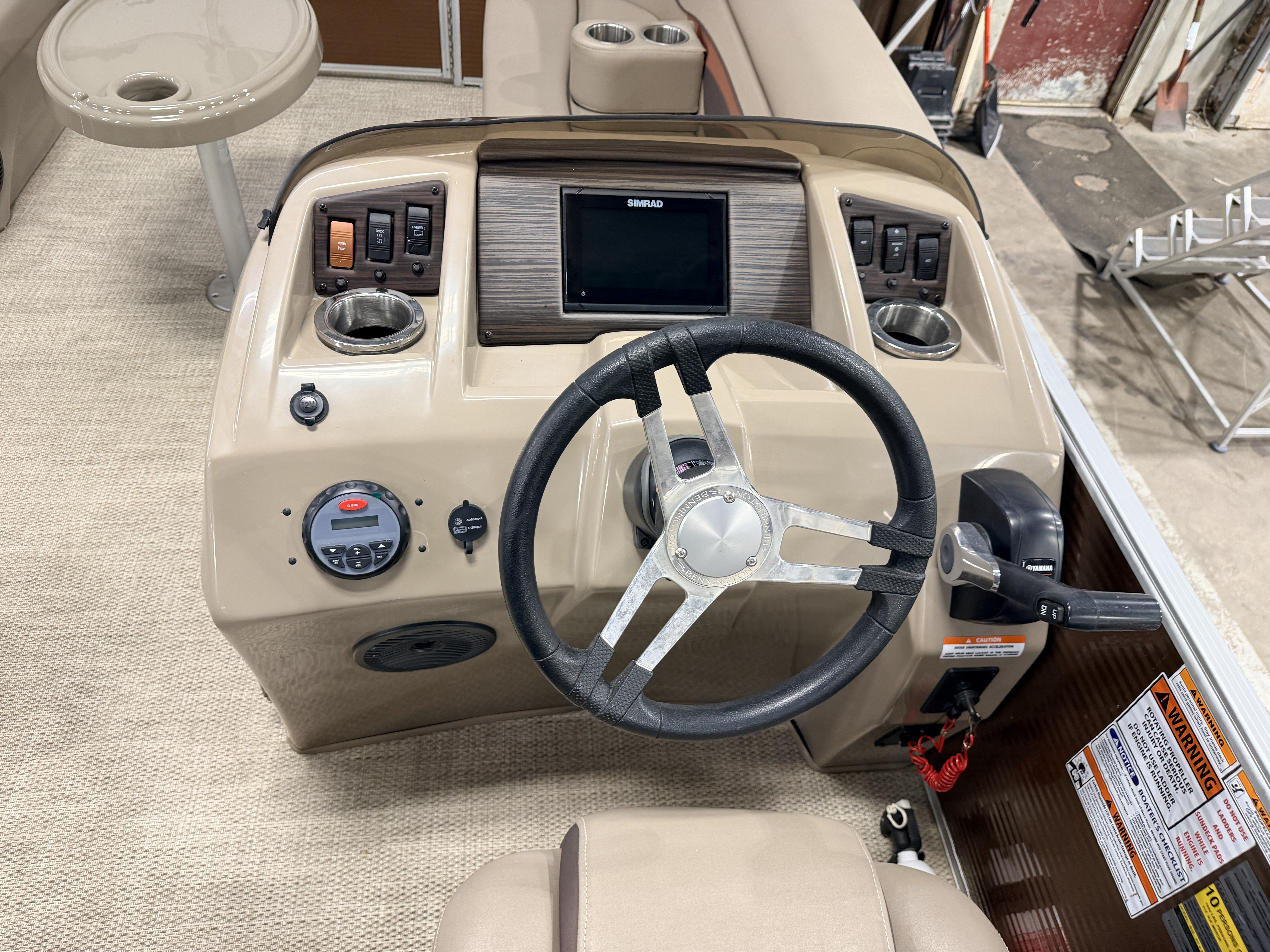 2020 Bennington 22 SSR Quad Lounge Pontoon with 115HP Yamaha Fourstroke EFI Outboard. This quad lounge layout pontoon features great seating options with 4 lounge style couches and 2 side-by-side captain's chairs. There is a large swim platform up front and another in the rear. There is a fold down swim ladder on the stern swim platform. There is a table mounted between the front 2 couches. The helm features a Simrad screen which can show engine gauges and also acts as a GPS chart plotter/depth finder. There is a Velex Bluetooth audio stereo system with additional USB and auxiliary inputs. The steering wheel features a tilt function. The captain's chair is a high back sport seat with swivel, slide and recline functions as well as fold up arm rests. The second captain's chair has a mini console on the side with dual cup holders and a stereo speaker. The unit has a built-in ski/tow bar, bimini top, stainless steel cleats and 2 movable cup holders which can be placed anywhere on any of the couches.