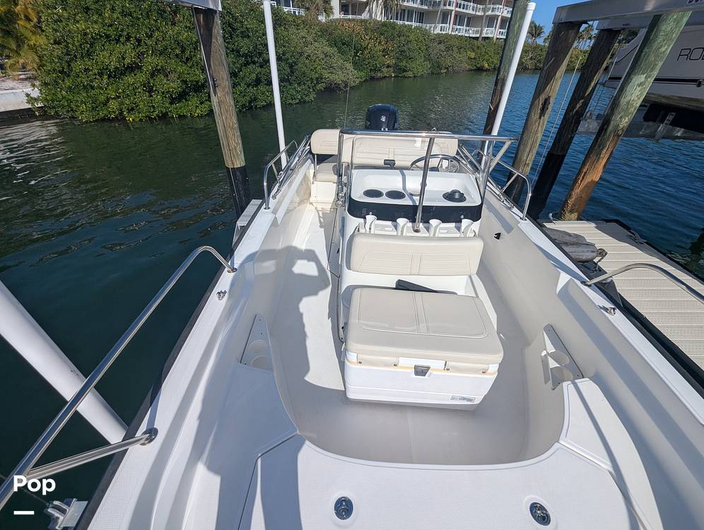The boat comes with a factory-installed fishing package that includes rod holders, a large live well, and an oversized fish box under the seat. There is a cooler in front of the console, and a rear seat converts to a lounger.